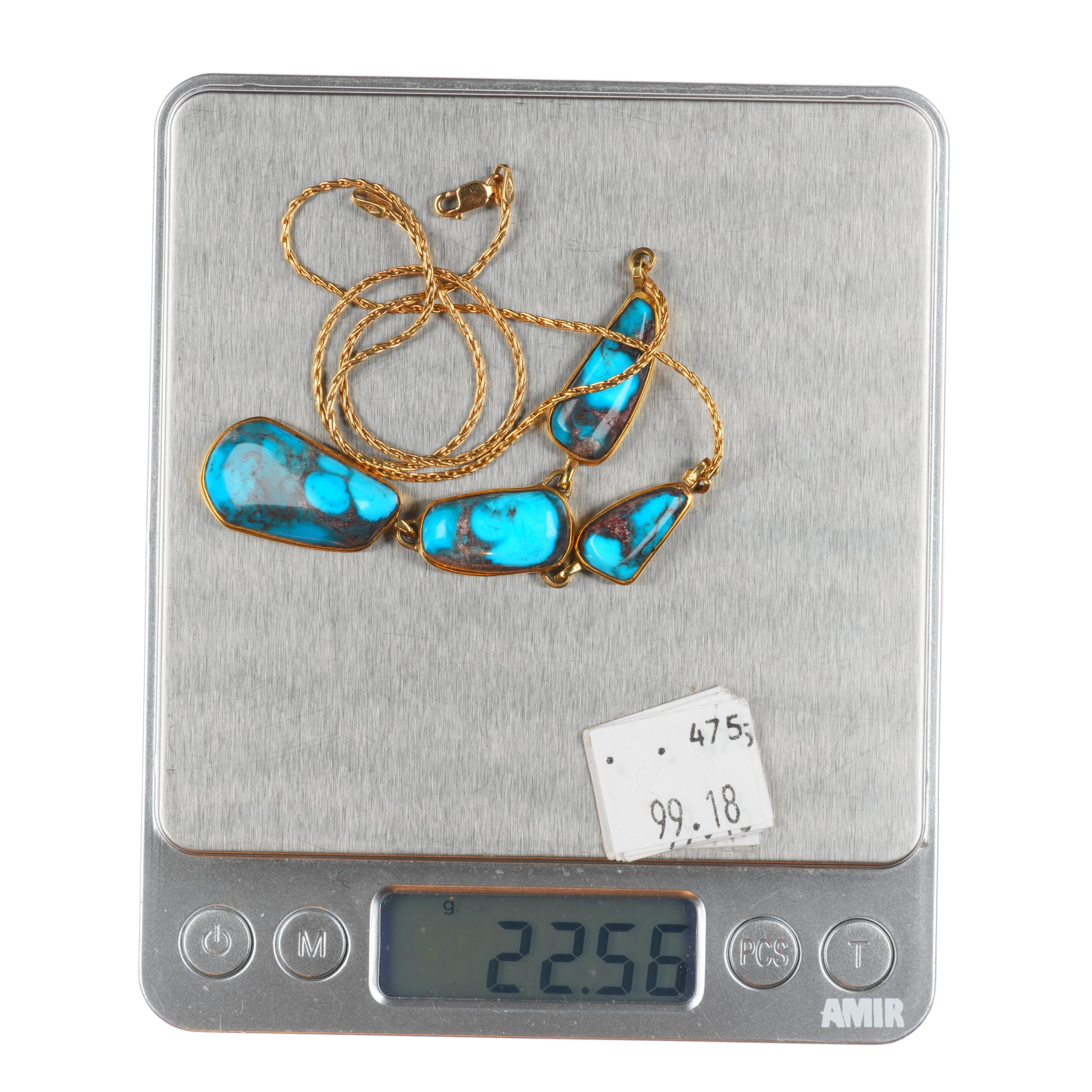 Sam Patania modernist 18k gold, high grade Bisbee turquoise necklace. Circa late 20th to early 21st century, tested and guaranteed solid 18k gold. No apparent issues. 18.5" long necklace, other measurements in pictures. A set like this would retail for around 15k directly from Sam Patania or another high end gallery that represents him.