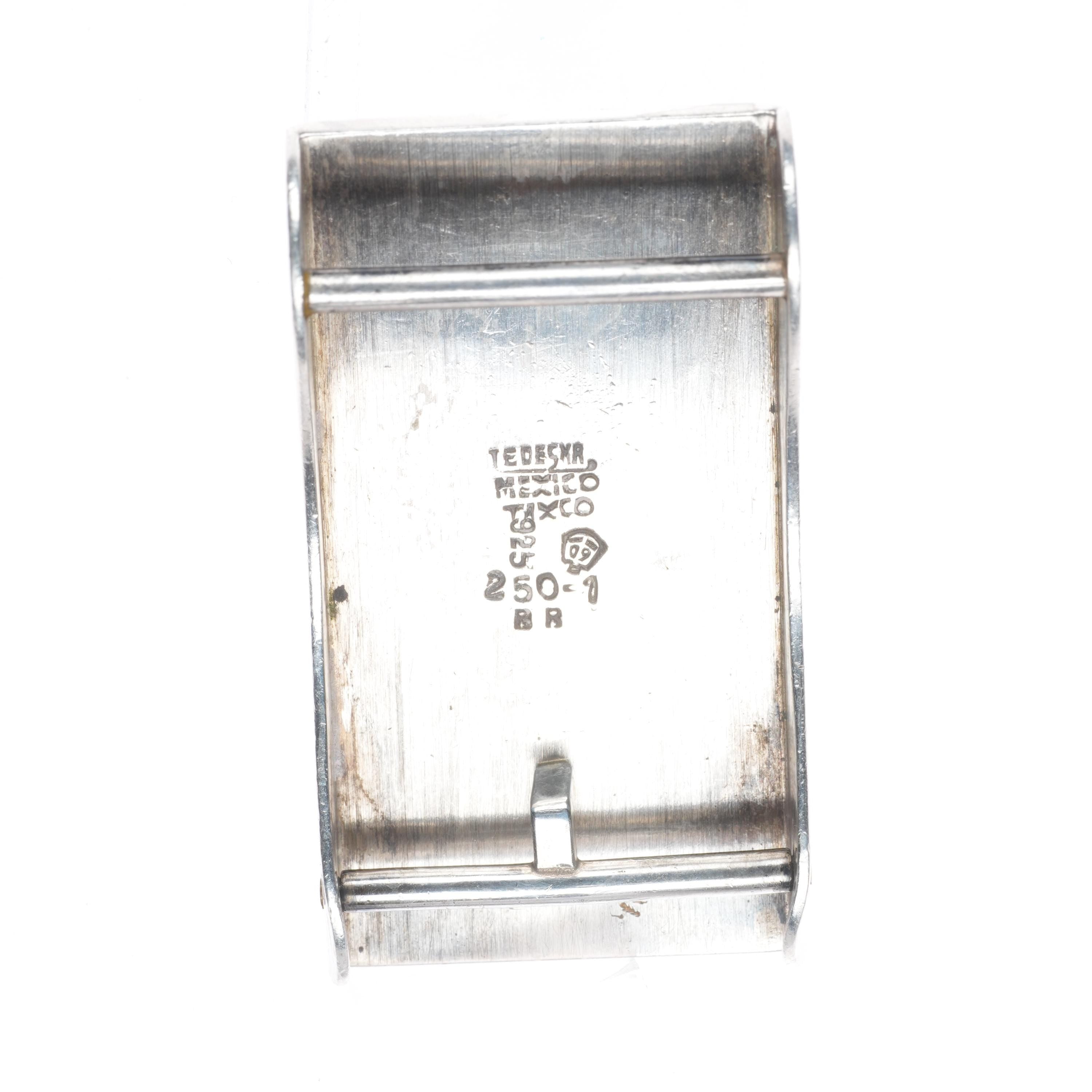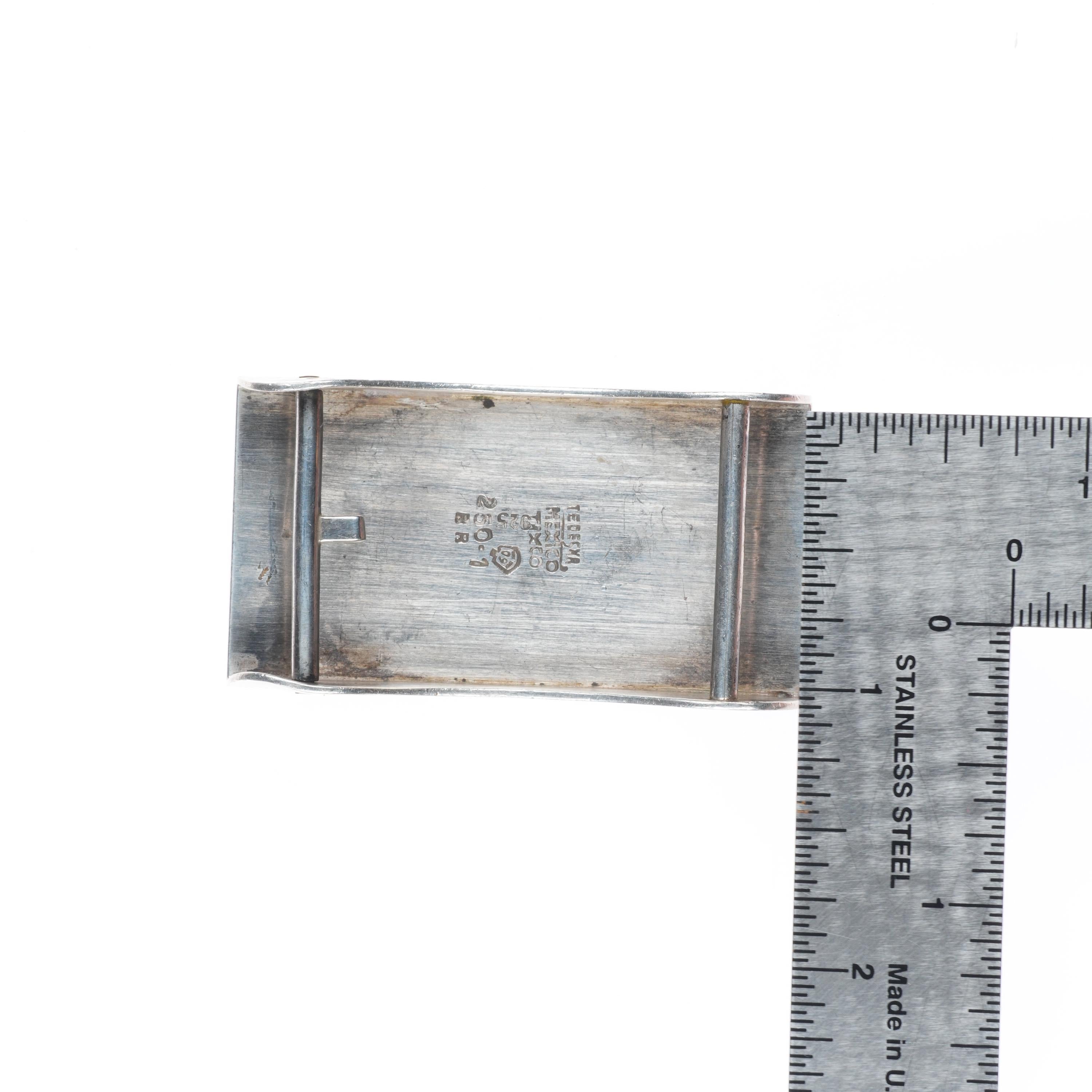 small Enrique Ledesma Taxco Modernist blue tiger‘s eye belt buckle #1. Tested and guaranteed solid sterling silver with, weight and measurements in pictures with some expected wear, fully functional. Fits up to a 1" belt. Way better than pics suggest due to reflections and time limitations.