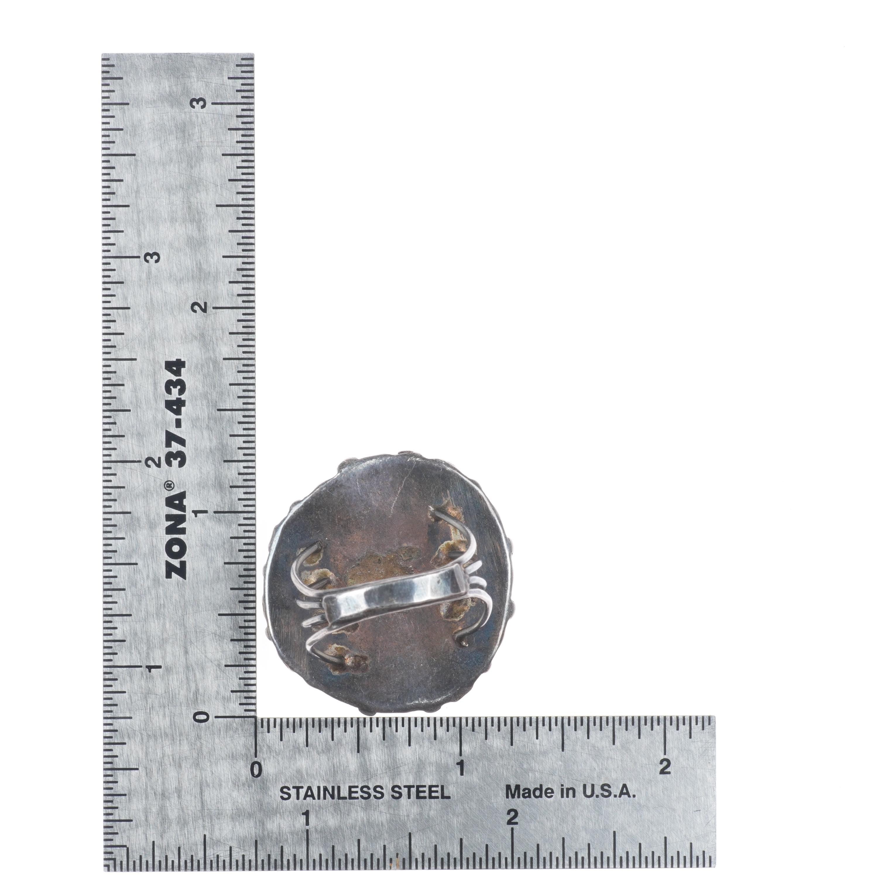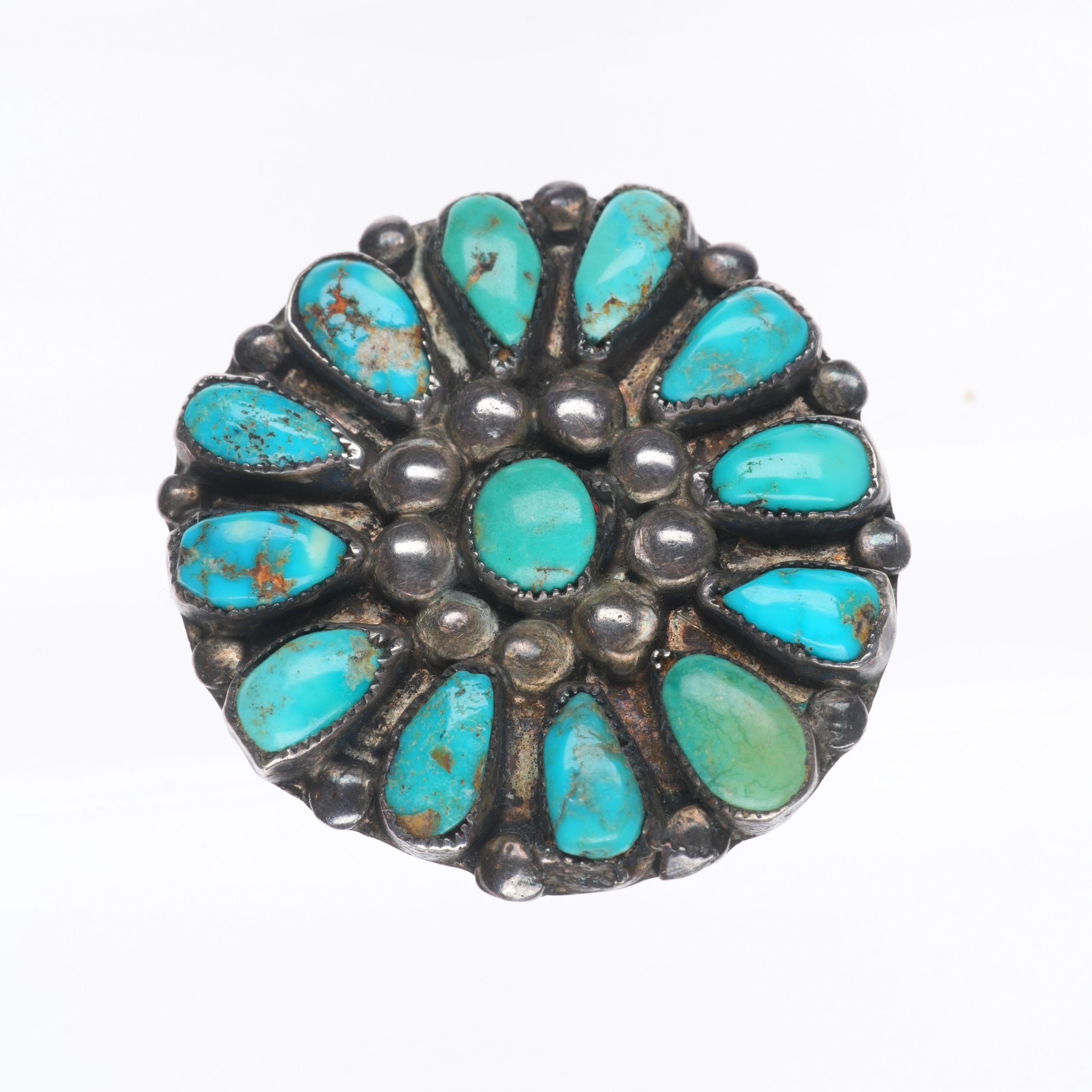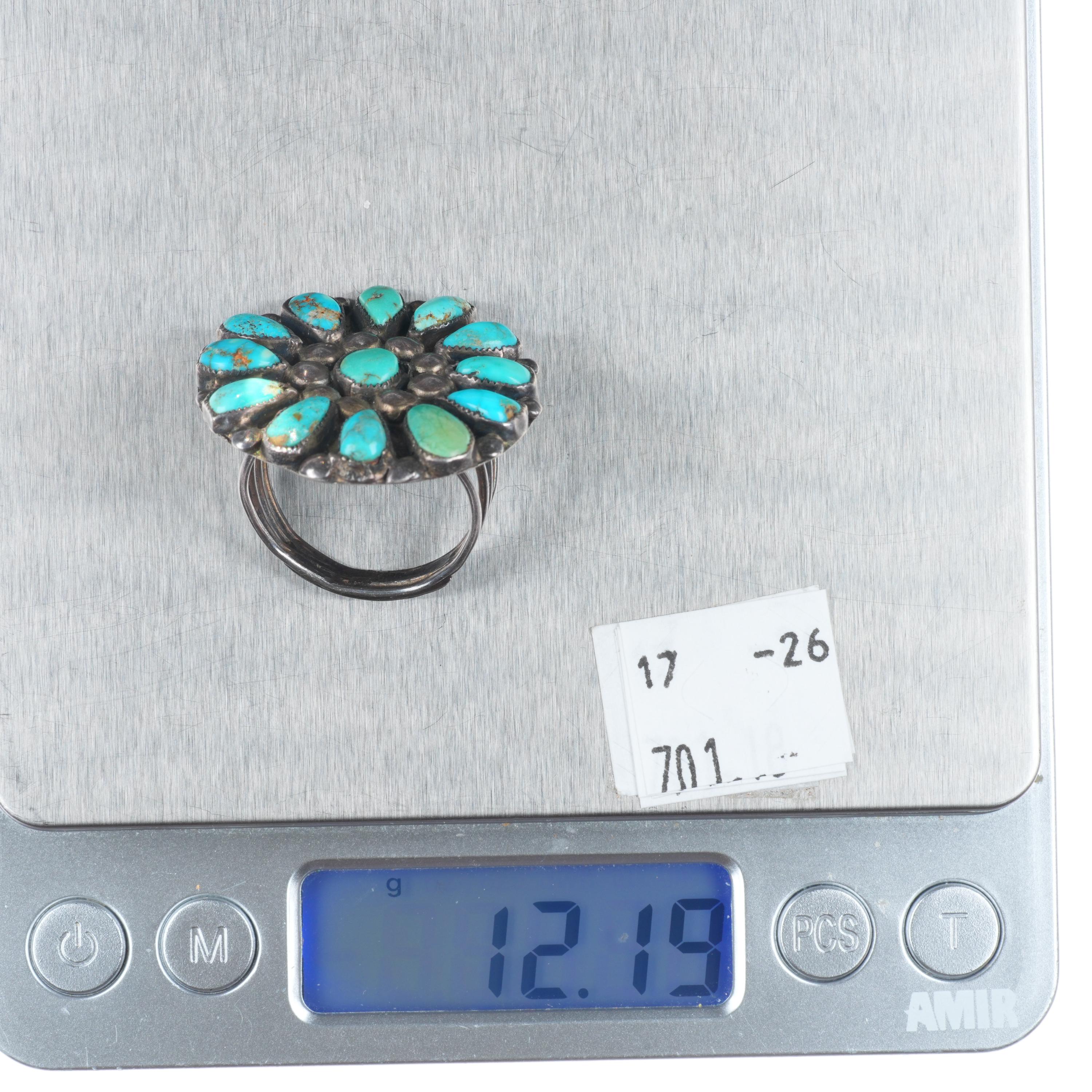 sz11 c1930 Big vintage Zuni high grade turquoise cluster sterling silver ring. Tested and guaranteed solid sterling silver, circa early second quarter of the 20th century. Some expected wear, weight and measurements in pictures.