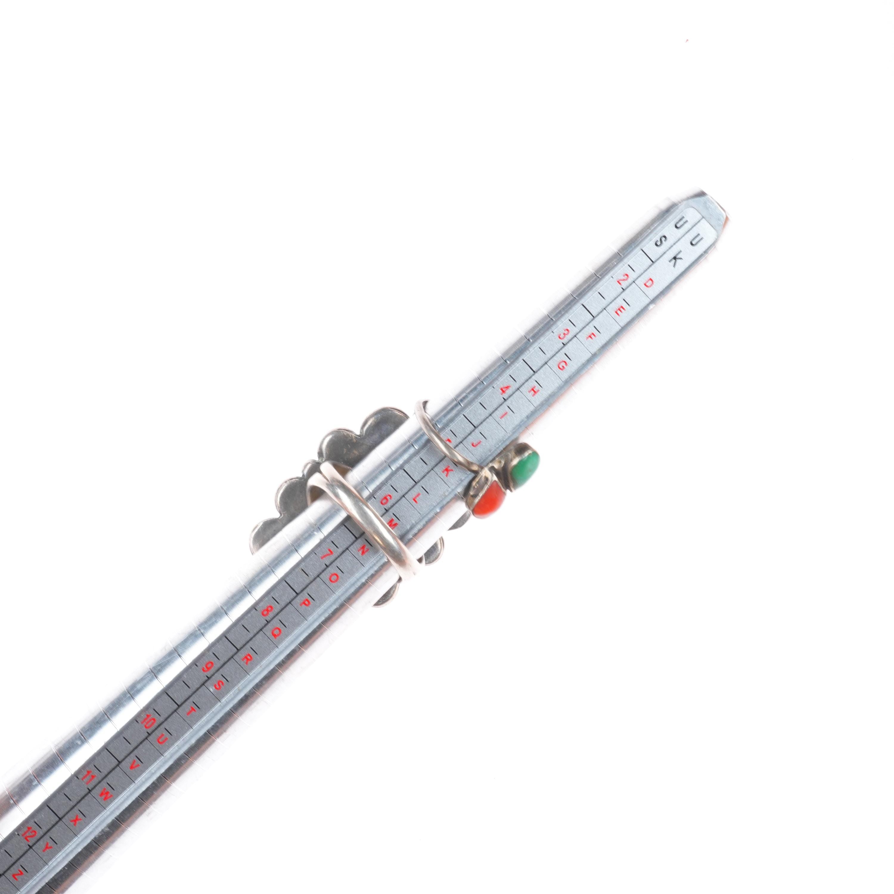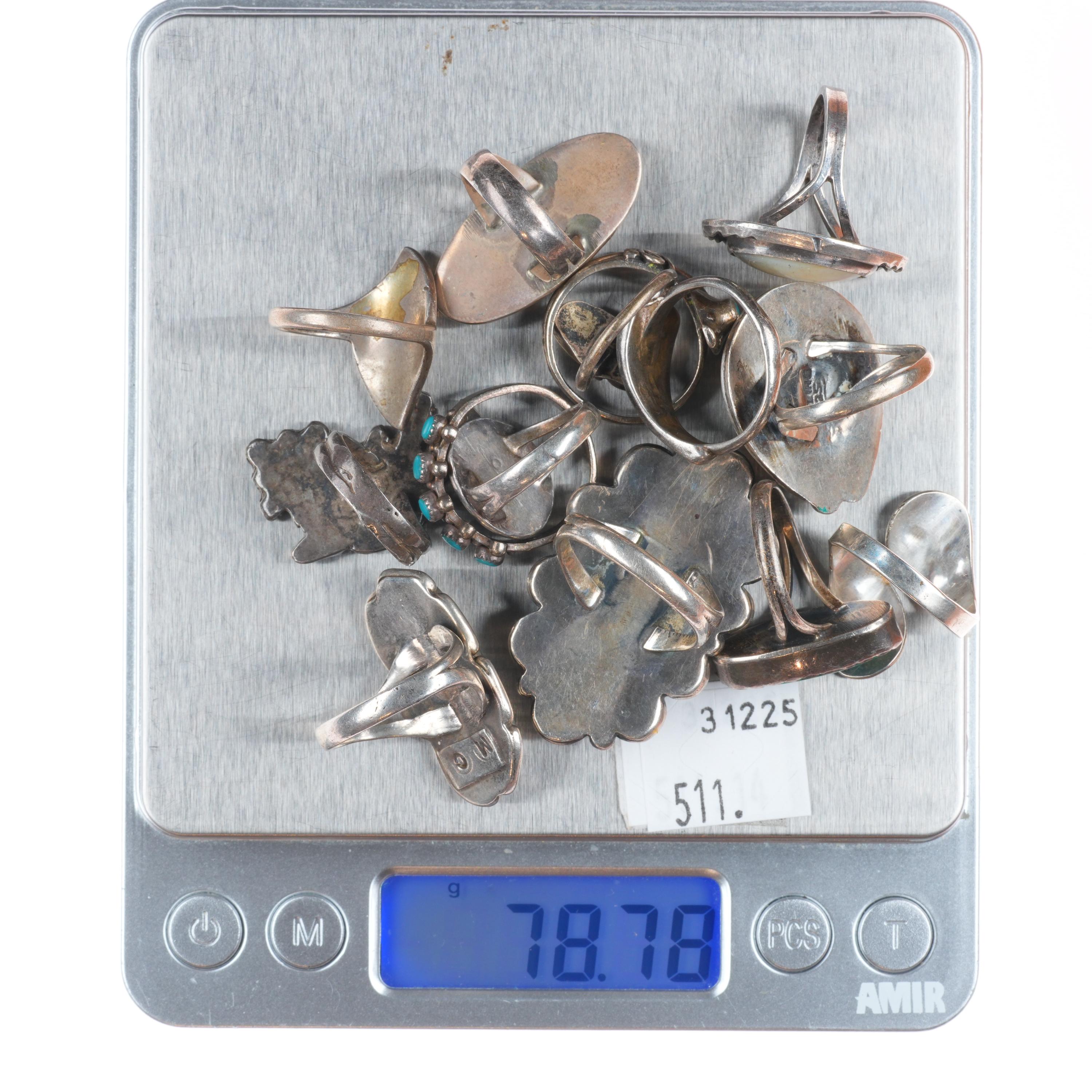 Selling the 14 rings shown with weight and measurements in pictures, shown on sizers. Age appropriate wear. Some marked, some not marked. We are making lots of these lots with my wife photographing and me listing. We are listing in lots due to time limitations, so we are not heavily scrutinizing each ring. Most are going to be Native American made, but there will likely be some southwestern style rings mixed in each lot. Or one two totally unrelated but still sterling. My wife who is making the lots doesn‘t know the difference. Please look at the pictures and make up your own mind for condition, etc. There may be dents, cracked stones, etc. I tried to weed out any junk before I gave them to her, but we are in a hurry. Time is the number one consideration when making these lots so there will be some surprises, hopefully more good than bad :)