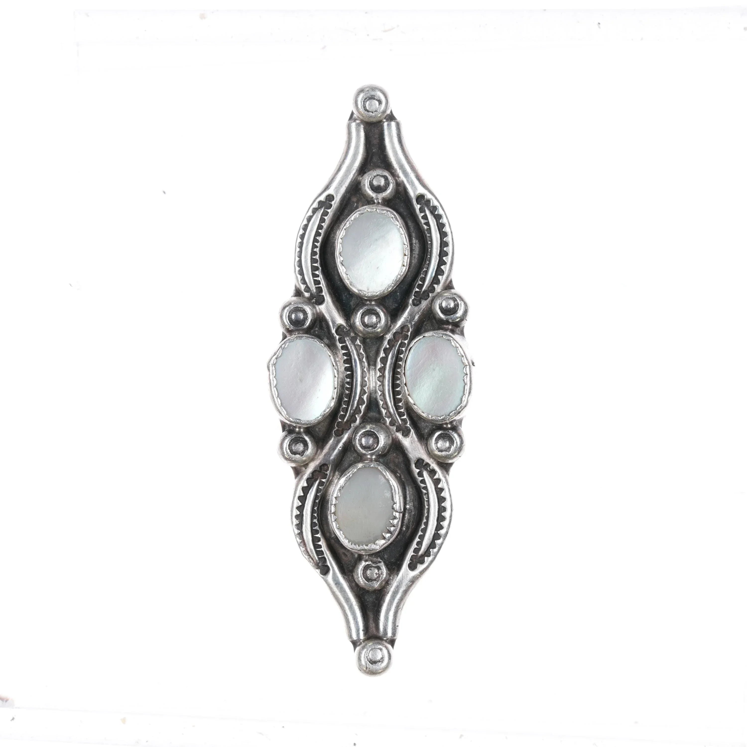 sz7.5 Native American sterling silver mother of pearl cluster long ring. Weight and measurements in pictures. Solid sterling silver with no apparent markings. Very well made vintage ring from the third quarter of the 20th century.