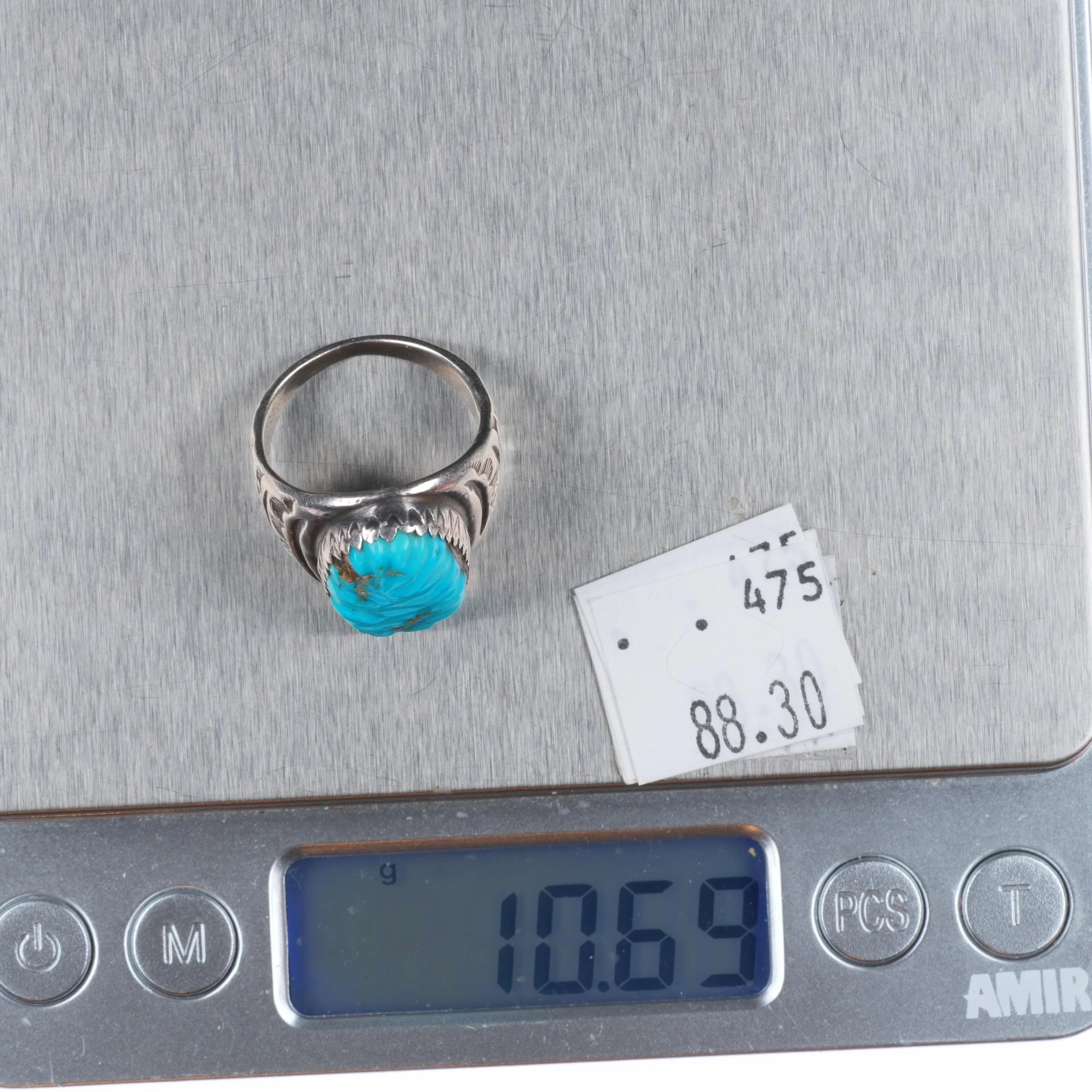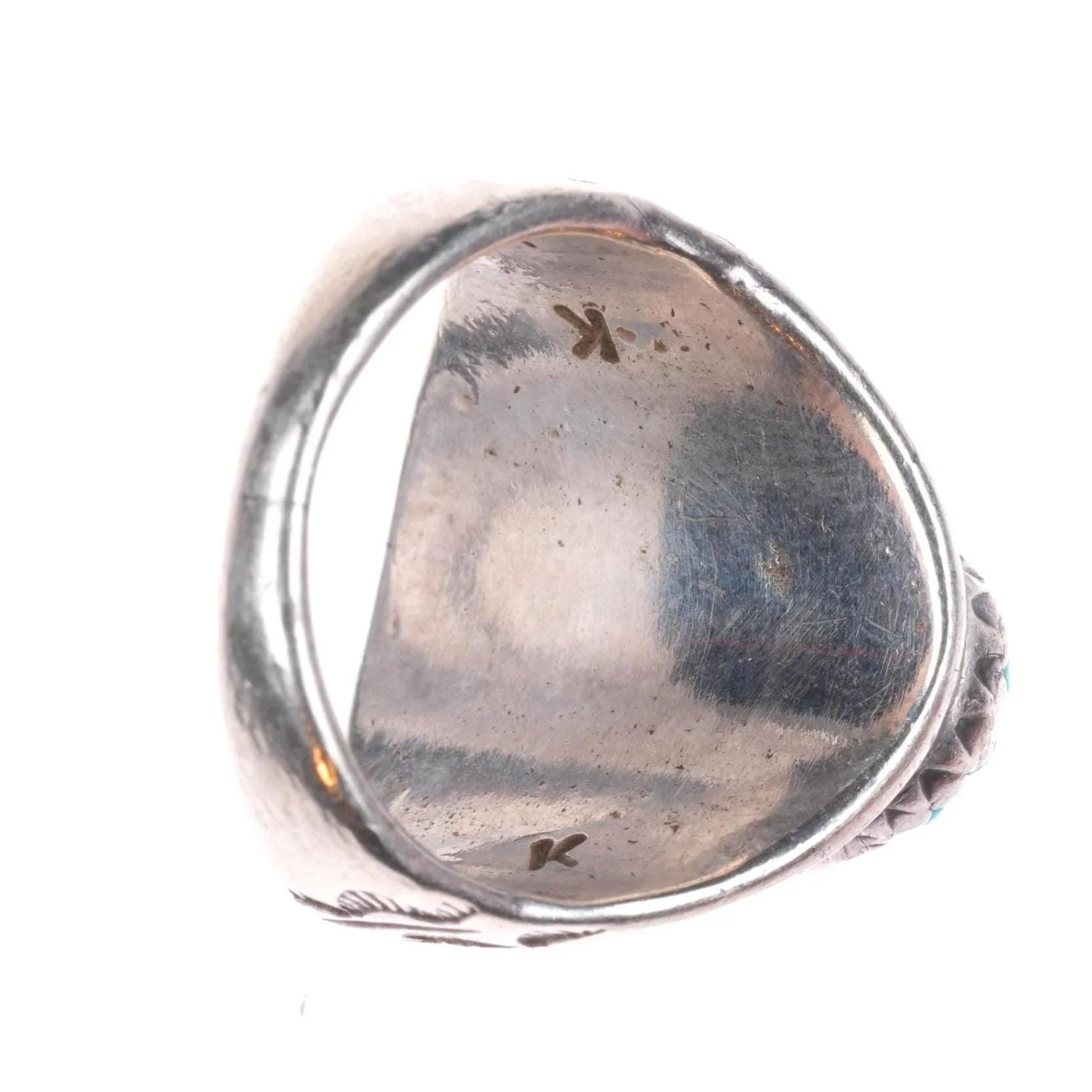 sz7.5 Vintage K Zuni sterling silver hand stamped carved turquoise ring. Tested and guaranteed solid sterling silver with weight and measurements in pictures. Nice ring from the third quarter of the 20th century.