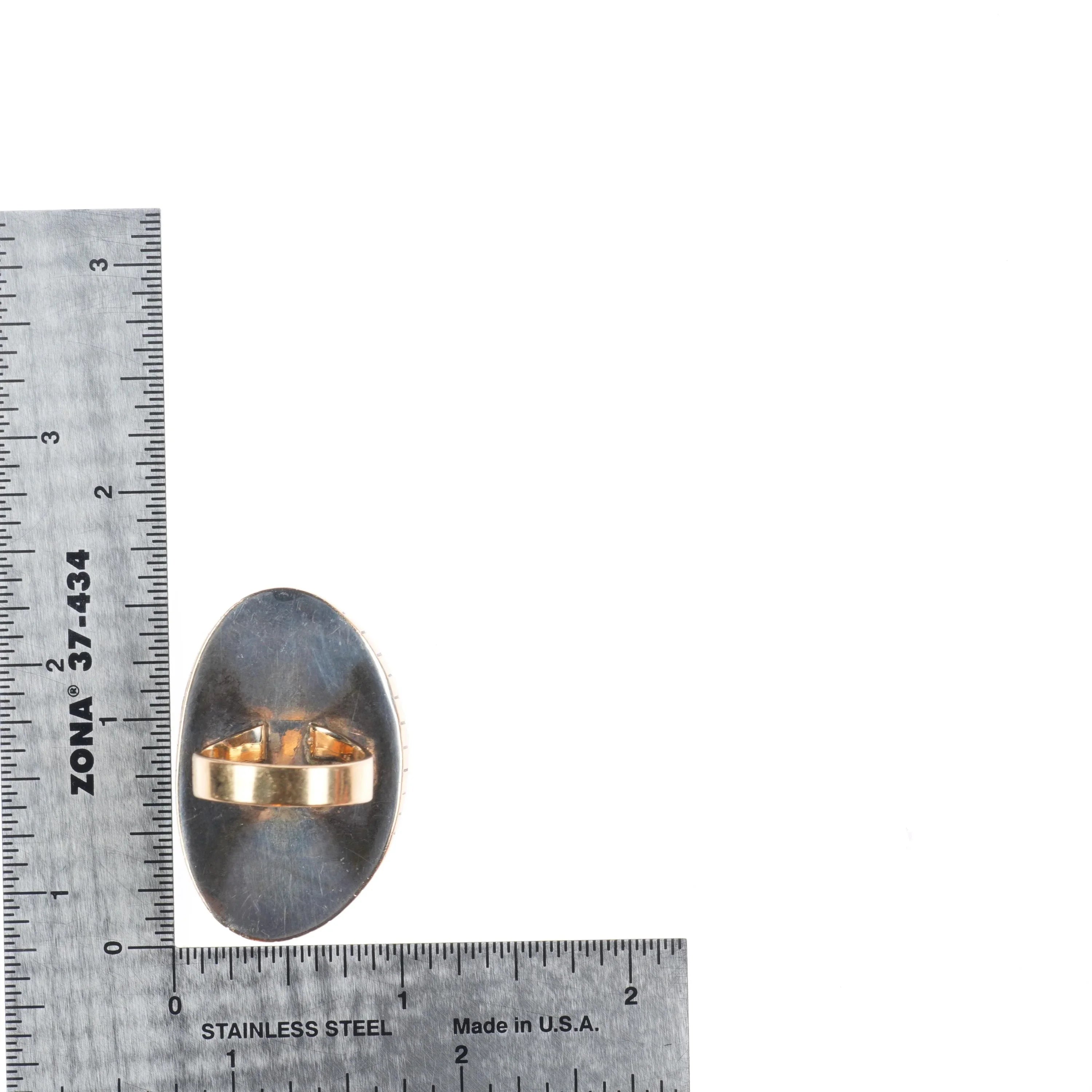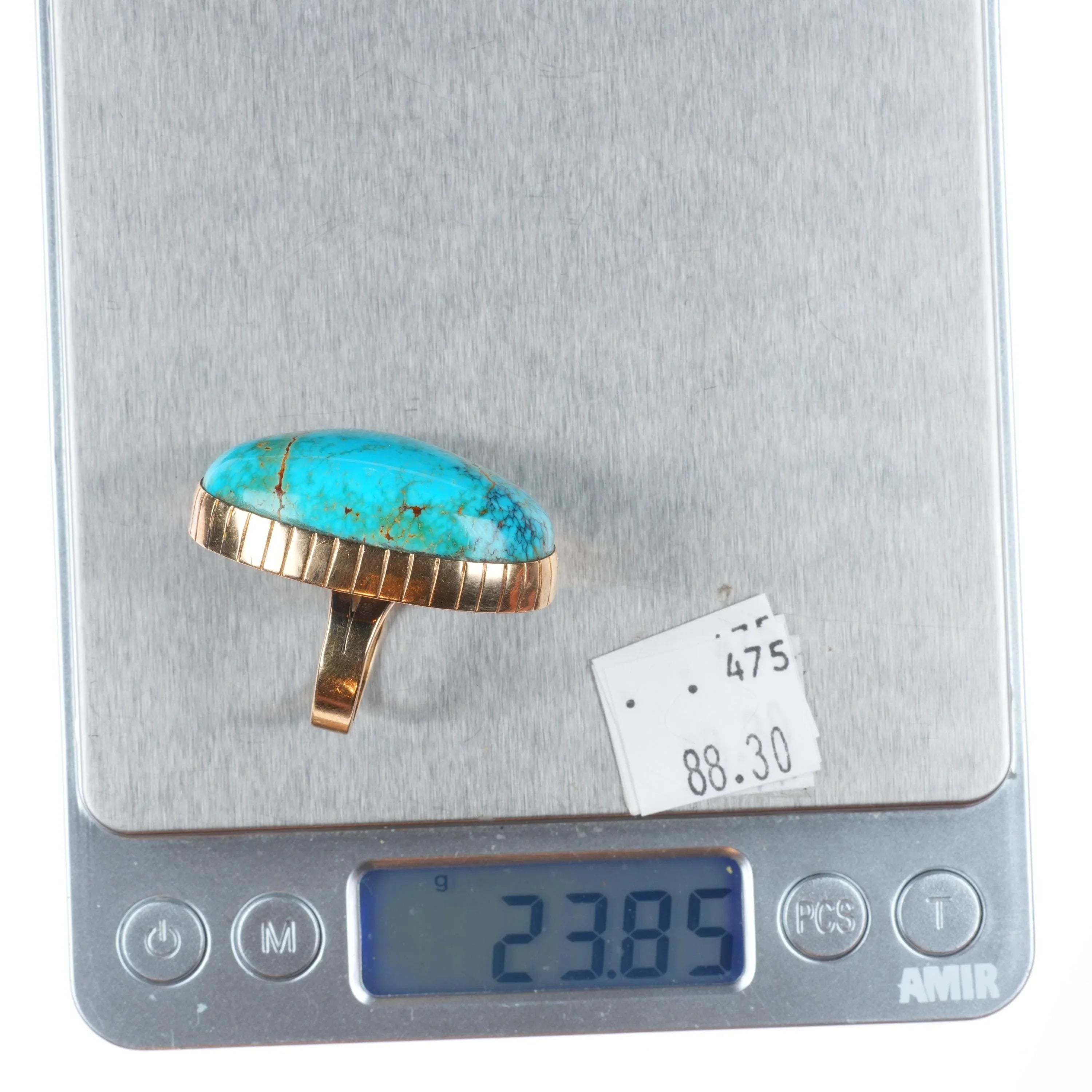 sz7 large vintage 14k gold high grade turquoise ring sterling silver back. Tested and guaranteed solid 14k gold bezel and band with sterling silver back plate. Nice ring from the last quarter of the 20th century. No apparent issues. Marked 14k with no other apparent markings.
