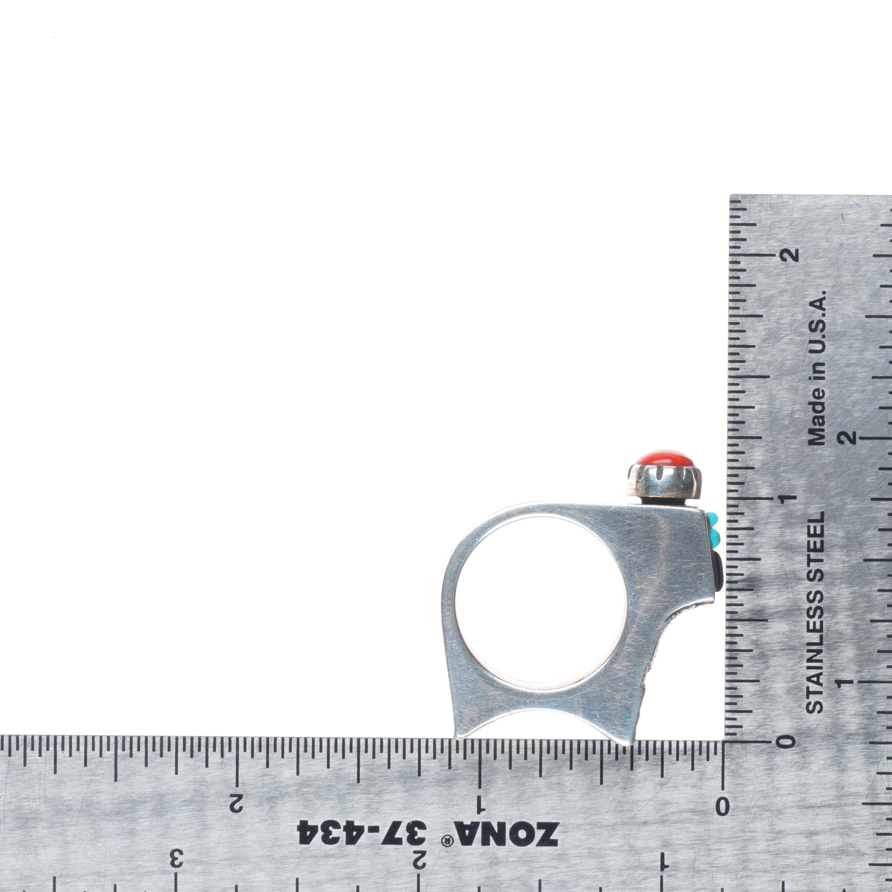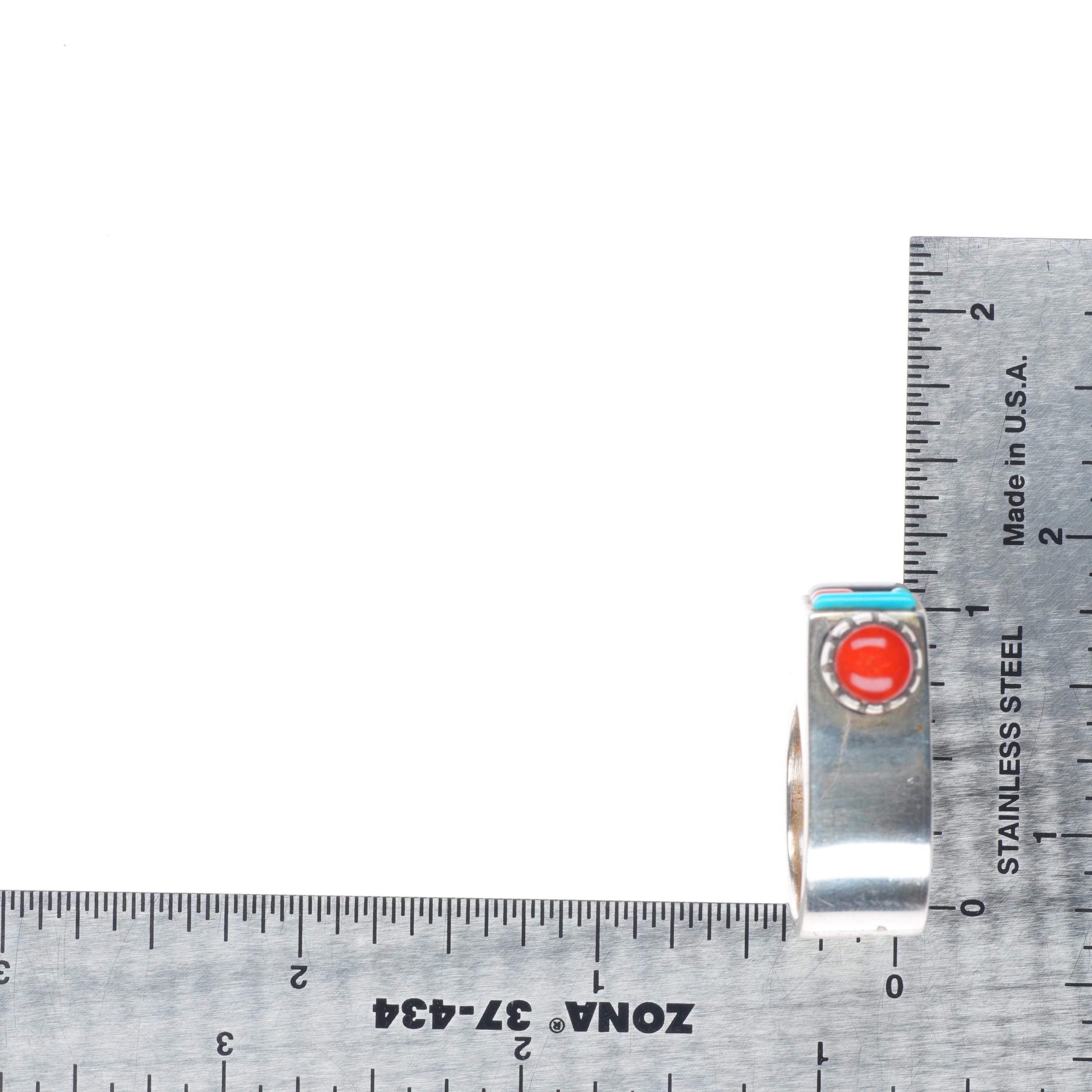sz7 Richard Tsosie Navajo coral,turquoise, sterling silver bear form ring