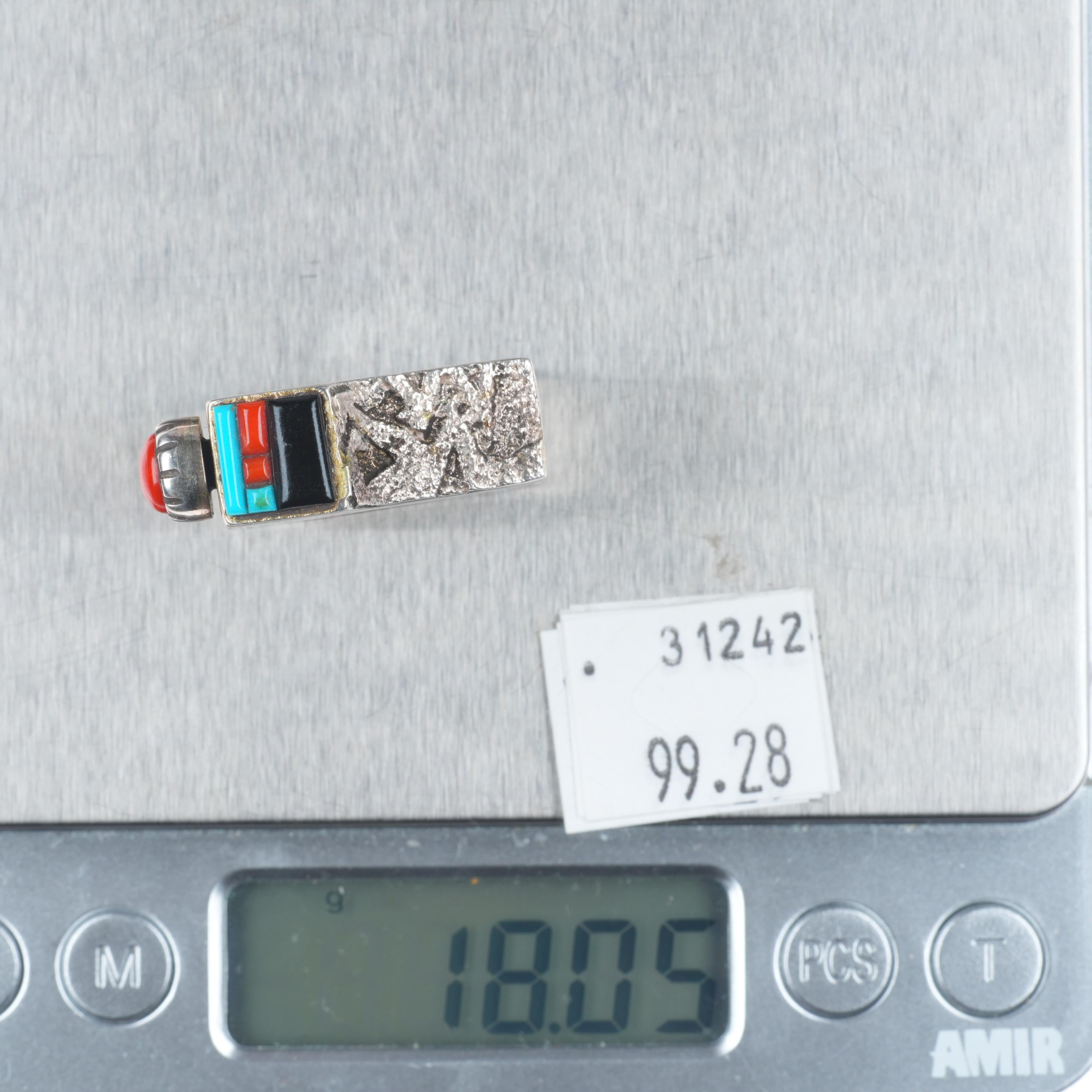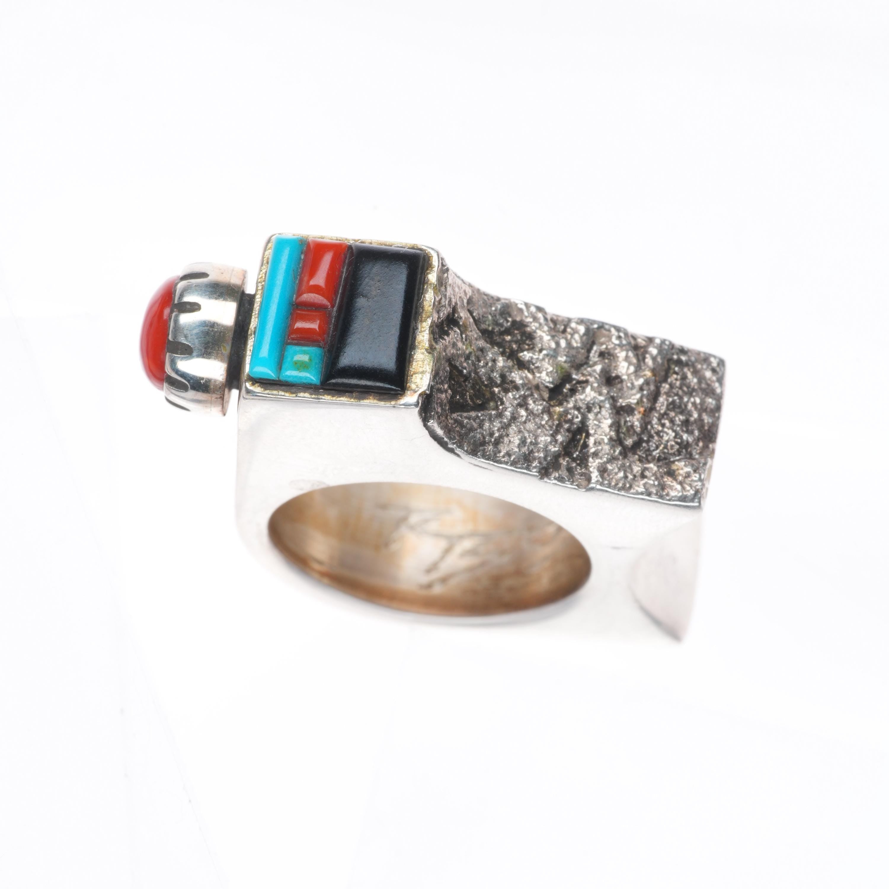 sz7 Richard Tsosie Navajo coral,turquoise, sterling silver bear form ring. Tested and guaranteed solid sterling silver. Nice ring from the last quarter of the 20th century. Some expected wear, weight and measurements in pictures.   I belive this is meant to wear as sort of a two finger ring with the cobblestone inlay pointing up.