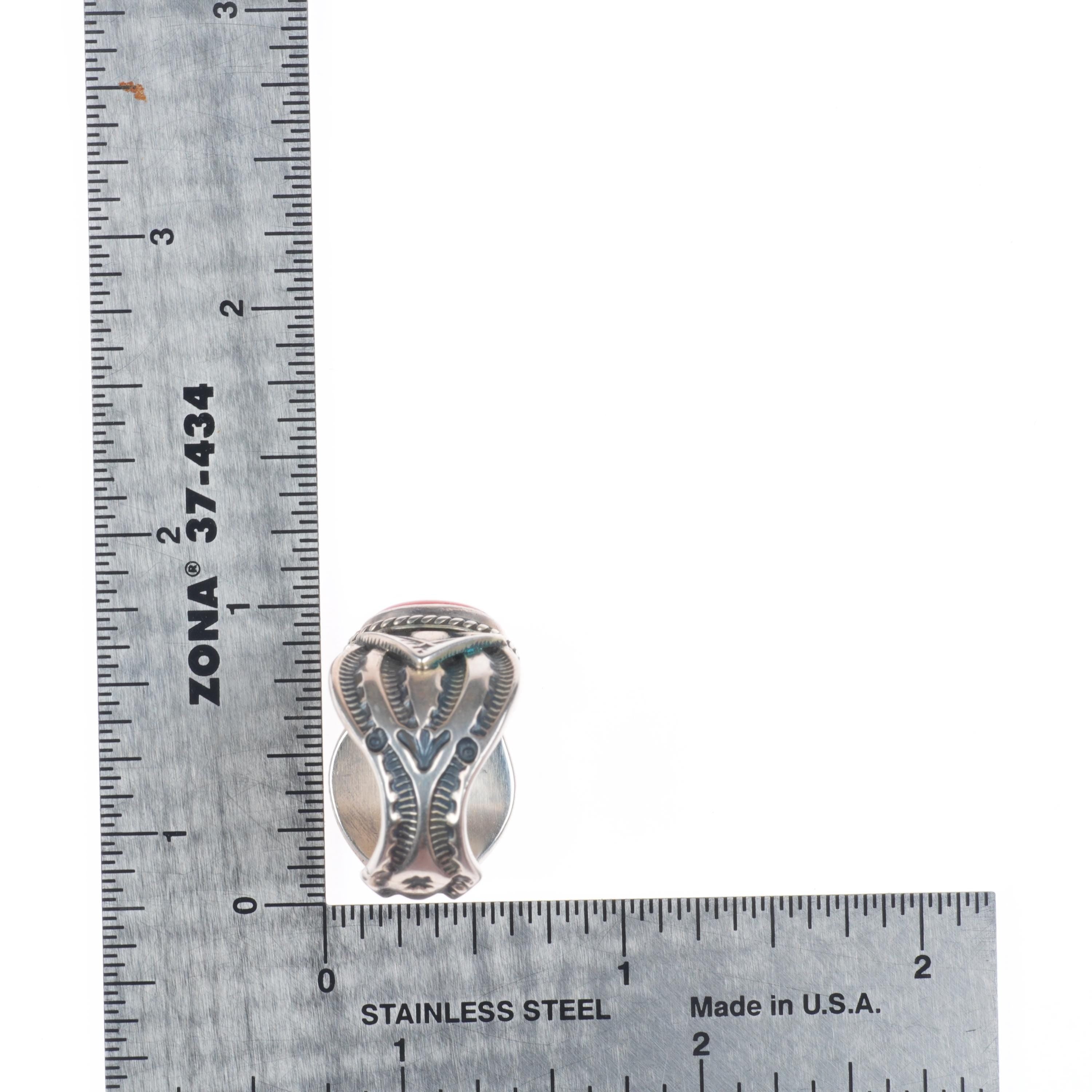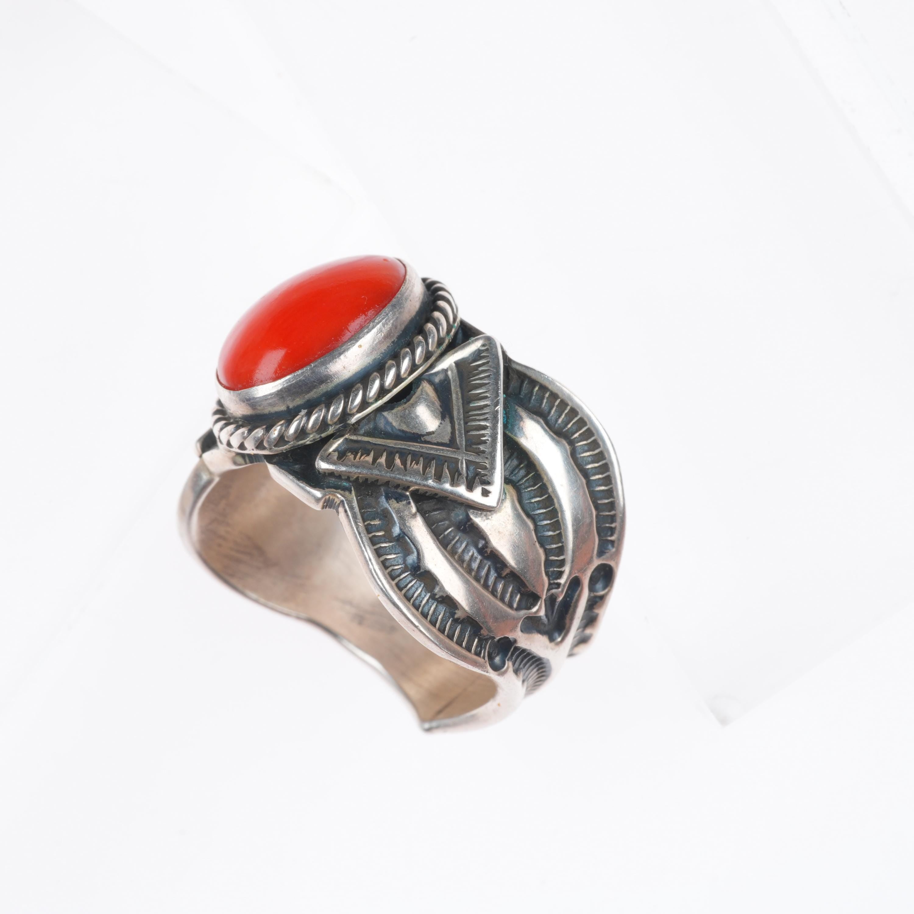 sz8 Sunshine Reeves Navajo sterling silver deep stamped mediterranean coral ring. Tested and guaranteed solid sterling silver, circa third quarter of the 20th century. Some expected wear, weight and measurements in pictures. The photographer forgot the scale pic, I cannot pull it from my storage to weigh it.