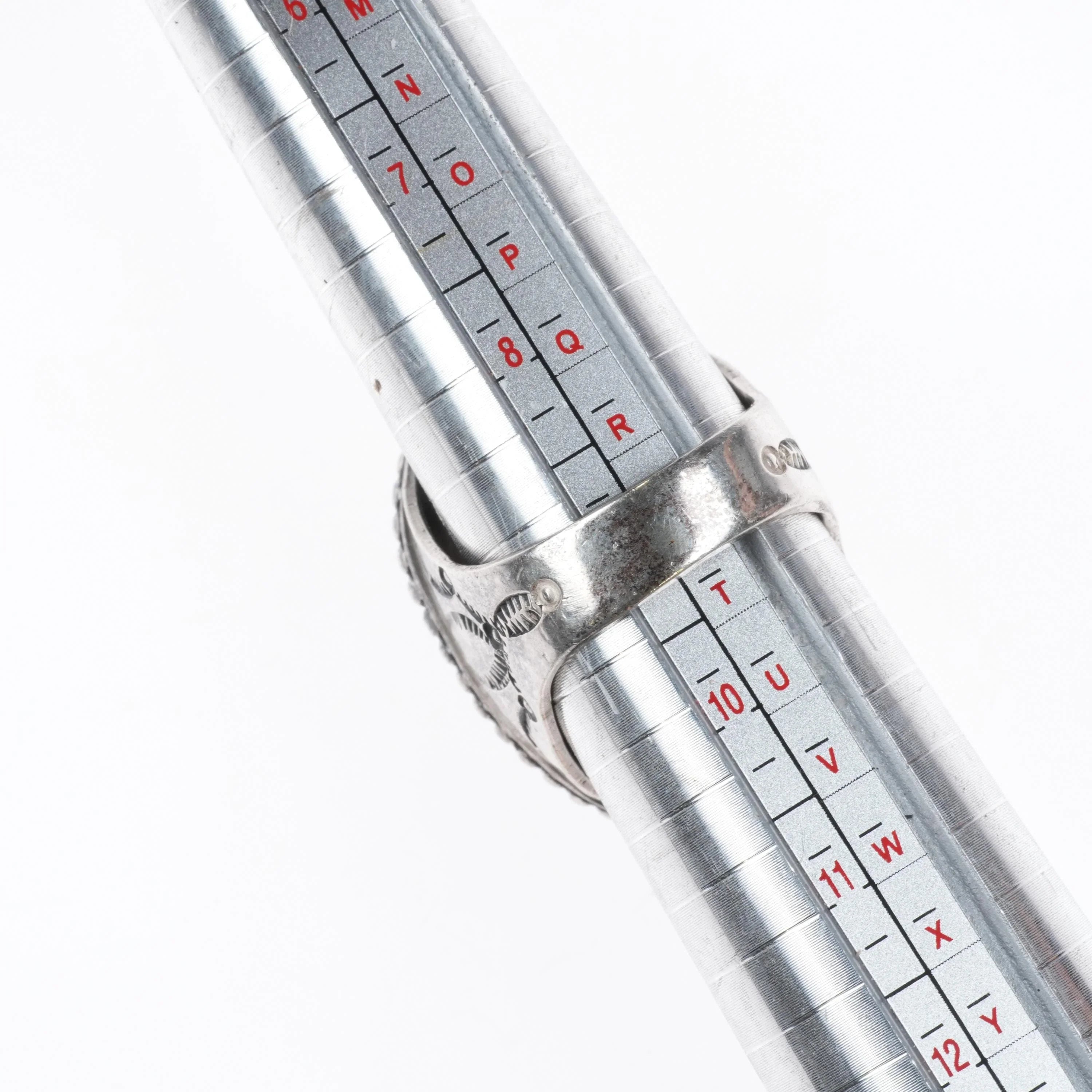sz9.25 Large Vintage Native American sterling silver turquoise ring stamped side. Great looking ring from the mid 20th century. No detectable hallmarks which is typical of Native American jewelry of this era. Tested and guaranteed solid sterling silver with no issues.