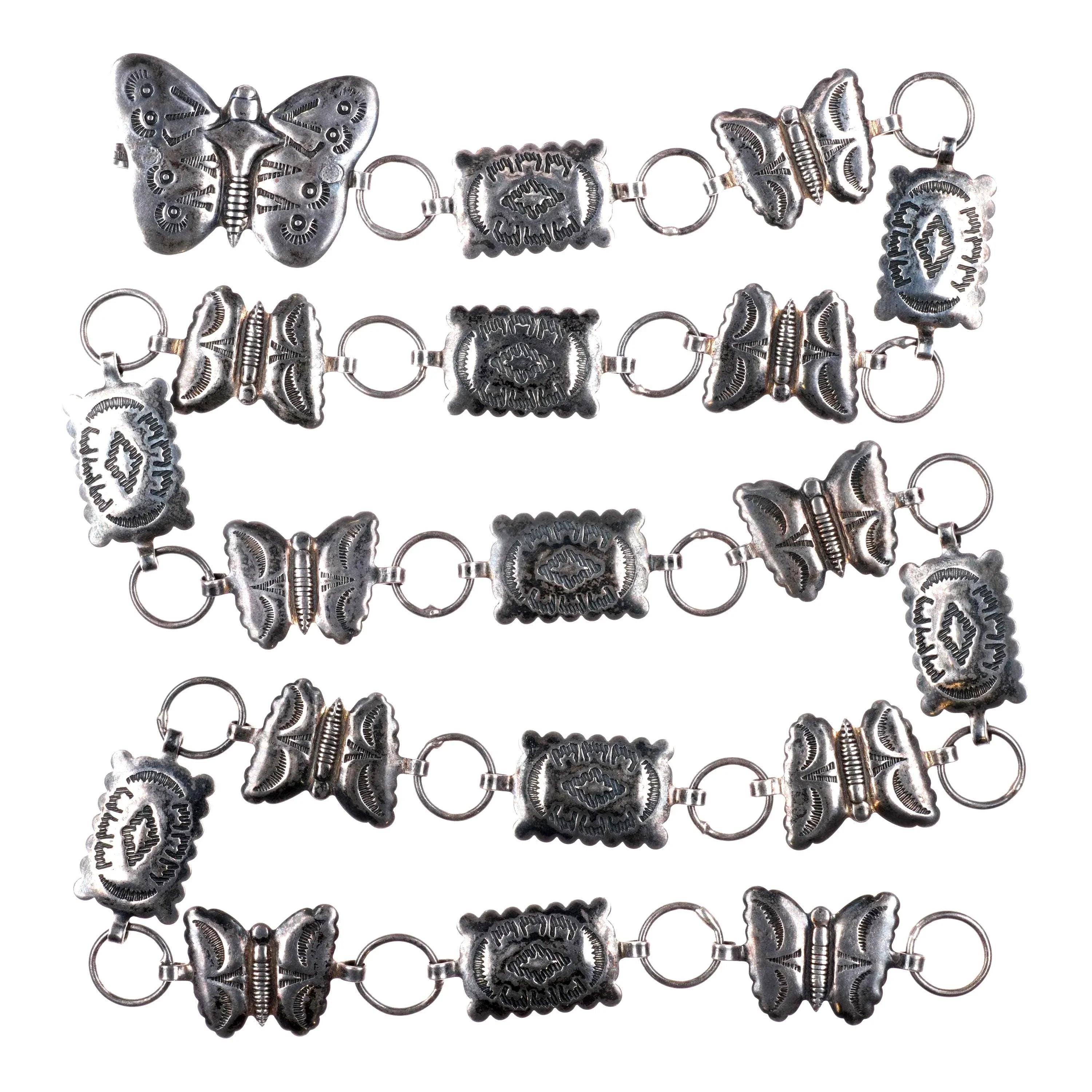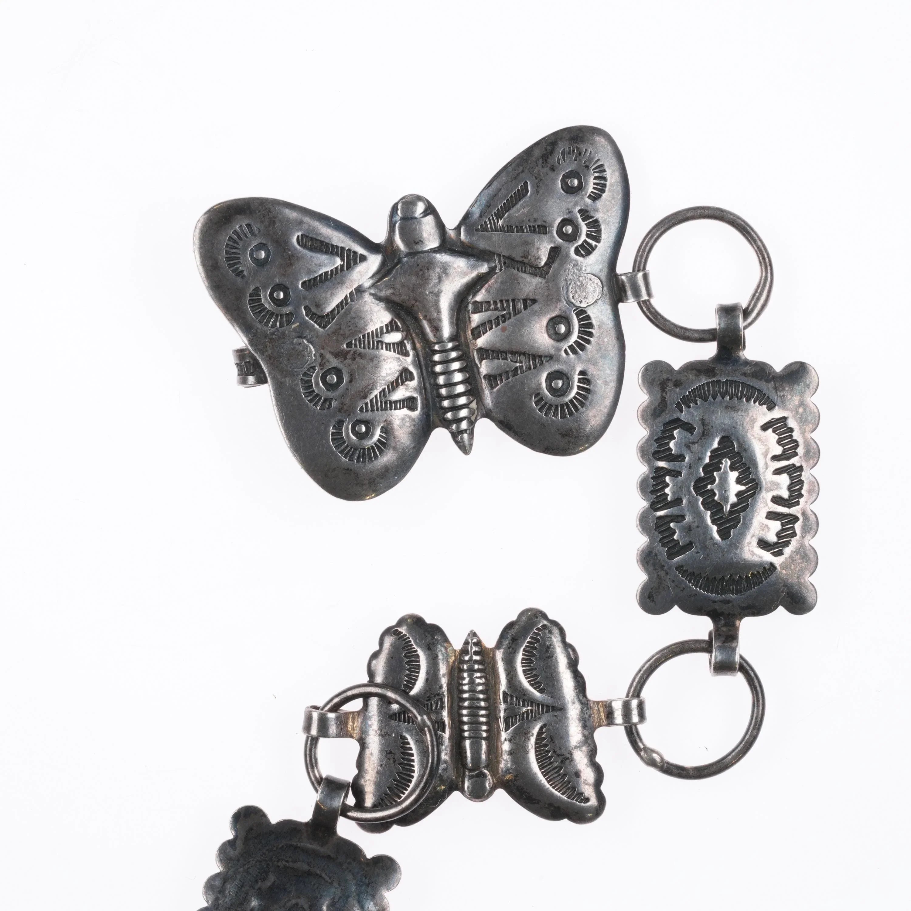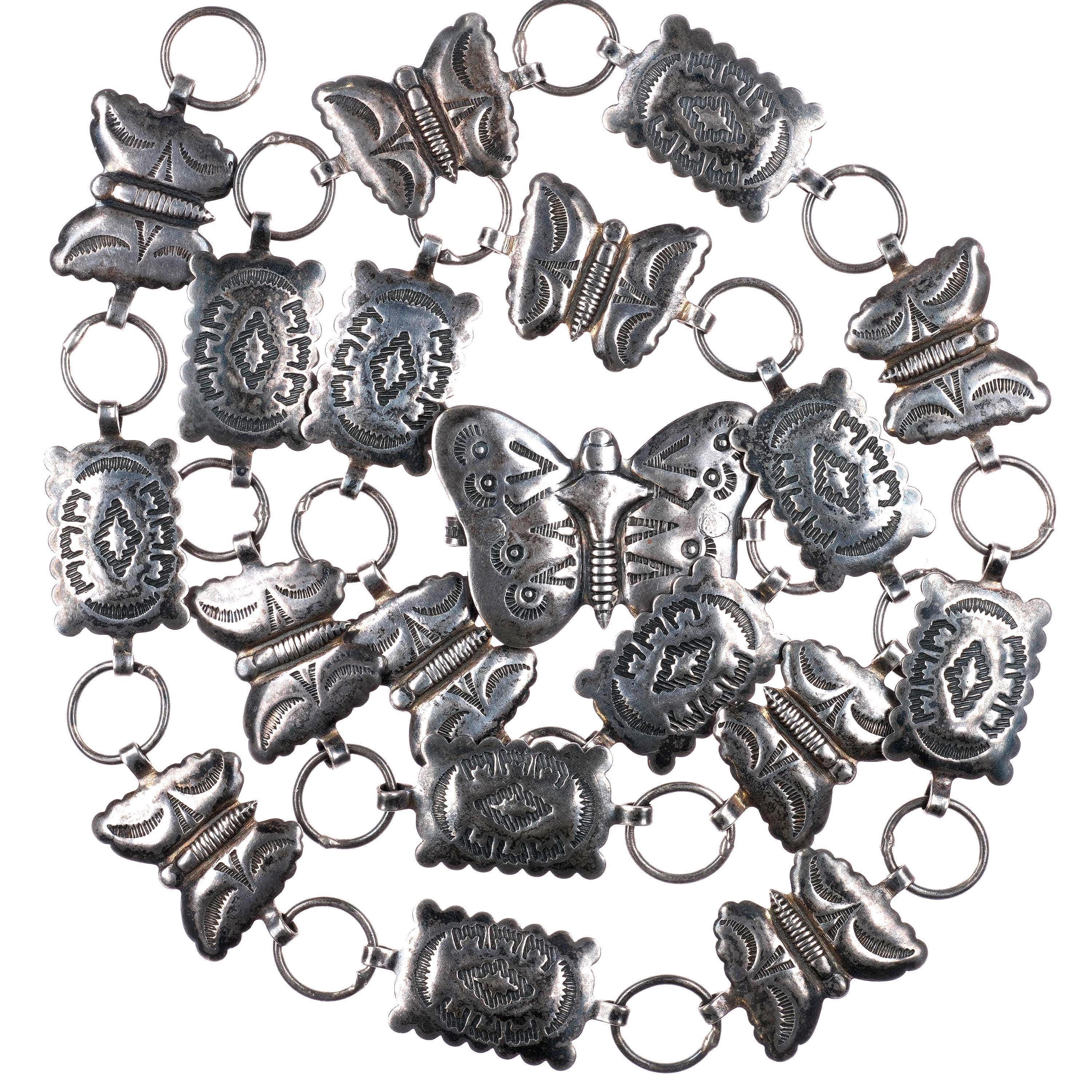 Vintage Fred Harvey Era Sterling silver butterfly stamped concho belt. Tested and guaranteed solid sterling silver with weight and measurements in pictures. Fully functional, 30" long but could be worn shorter and hooked anywhere. Also could be worn as a necklace.. All items will likely have some expected wear, the older they are the more wear they should have. Circa mid 20th century, stamped sterling with no other detectable markings.