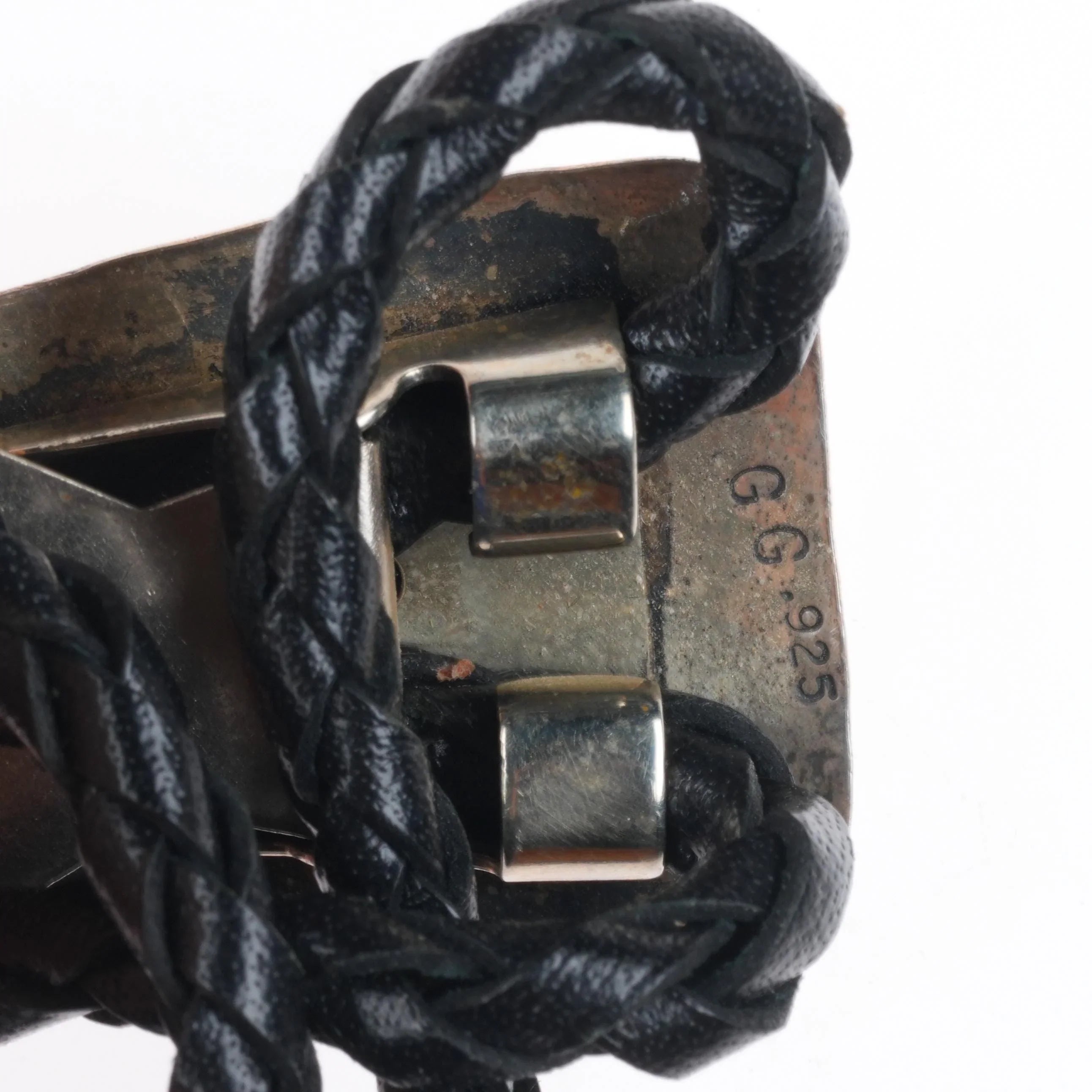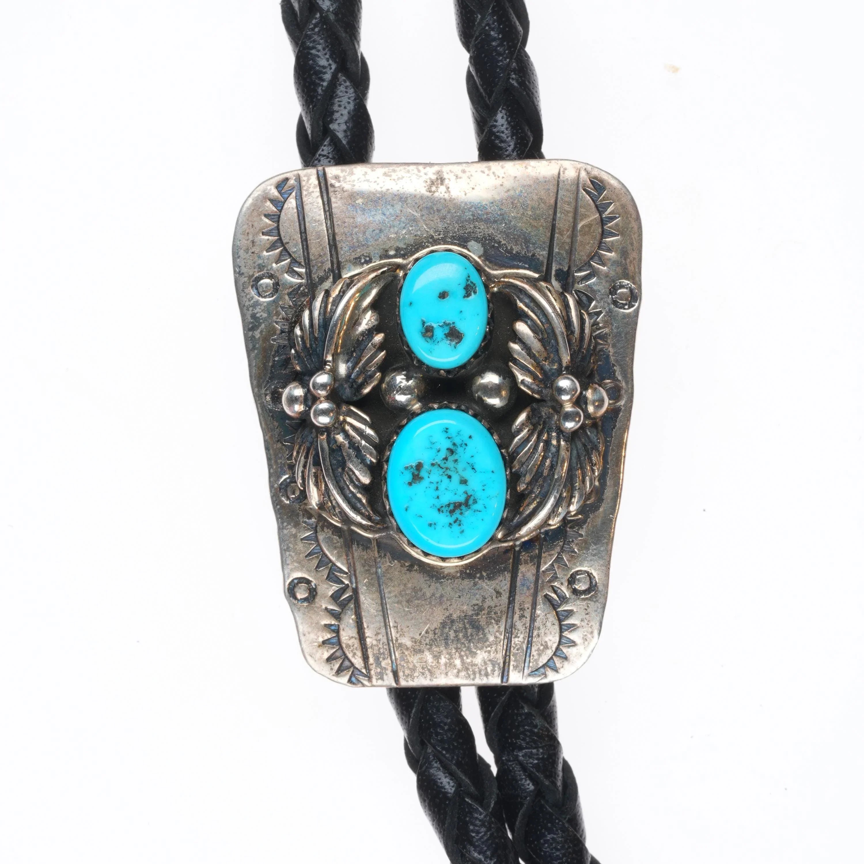 Vintage GG Navajo sterling silver double turquoise bolo tie w/feather design