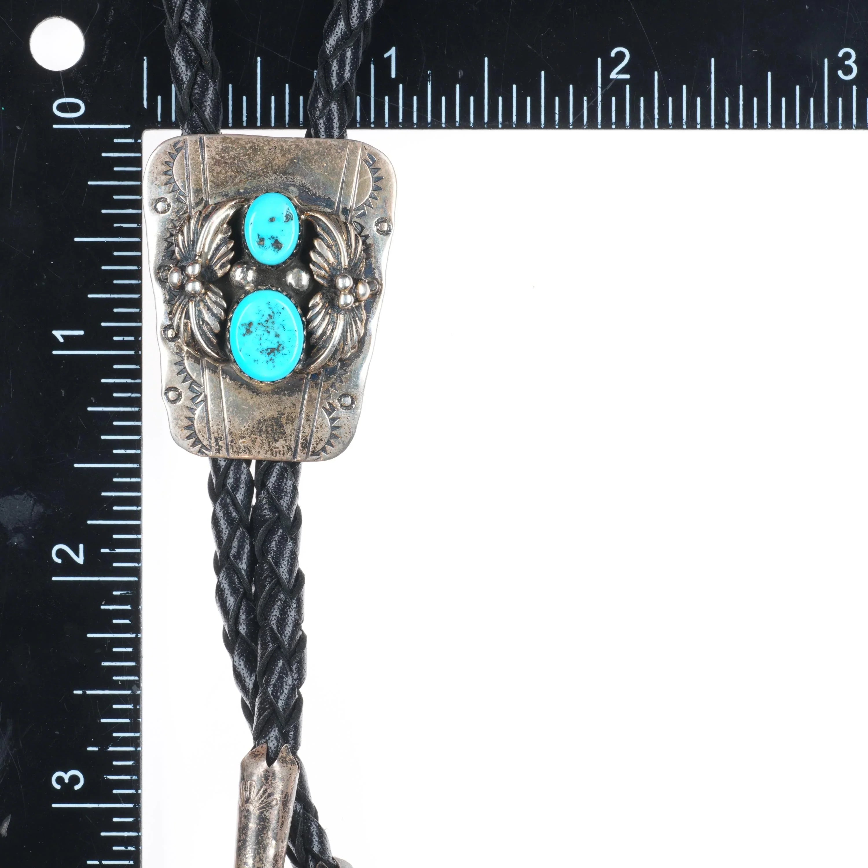 Vintage GG Navajo sterling silver double turquoise bolo tie w/feather design. Tested and guaranteed solid sterling silver slide and tips. Weight and measurements in pictures. Tray is tared out, so weight shown is just the bolo of course. 40" long