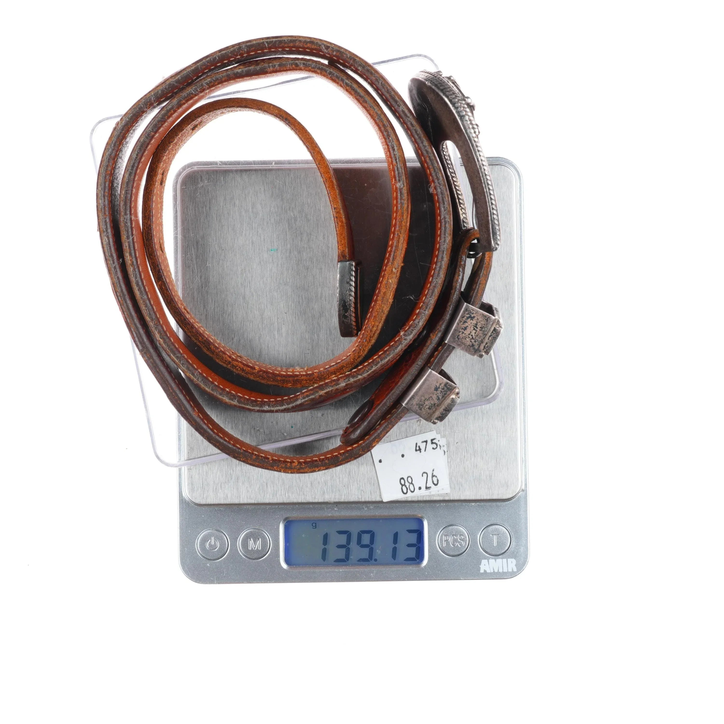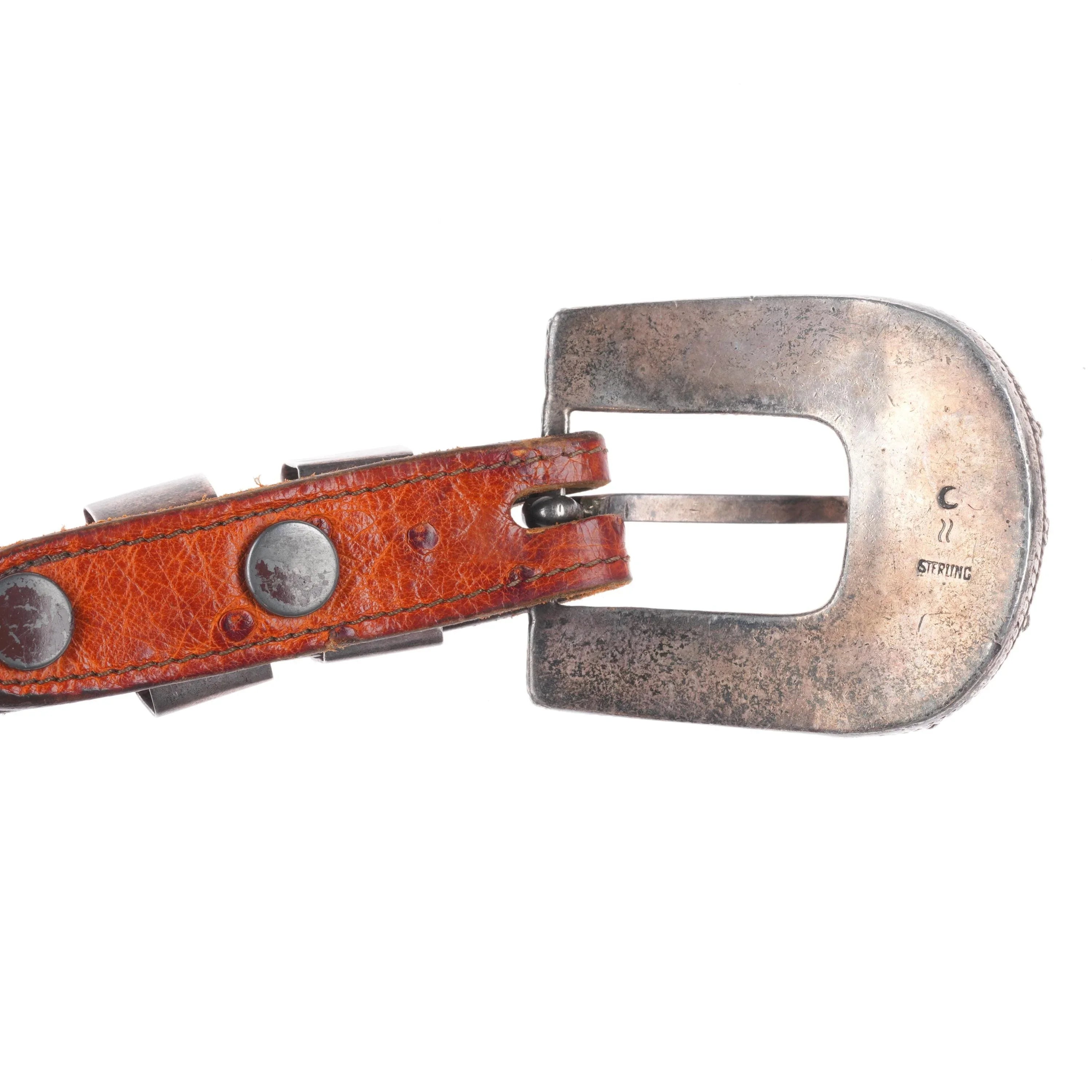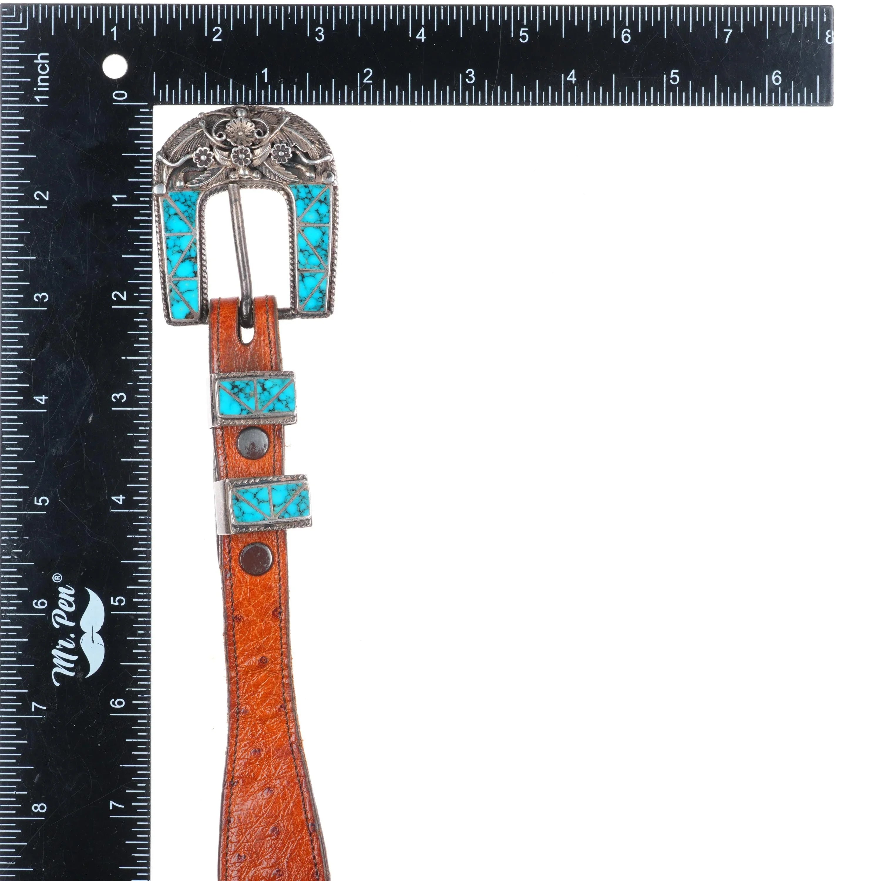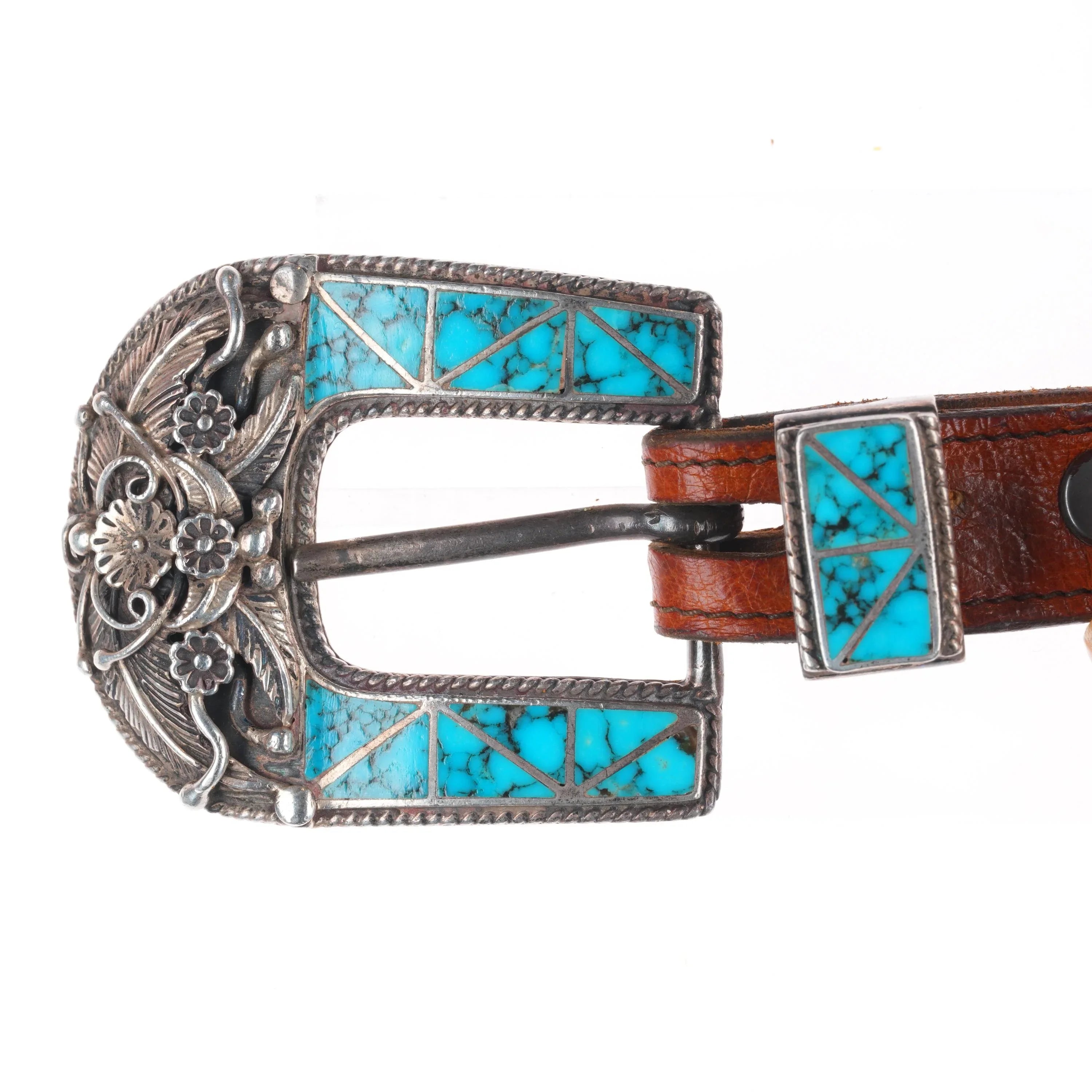 Vintage Navajo sterling silver spiderweb turquoise inlay ranger belt buckle set. Solid sterling silver (tested) with weight and measurements in pictures.. Fits a 3/4" belt. No issues, some expected wear. Ranger belts are typically wider and taper down to 3/4" where the buckle and tip go on. Including the belt shown free, very high end 31" max belt signed as shown with wear.