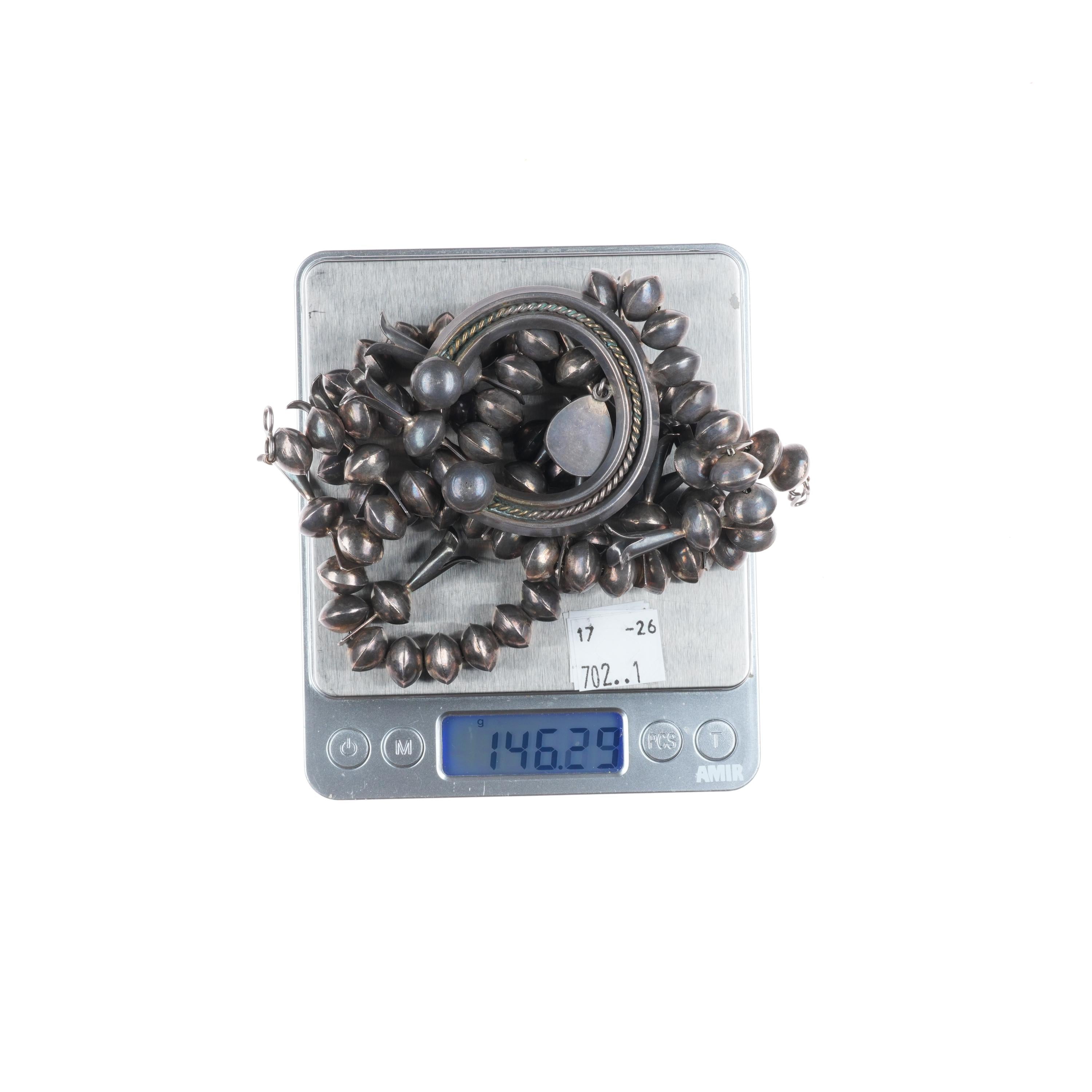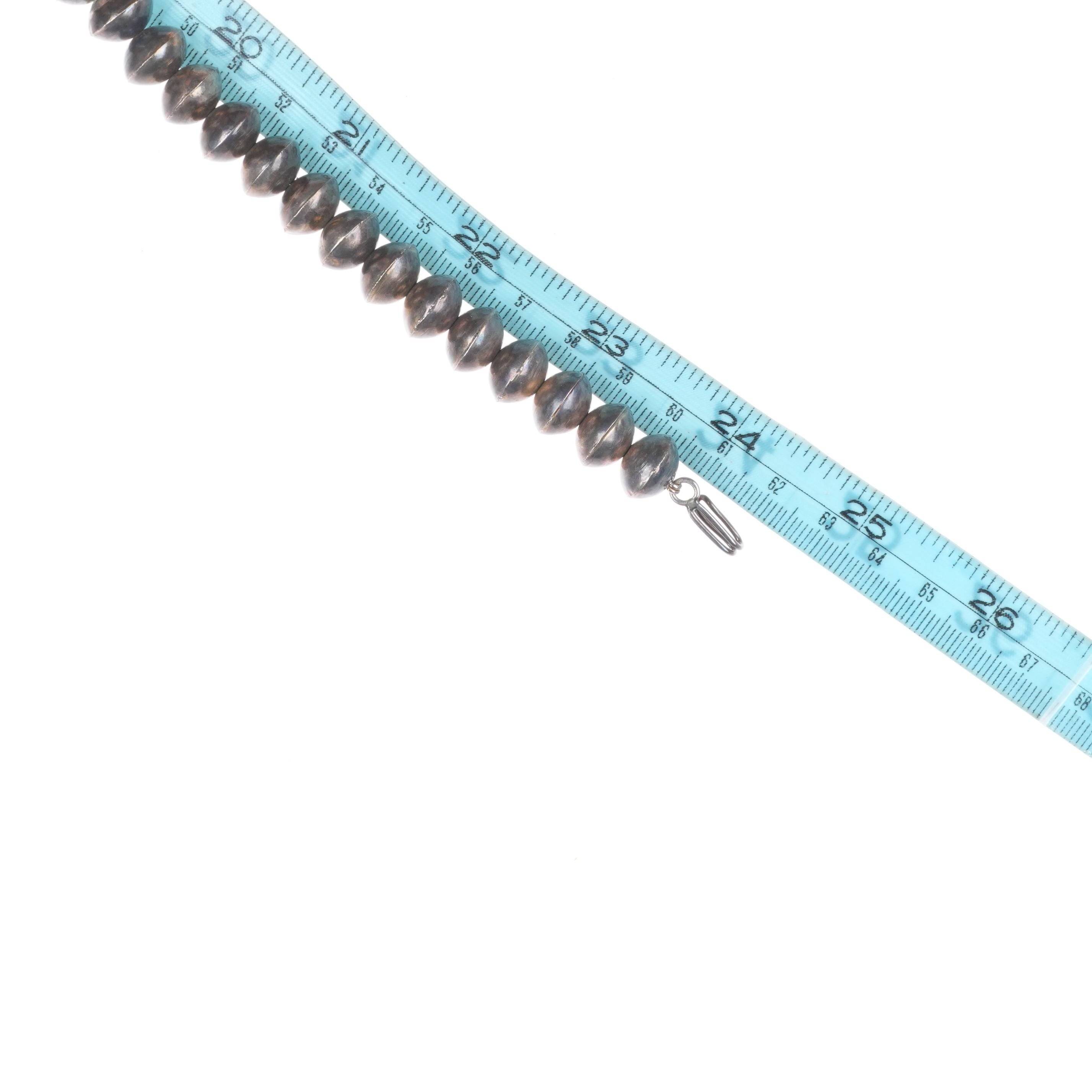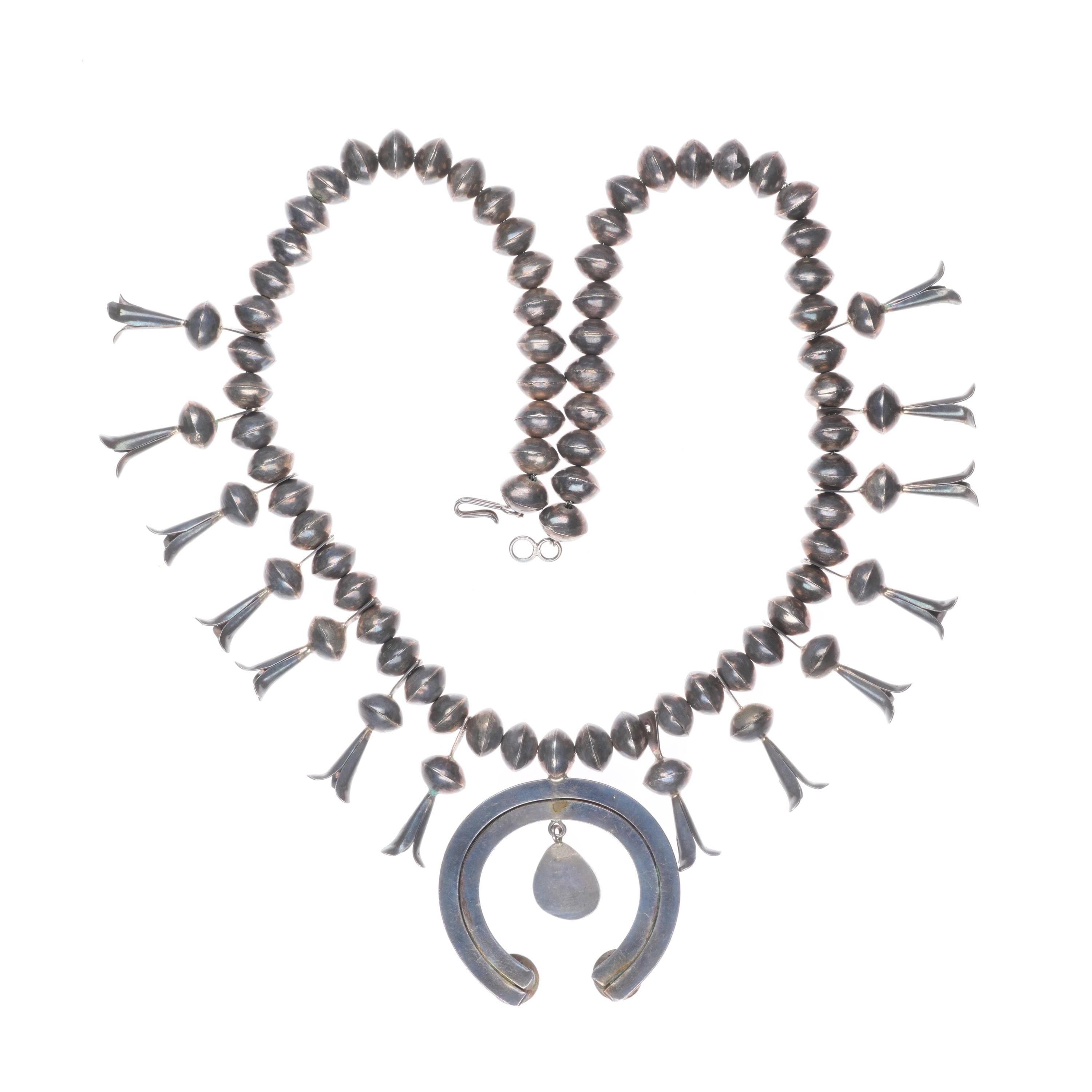 Vintage Navajo sterling silver squash blossom necklace w/turquoise naja 24.5". Selling the squash blossom necklace shown in good condition with measurements in pictures. Tested and guaranteed solid sterling silver. Weight and measurements in pictures. Circa mid 20th century.