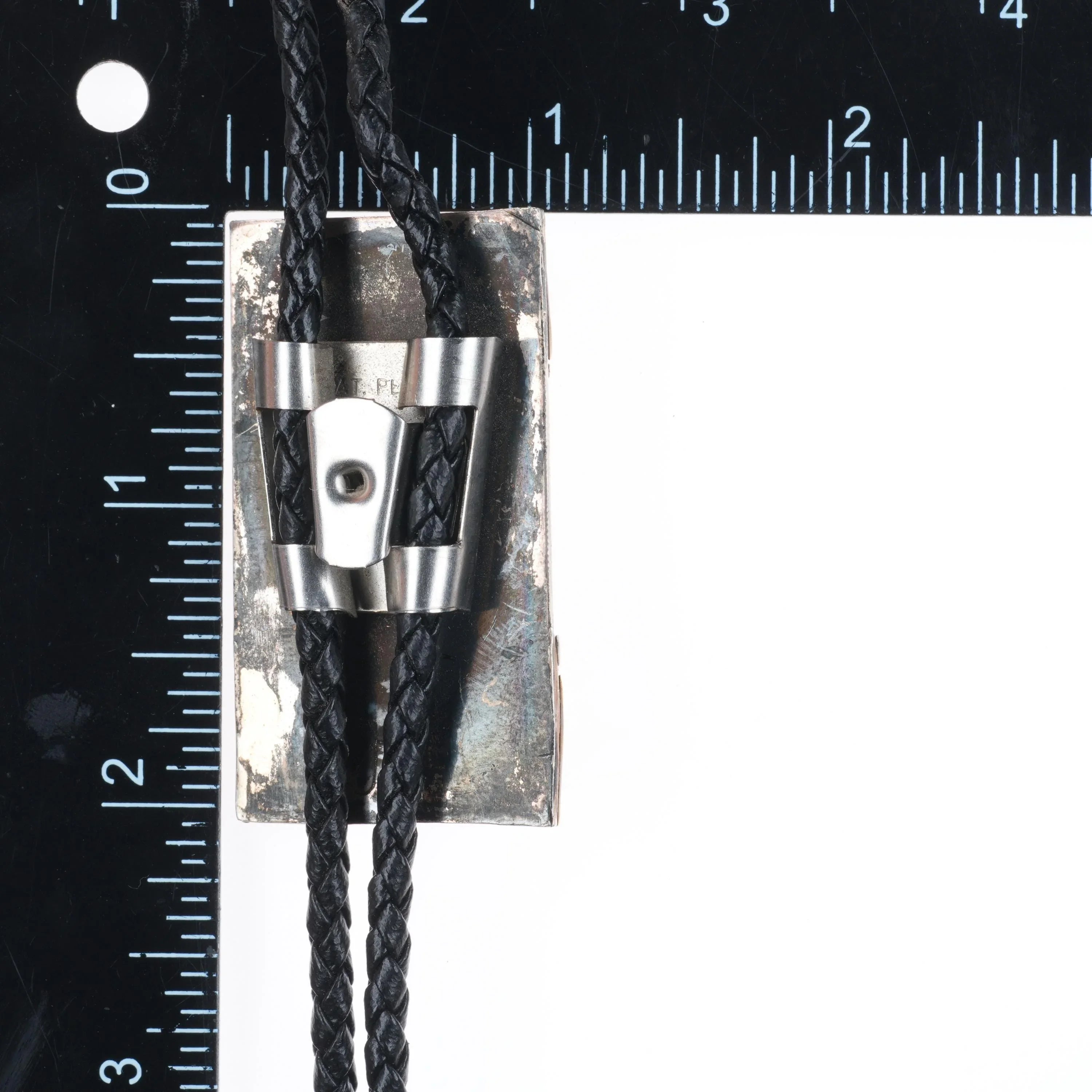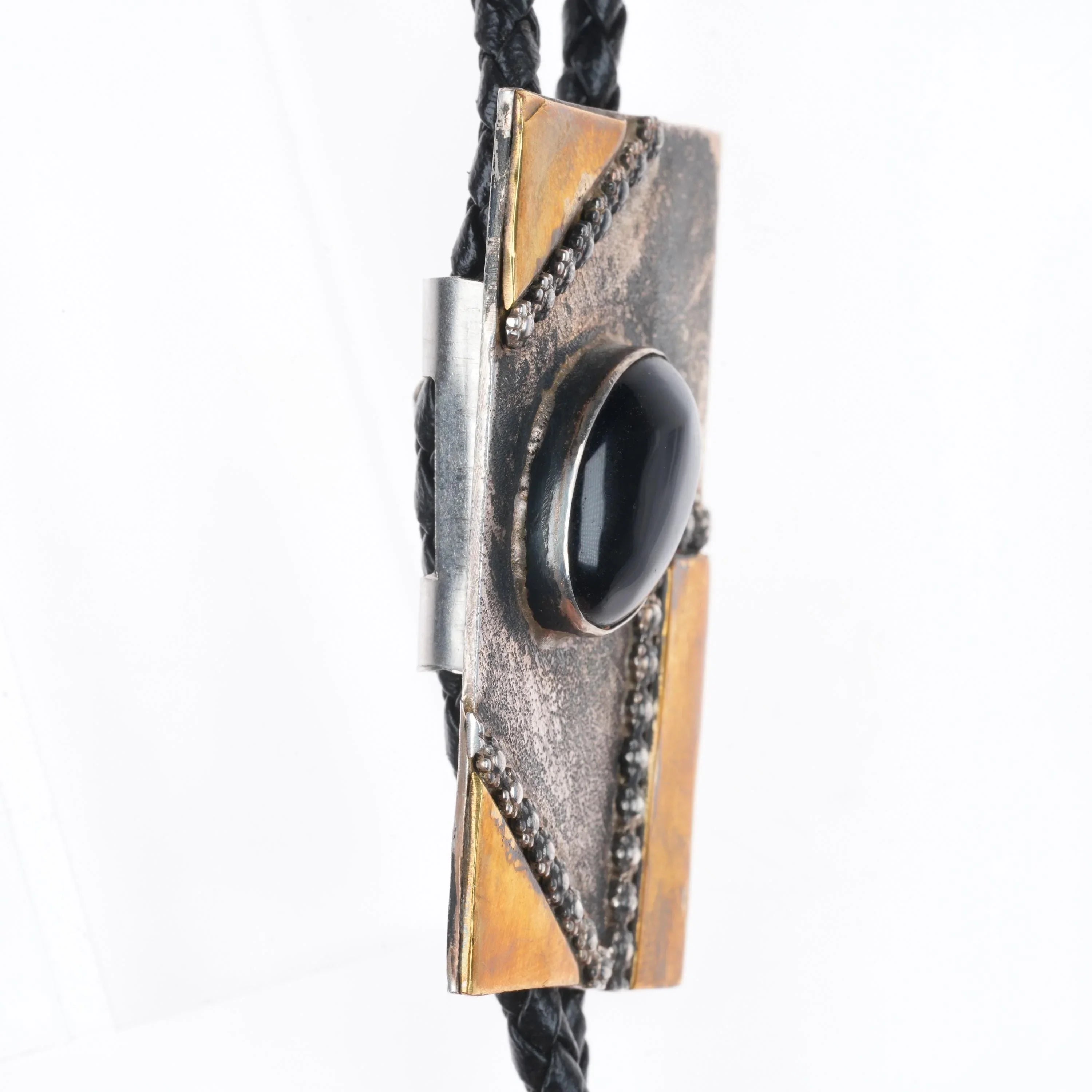 Vintage southwestern modernist sterling silver/brass mixed metals onyx bolo tie
