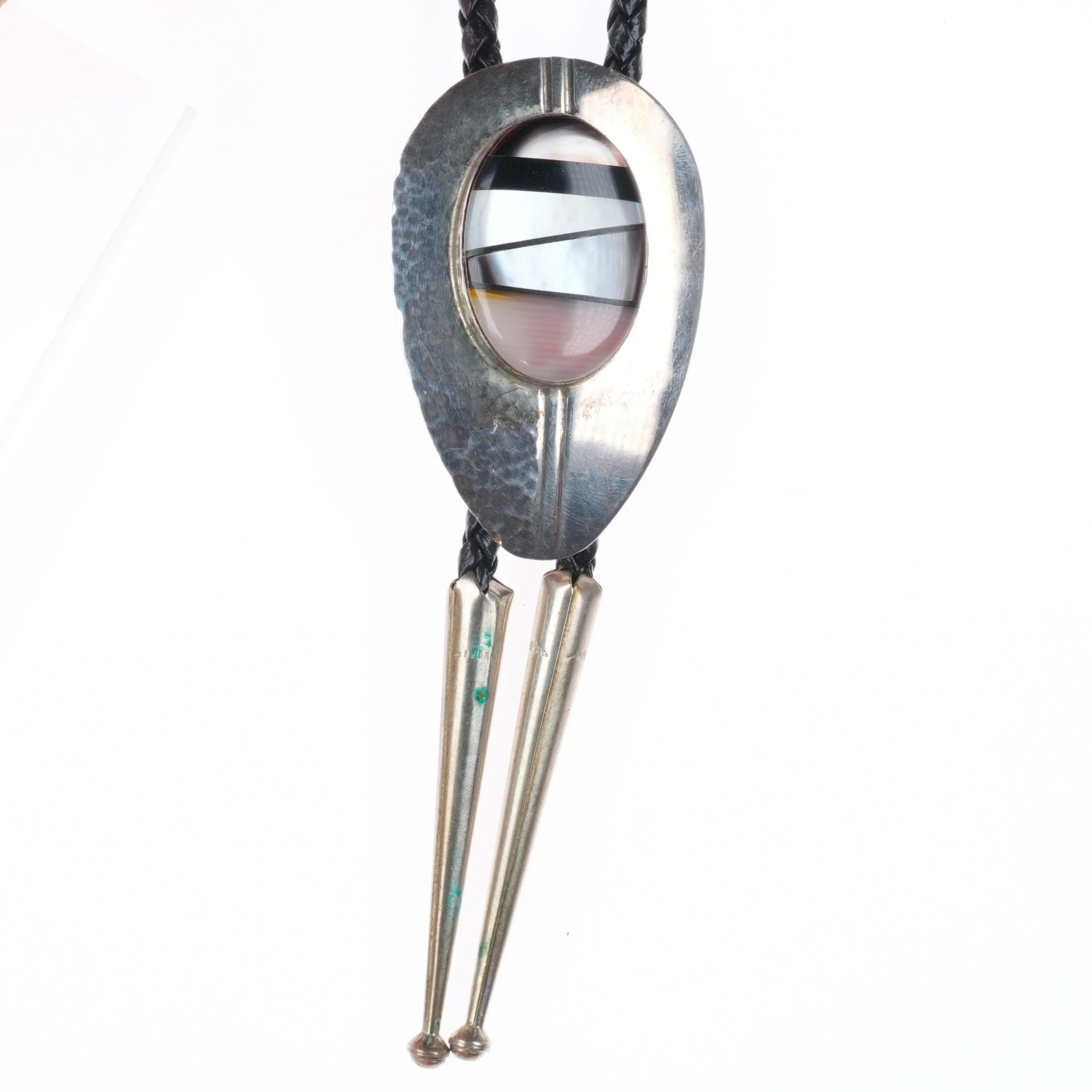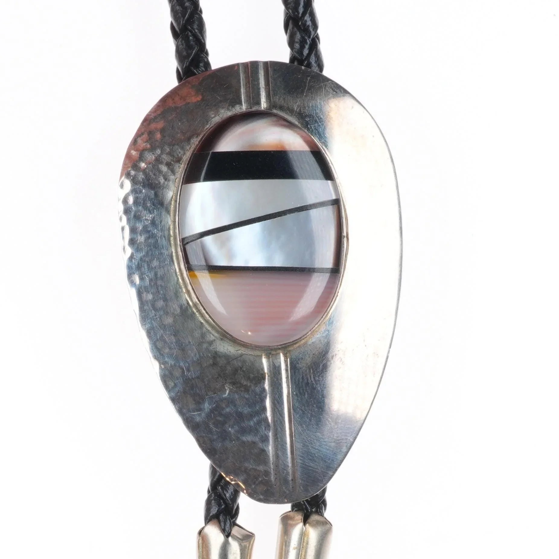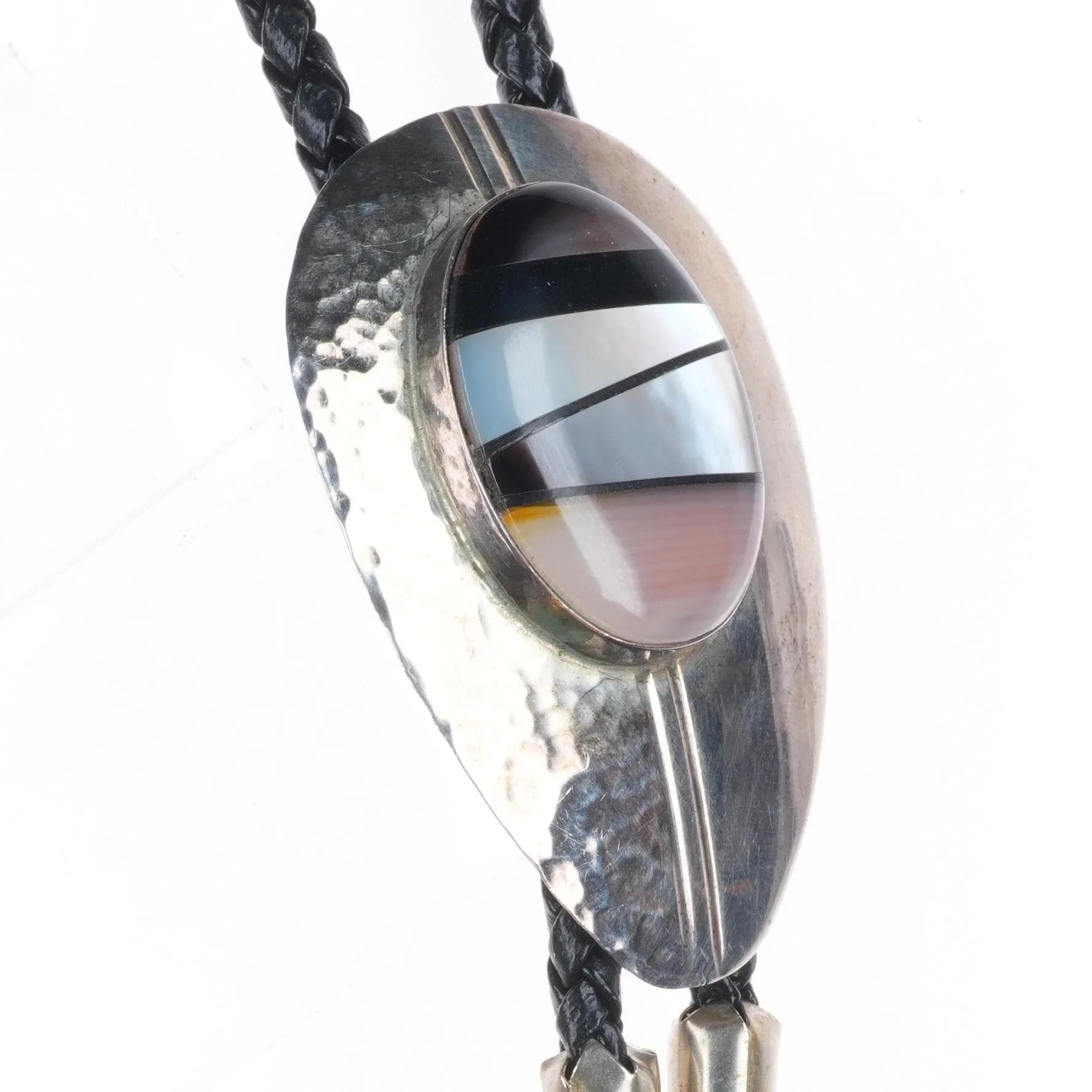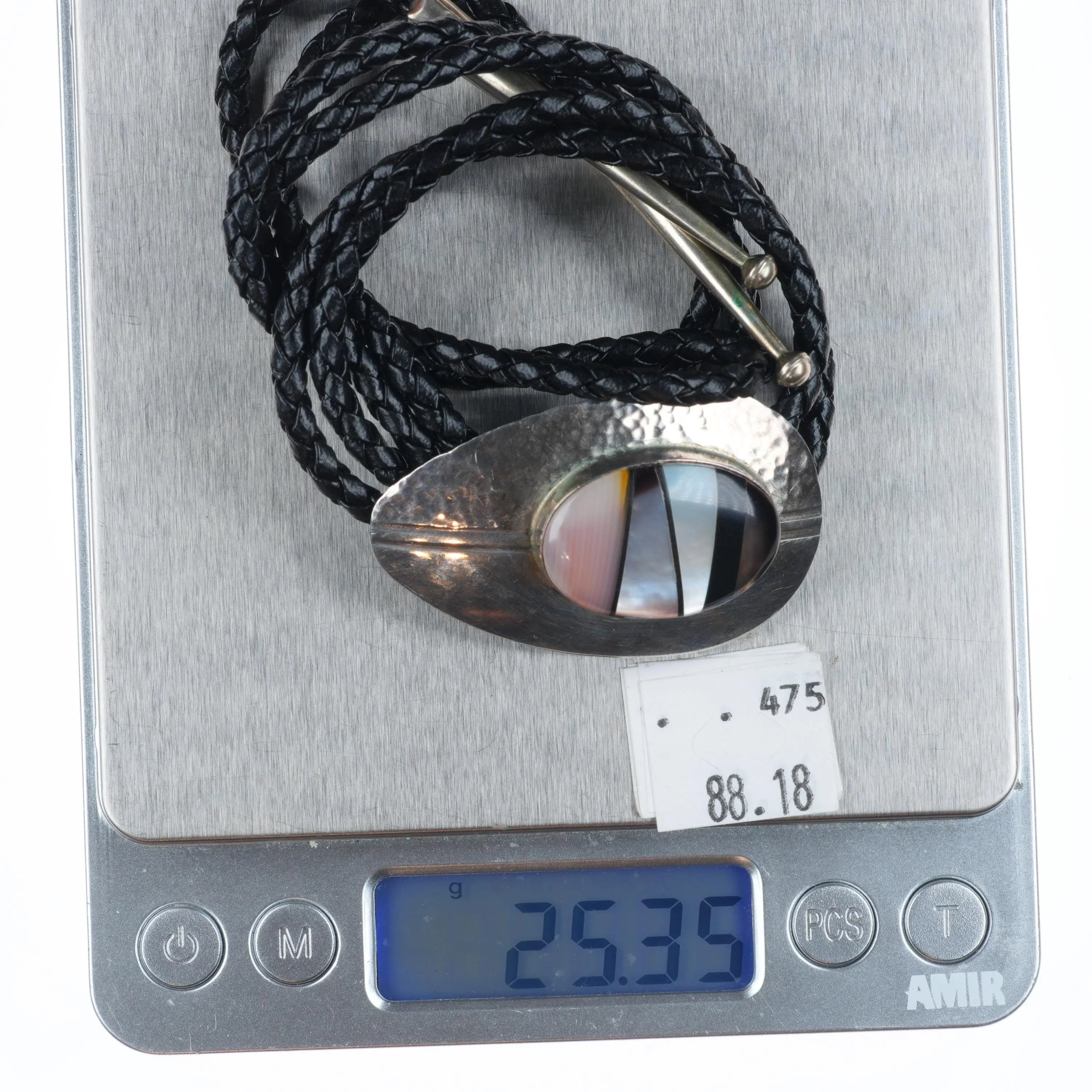 Vintage southwestern sterling silver shell, onyx inlay modernist bolo tie