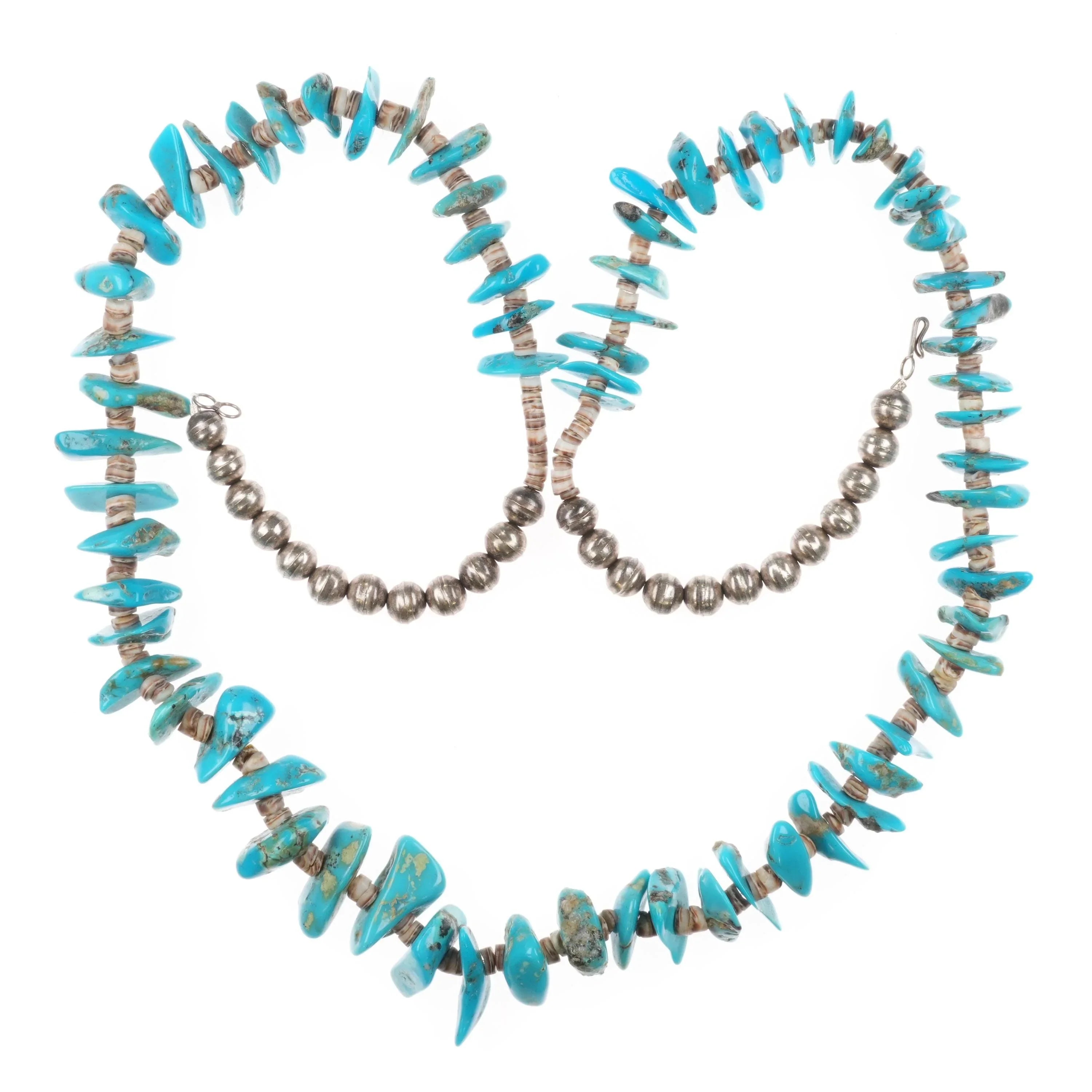 Vintage Sterling silver, turquoise/shell Native American Heishi necklace. Tested and guaranteed solid sterling silver with weight and measurements in the pictures. No detectable issues or markings. Great piece from large collection of Native American jewelry purchased in the last quarter of the 20th century and never worn for the most part. Circa 1970‘s. 28" long