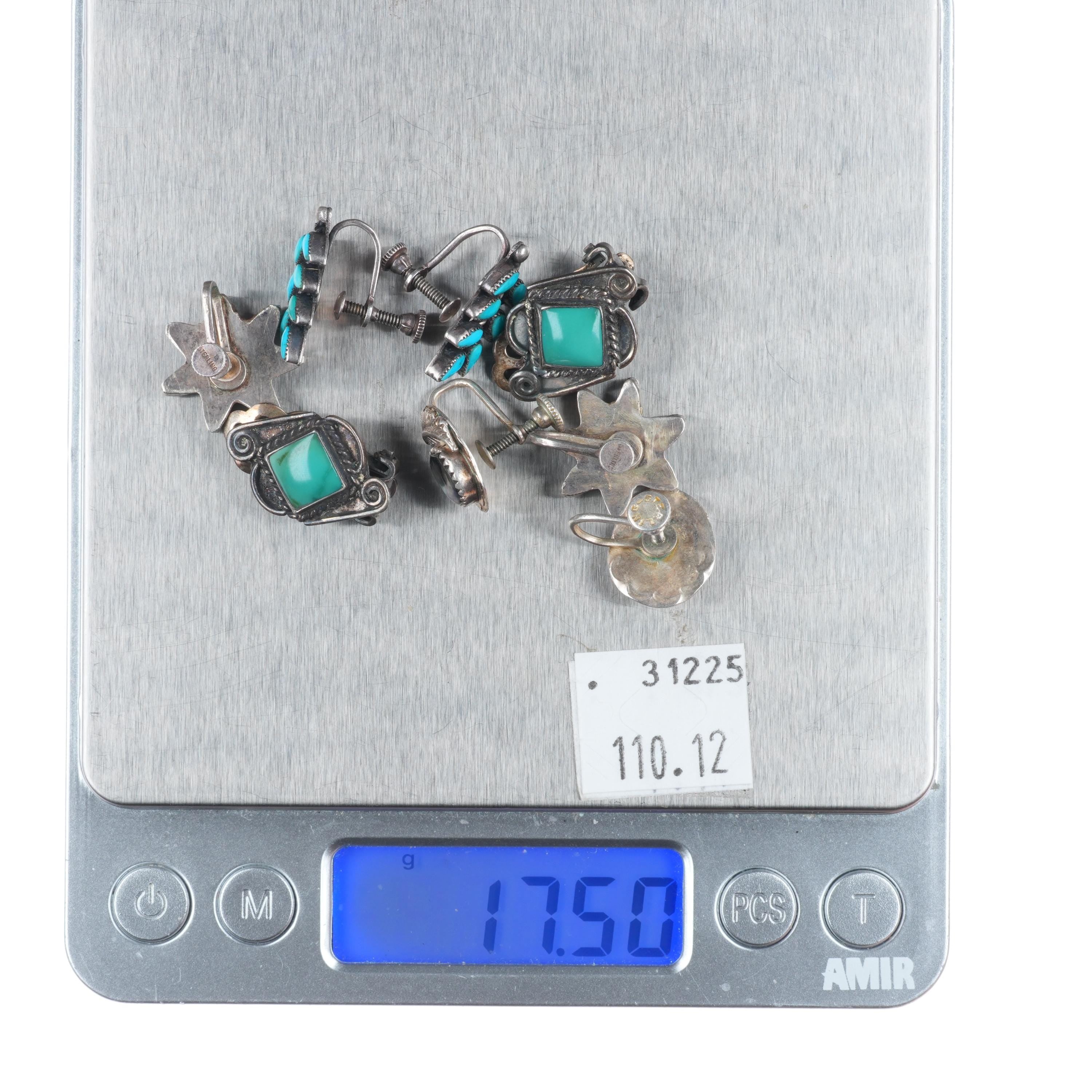 Vintage Zuni petit point turquoise/Navajo sterling silver/shell clip earring lot Great earrings, tested and guaranteed solid sterling silver with weight, and measurements will be shown in the pictures. Circa third quarter of the 20th century. All stones secure with no apparent damage. Selling 4 pairs, 2 clip on with strong springs, 2 screw back.