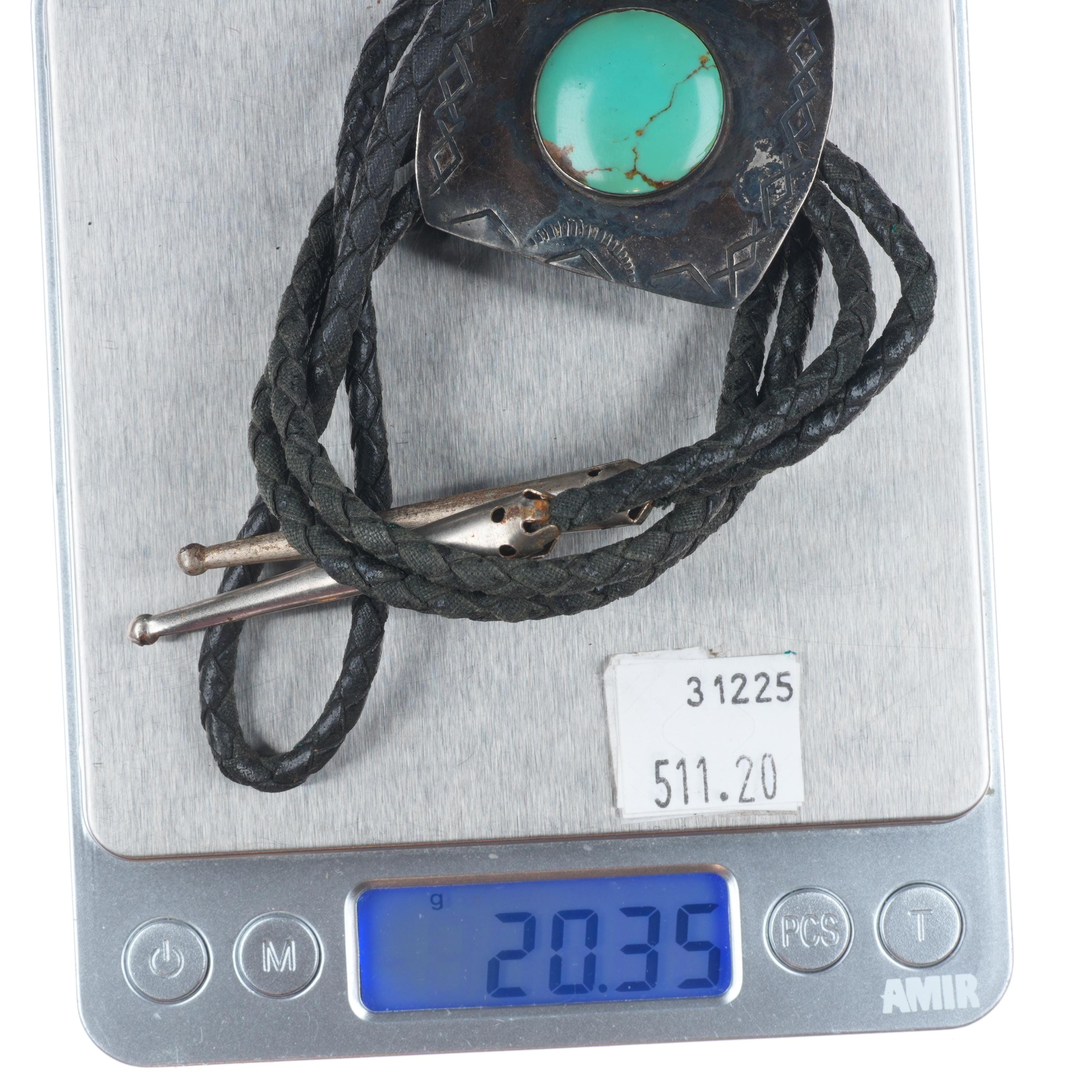1950‘s Navajo hand stamped sterling silver green turquoise bolo tie Tested and guaranteed solid sterling silver slide, later replacement tips not sterling.. Weight and measurements in pictures. 35" long. Circa mid 20th century.