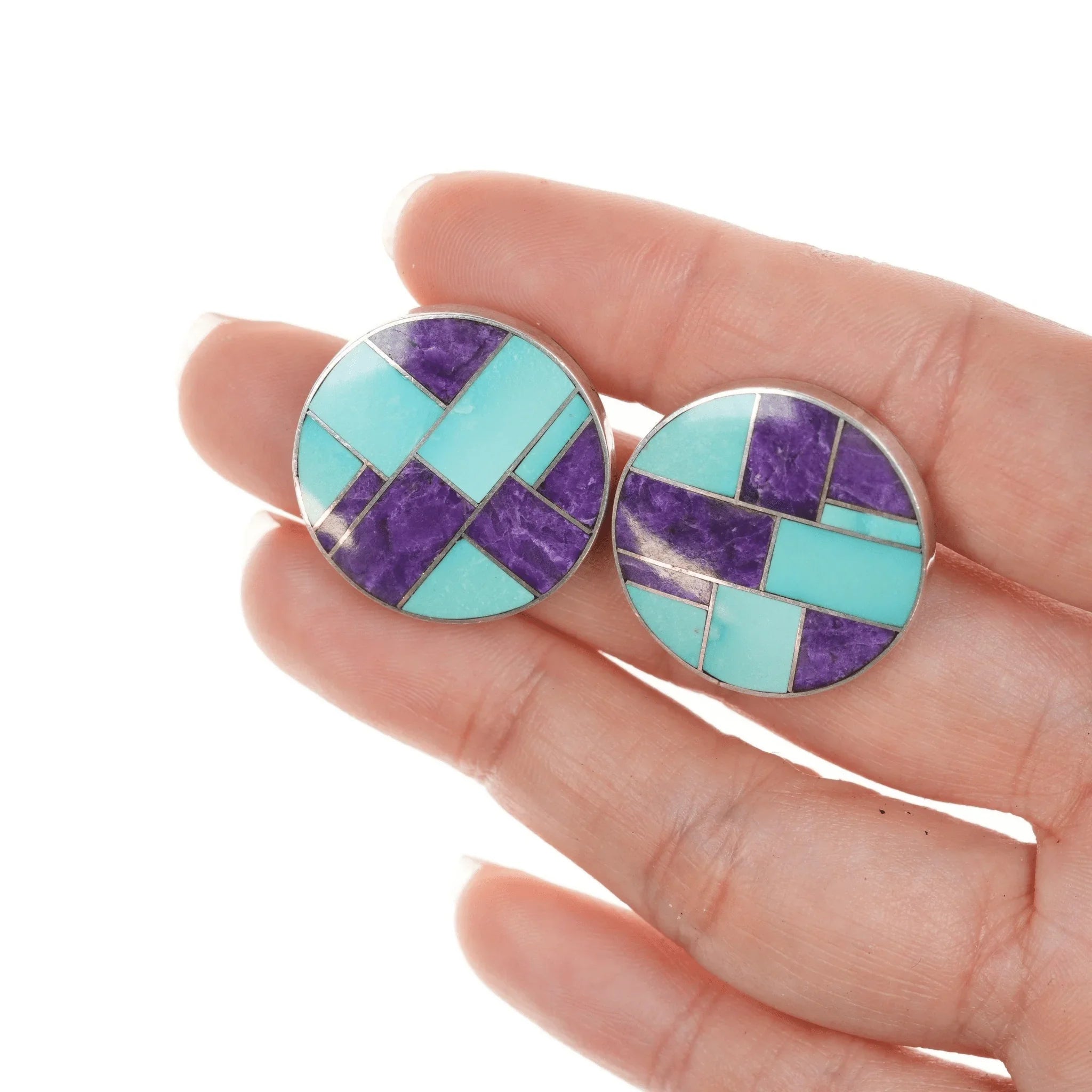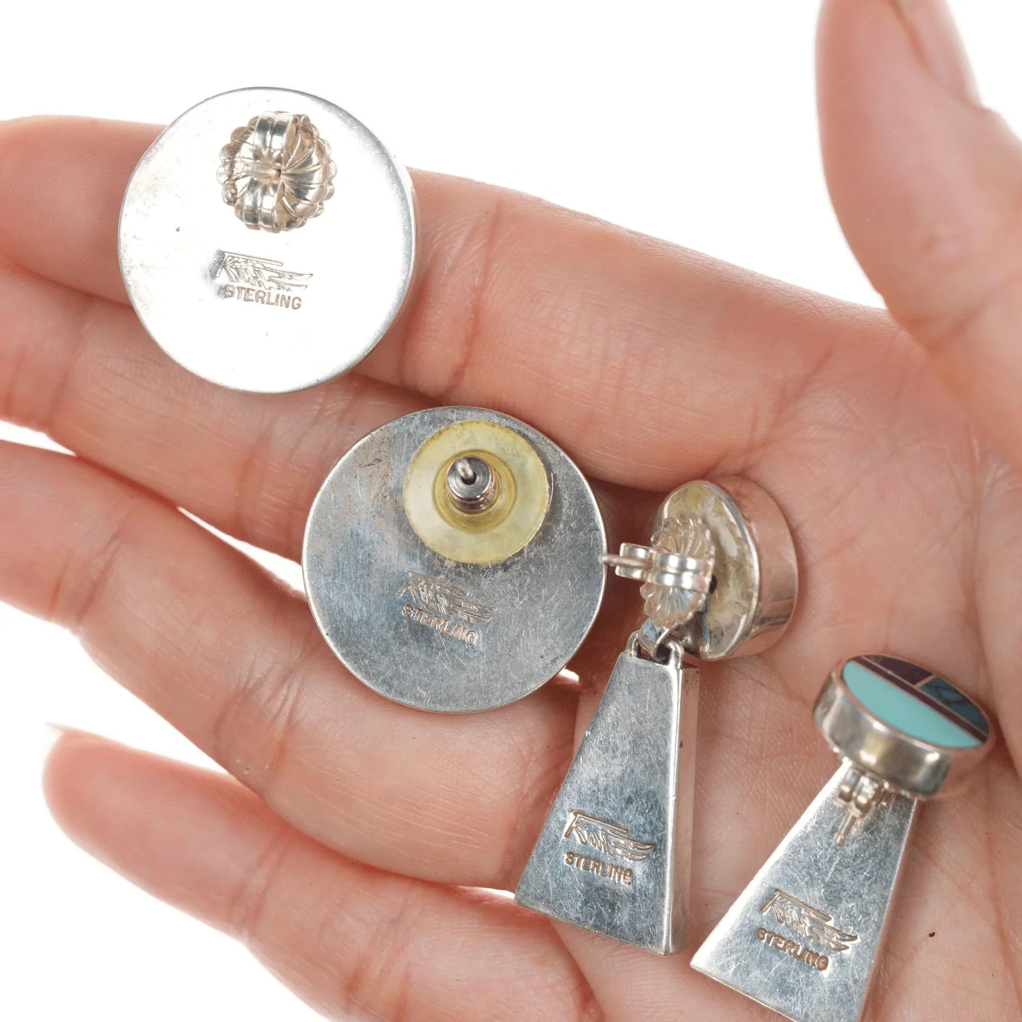 2pr 레이 트레이시 나이프윙 나바호 멀티 스톤 채널 인레이 스털링 이어링. 문제 없이 두 쌍 모두 판매합니다. 사진, 무게 및 사진의 기타 측정값에 표시된 대로 표시되거나 표시되지 않습니다. 죄송합니다. 제 보석은 안전한 장소에 보관되어 있으며 판매될 때까지 더 많은 사진, 비디오 또는 측정을 위해 접근할 수 없습니다. 사진/설명을 보면 귀하의 질문에 대한 답이 나올 것입니다. 귀하의 시간과 배려에 진심으로 감사드립니다!