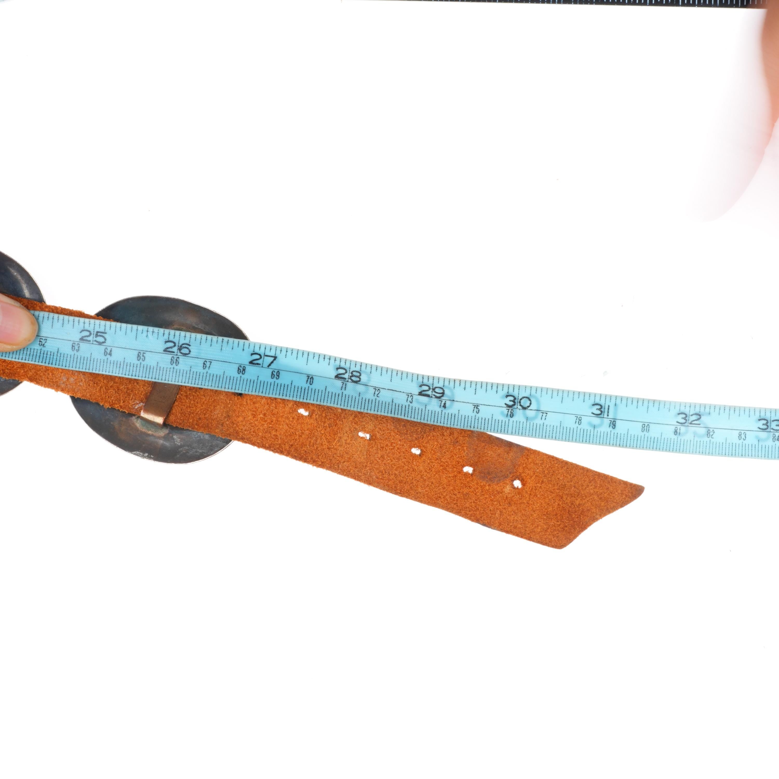 30" Vintage Navajo sterling silver plain silver concho belt w/mustache buckle. Tested and guaranteed solid sterling silver with weight and measurements in pictures. Fully functional. Fits up to a 30" waist with added holes, great condition, circa third quarter of the 20th century. 9 Conchos, 1 buckle.