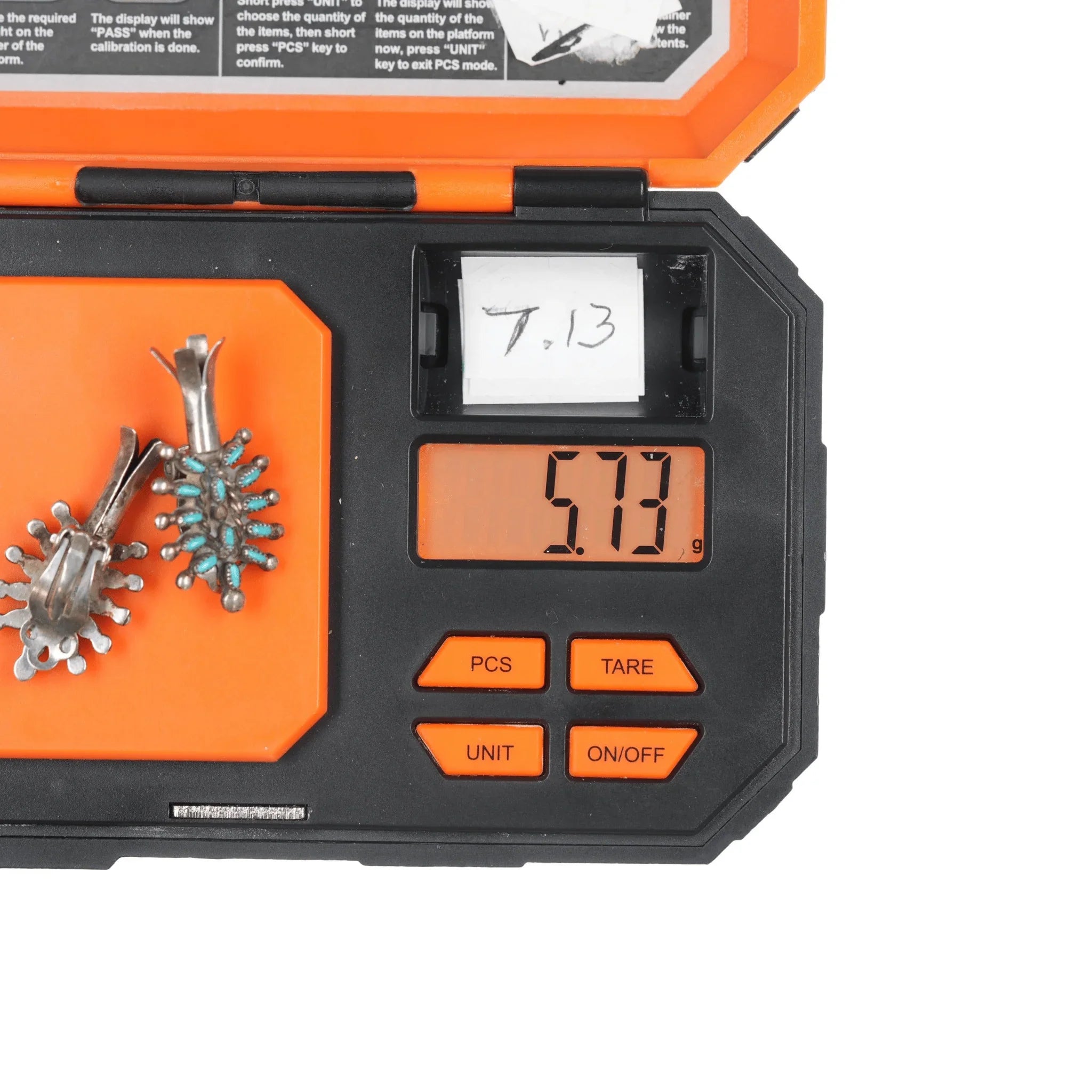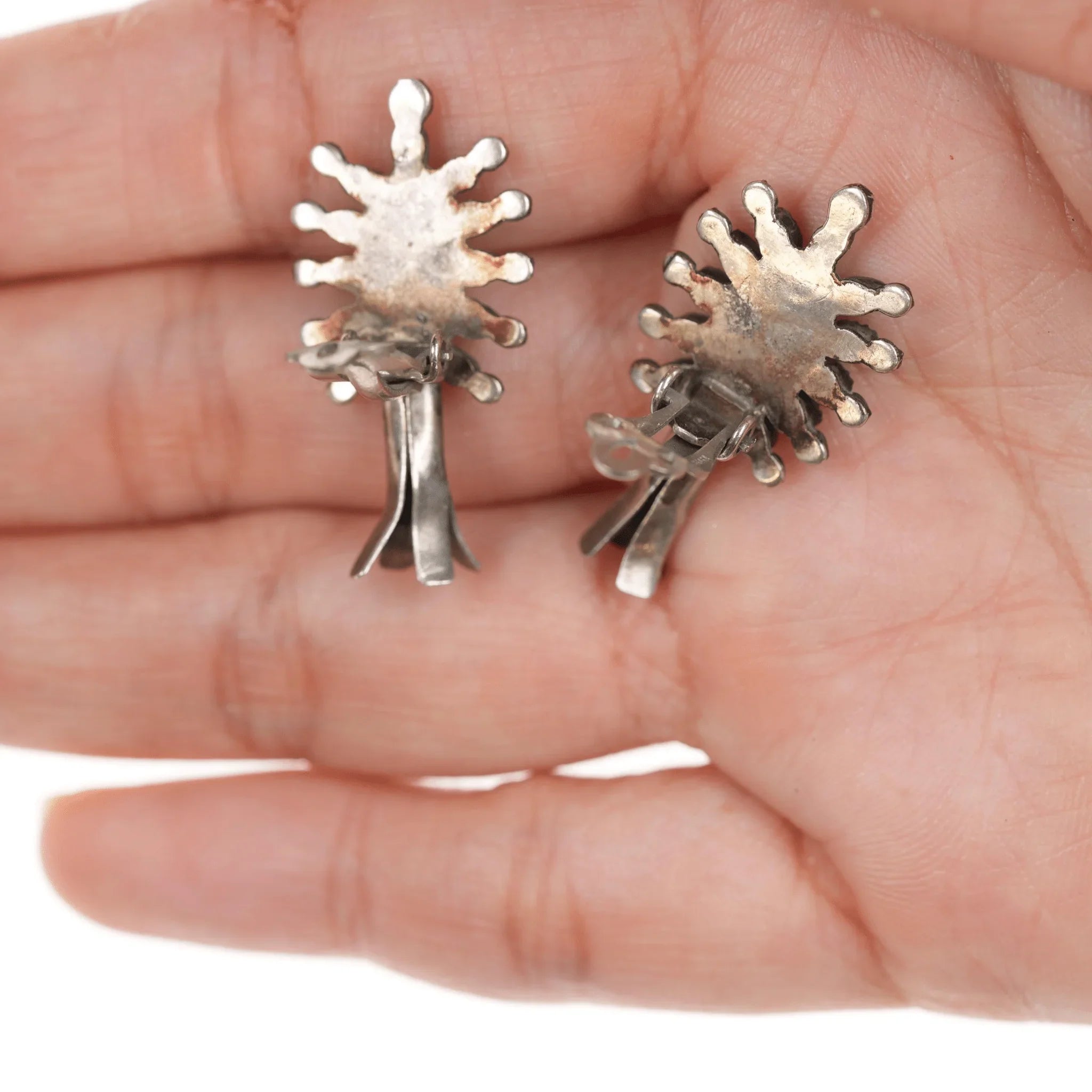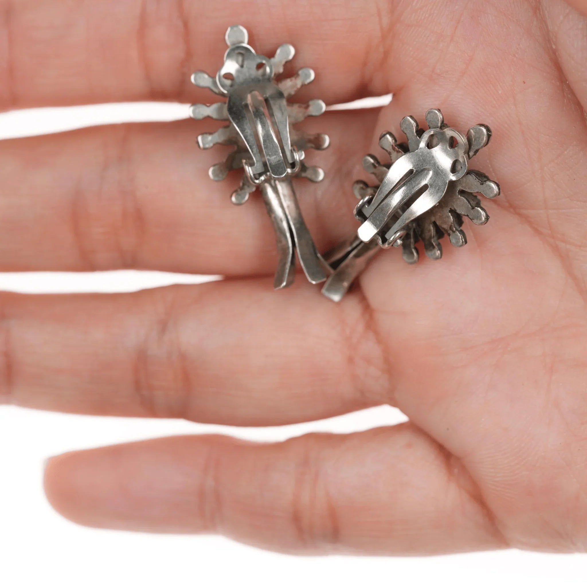 40's-50's Zuni Needlepoint turquoise silver squash blossom clip on earrings. Nice natural turquoise, most likely sleeping beauty. Likely made from an old Squash blossom necklace. 1.25" tall.
