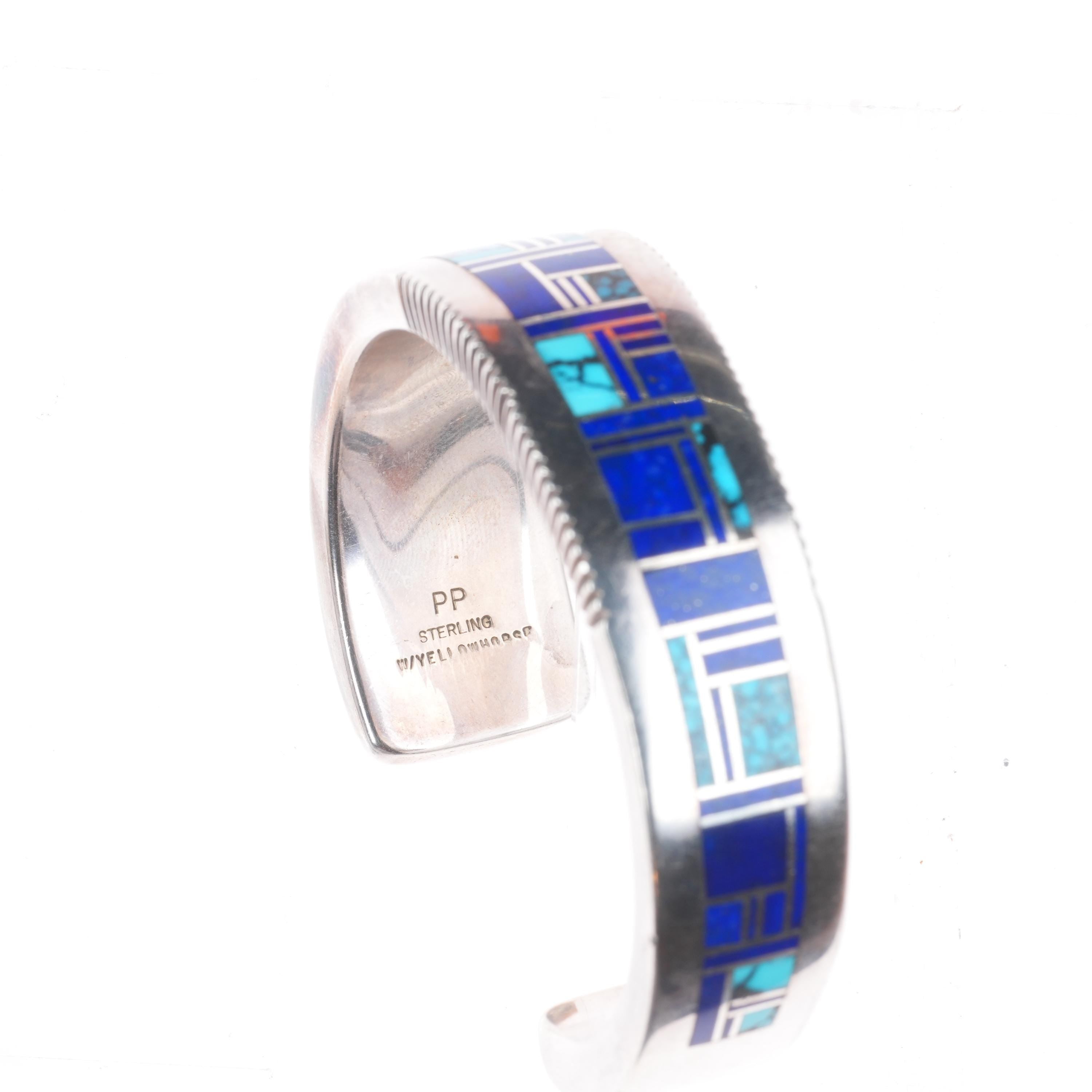 6.2" Patricia Platero/Yellowhorse Navajo sterling silver lapis/turquoise cuff bracelet. Tested and guaranteed solid sterling silver with weight and measurements in pictures. Great condition with age appropriate wear, circa last quarter of the 20th century. Scale pic is off, approx 75-80 grams. One artist did the silverwork, the other the inlay.
