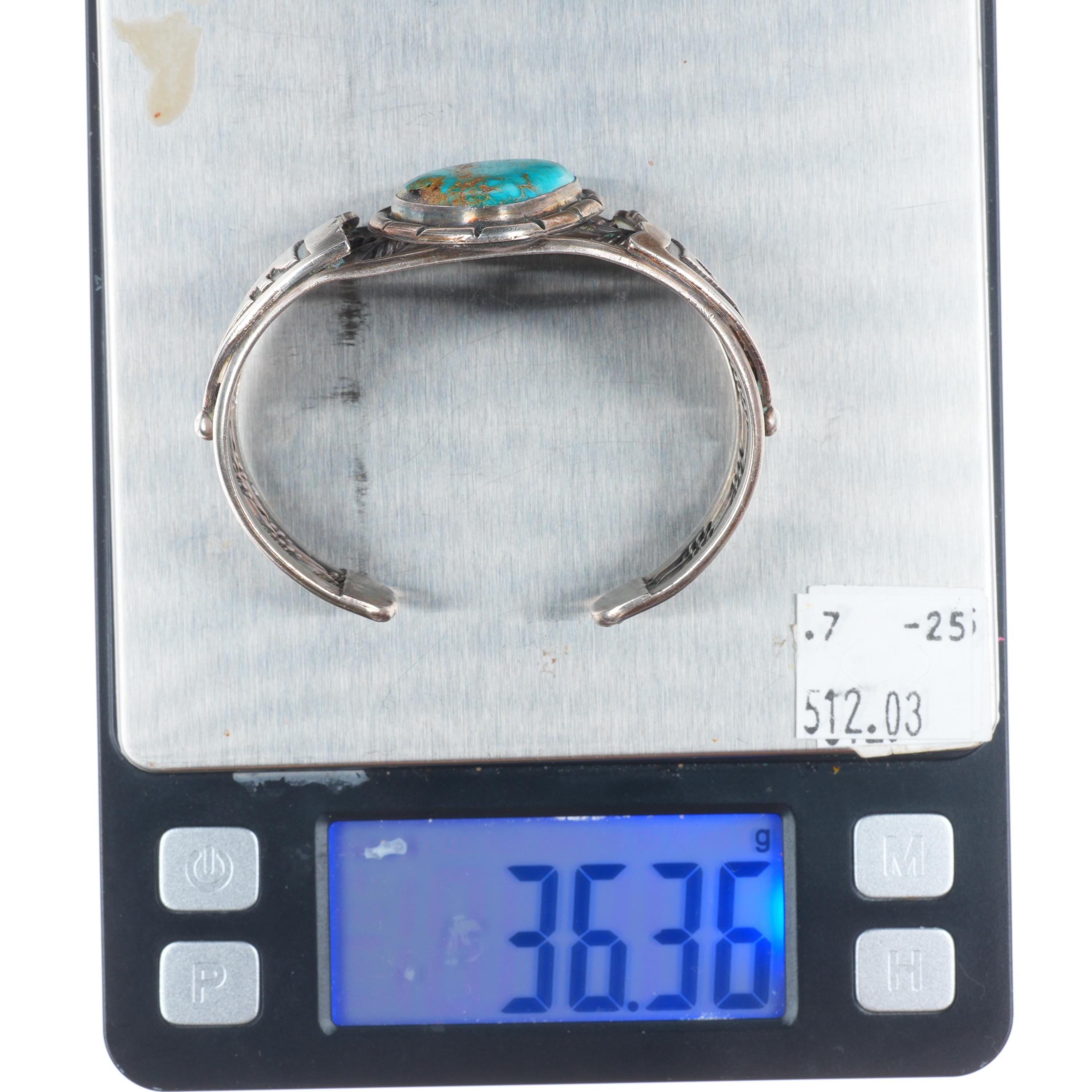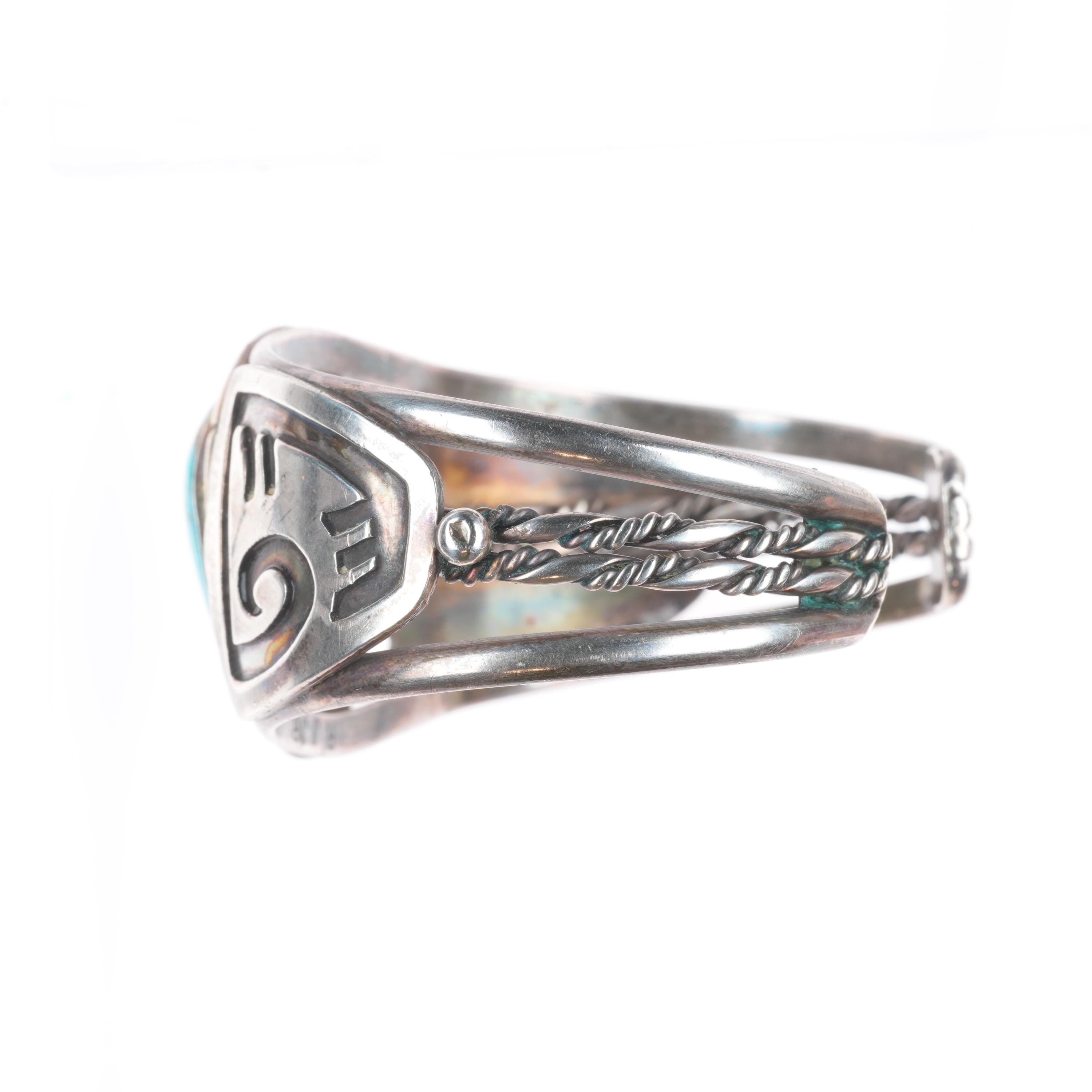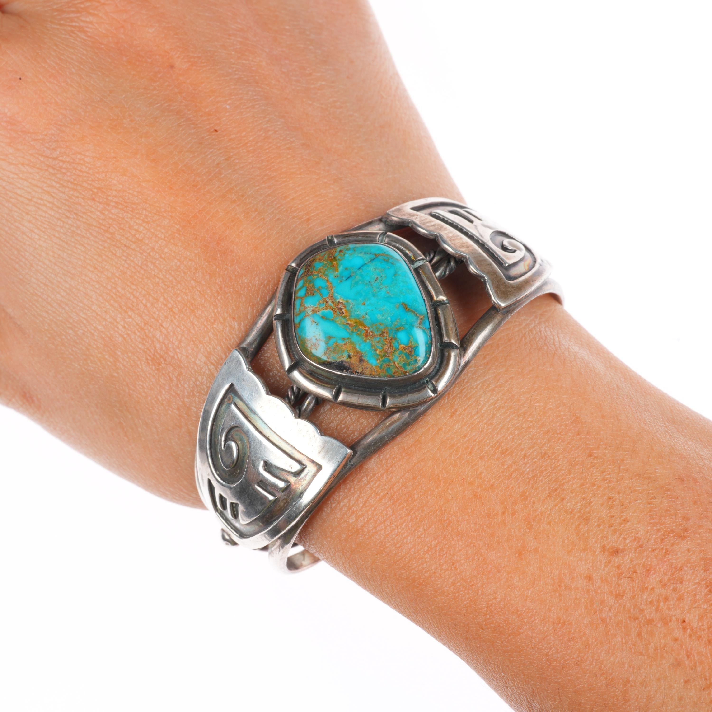 6.2" Vintage Navajo sterling silver high grade turquoise cuff bracelet RJ Jr. Tested and guaranteed solid sterling silver with weight and measurements in pictures. Circa third quarter of the 20th century with some expected age appropriate wear.