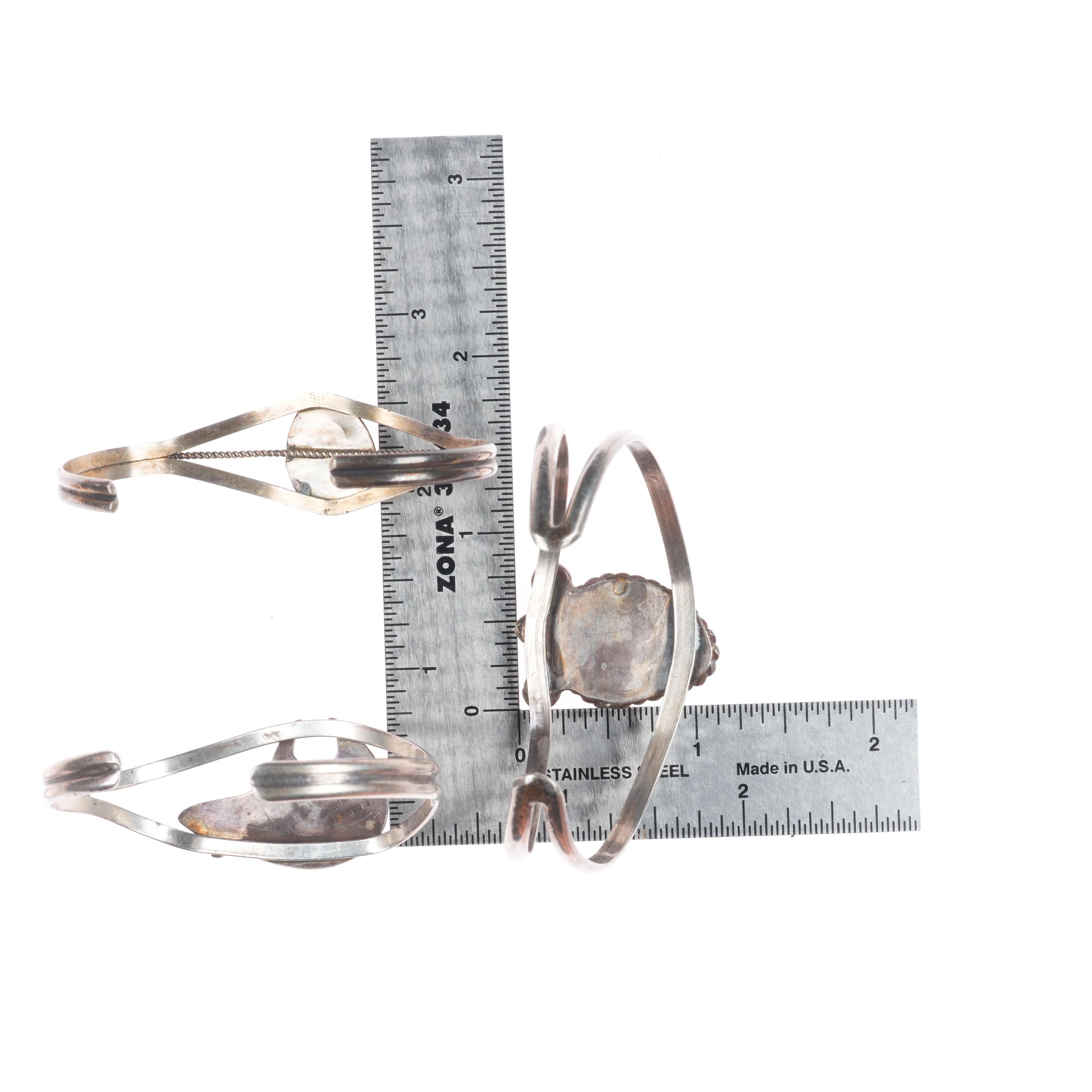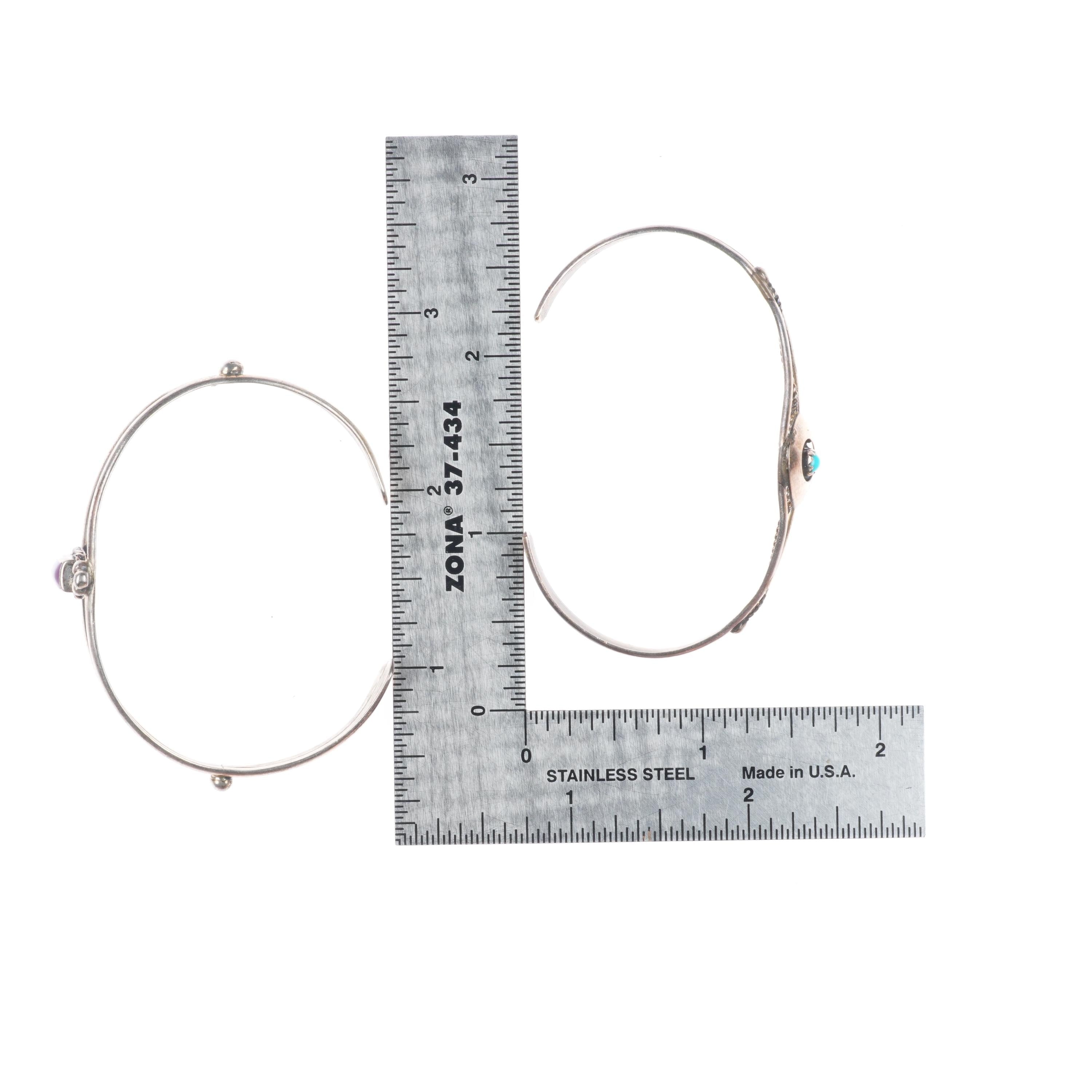 6.2" Vintage Navajo sterling silver turquoise/sugilite cuff bracelet lot. Tested and guaranteed solid sterling silver with weight and measurements in pictures. Great condition with age appropriate wear, circa last half of the 20th century. Apparently unmarked unless marks are shown in the pictures.. Sell the lot shown, all close to the same size.