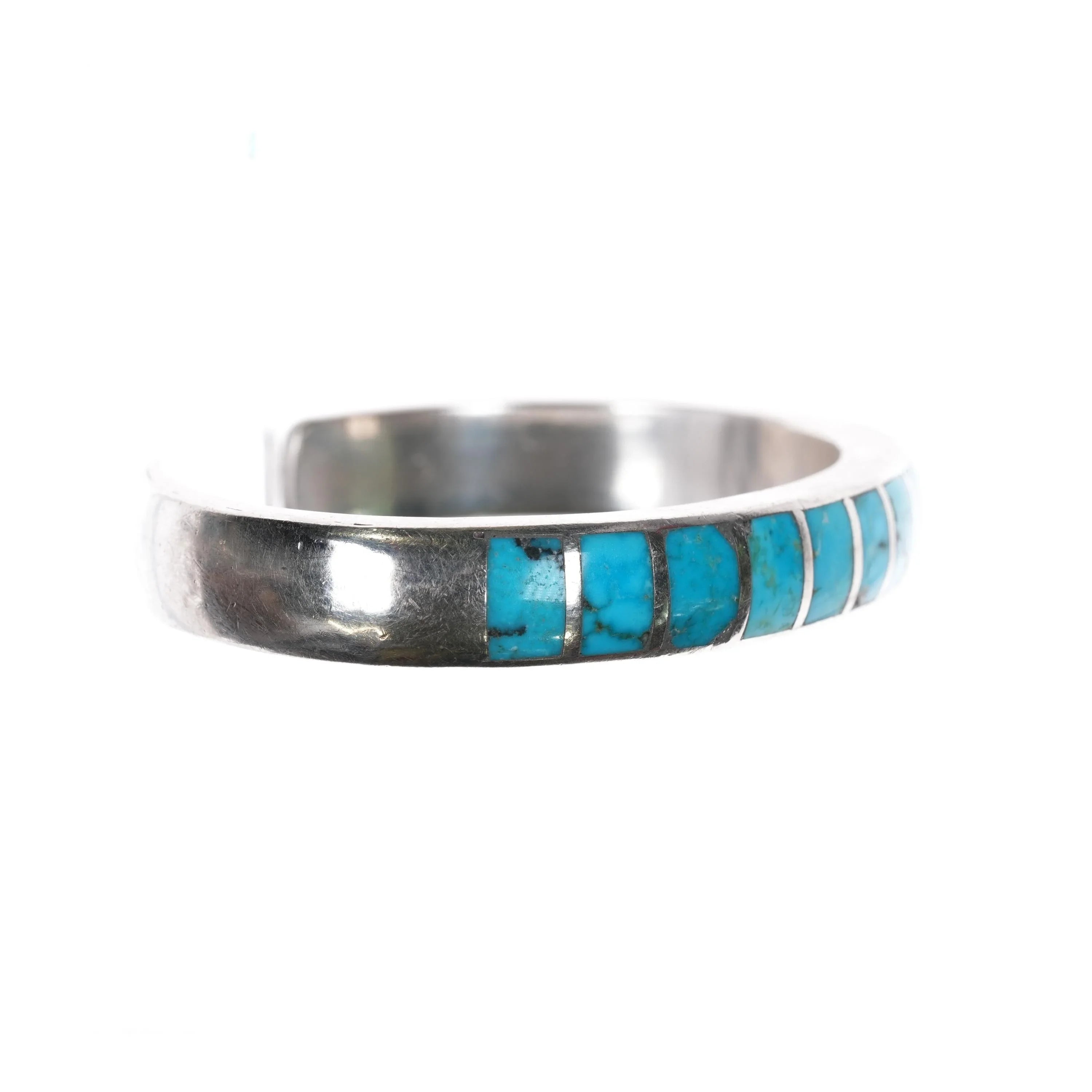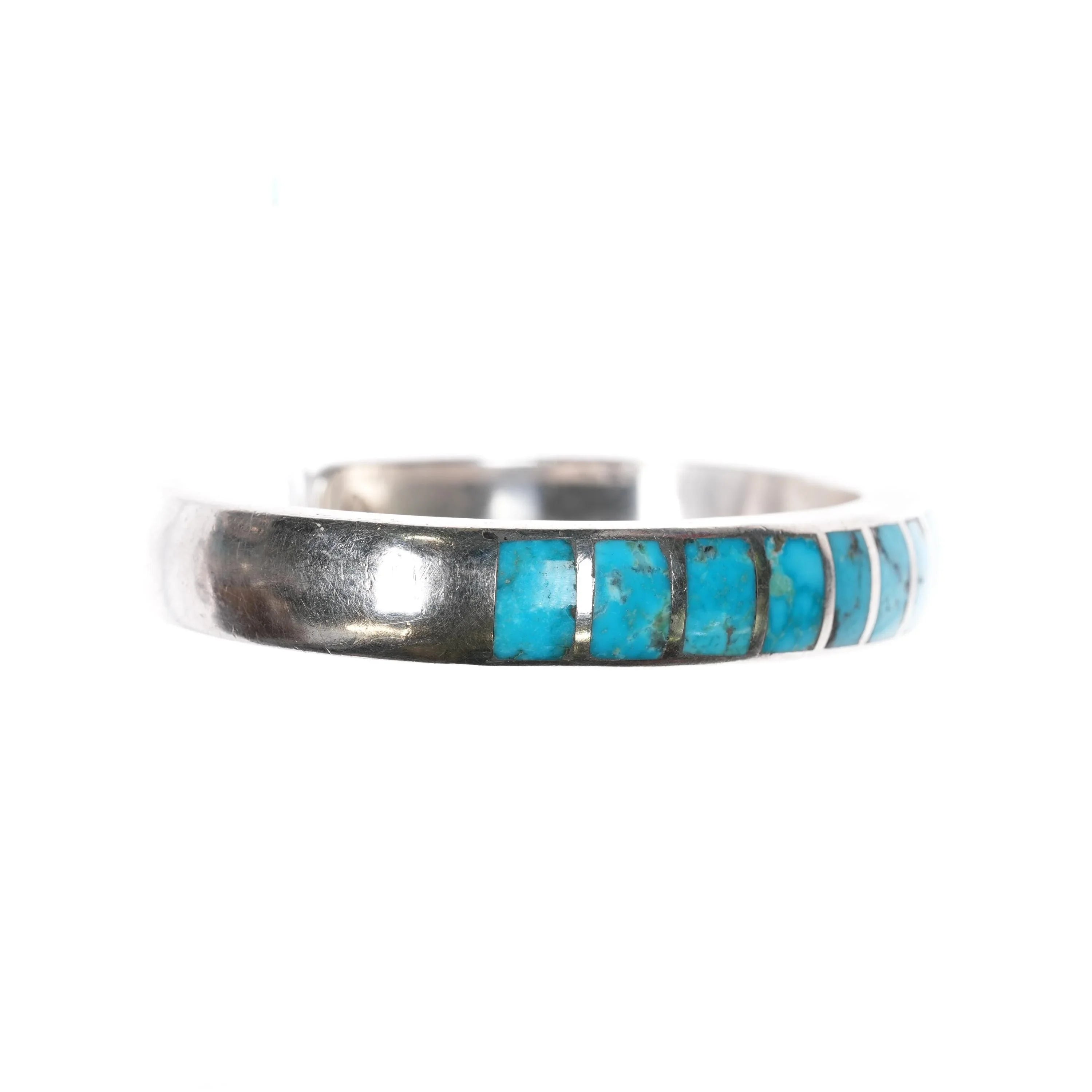 6.2" vintage Zuni sterling silver channel inlay turquoise row cuff bracelet. Weight and measurements in pictures, solid sterling silver with no issues. Minimal wear. Unmarked. Circa third quarter of the 20th century.