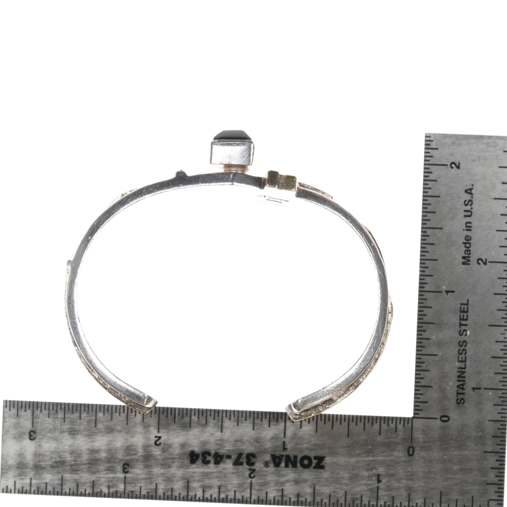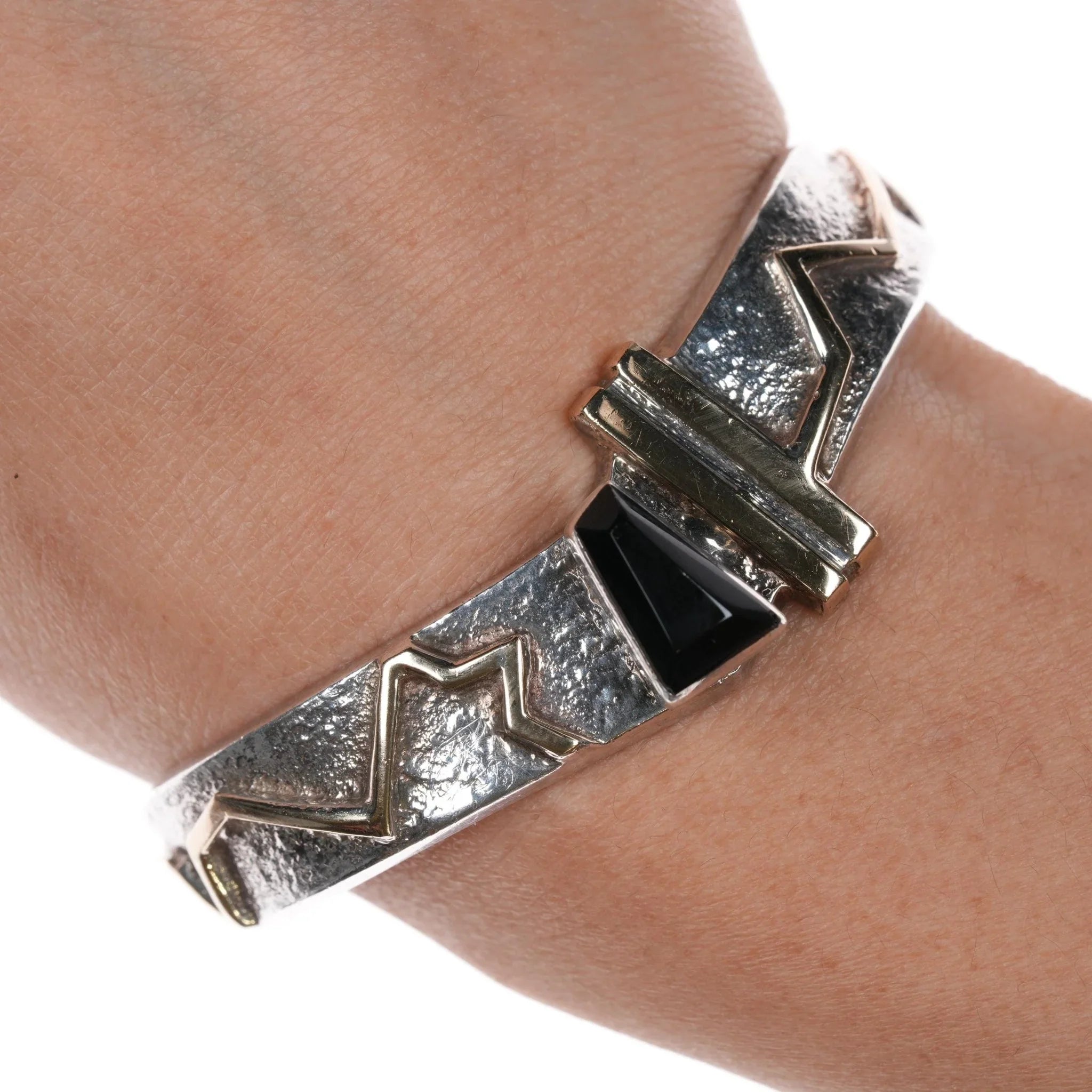 6.25" Nusie Henry Belon Navajo 14k/sterling post modernist cuff bracelet. I think my wife is wearing this backwards in the pics, sorry but hopefully you get the idea...or maybe think it looks better like this. Thick pieces of solid 14k gold on sterling, onyx stone. No issues, weight and measurements in pics. This is the Same Nusie that made jewelry with her husband George and Nusie Henry Navajo Artists. I believe this piece is circa 1980‘s., very well made piece from the last quarter of the 20th century in like new condition.