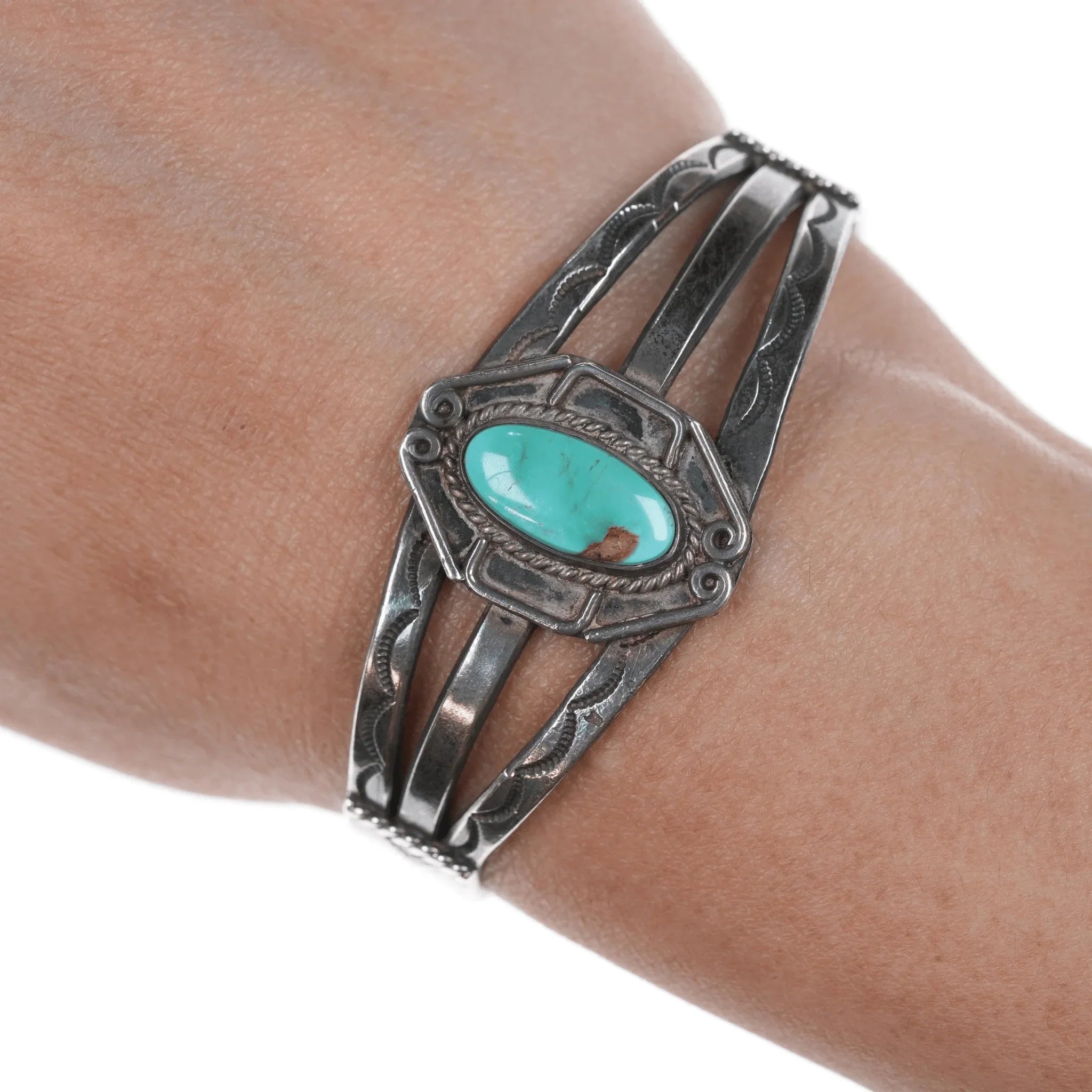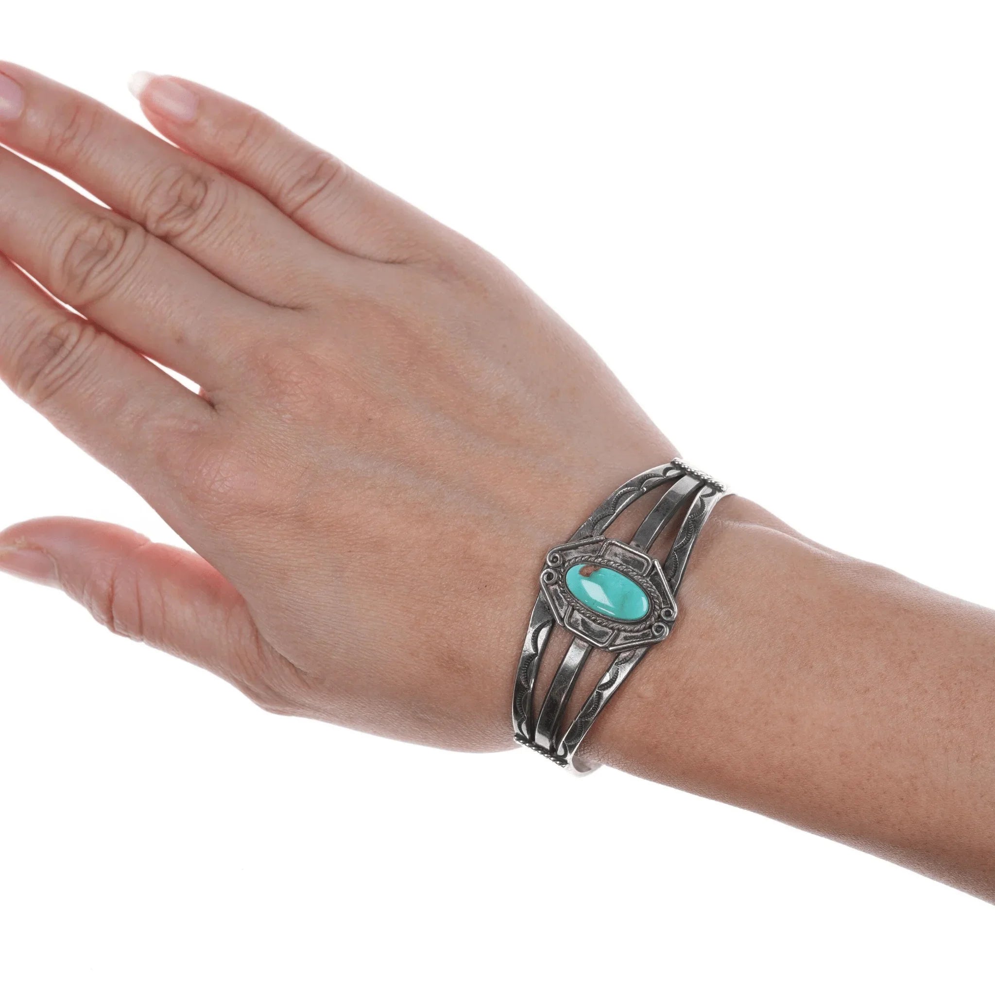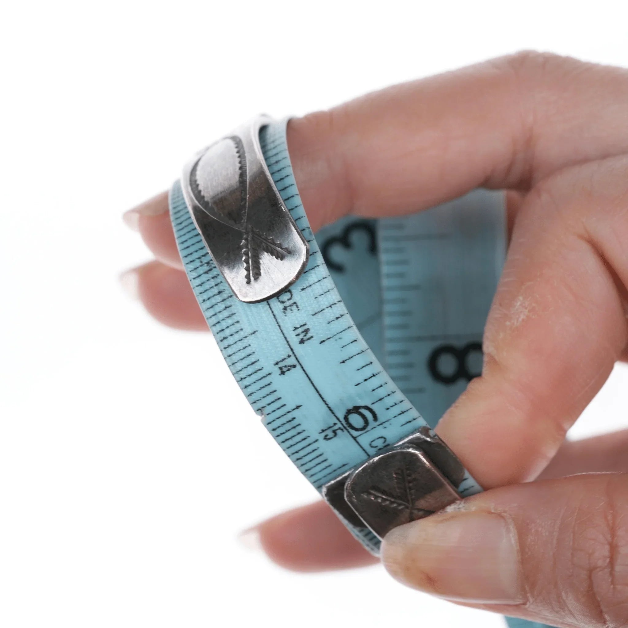 6" 30's-40's Navajo Hand stamped silver cuff bracelet with turquoise<br><br>Marked or unmarked as shown in pics, weight and other measurements in pics. Sorry but my jewelry is stored in a secure location and cannot be accessed for more pictures,<br>videos, or measurements until sold. If you look at pictures/description your<br>question should be answered. Thank you so much for your time and consideration!<br><br>All precious metals are tested and guaranteed. A Native American jewelry piece referred to as "silver" or "ingot" is guaranteed to be at least 90% silver. Bracelets are photographed on a 6" women's wrist.