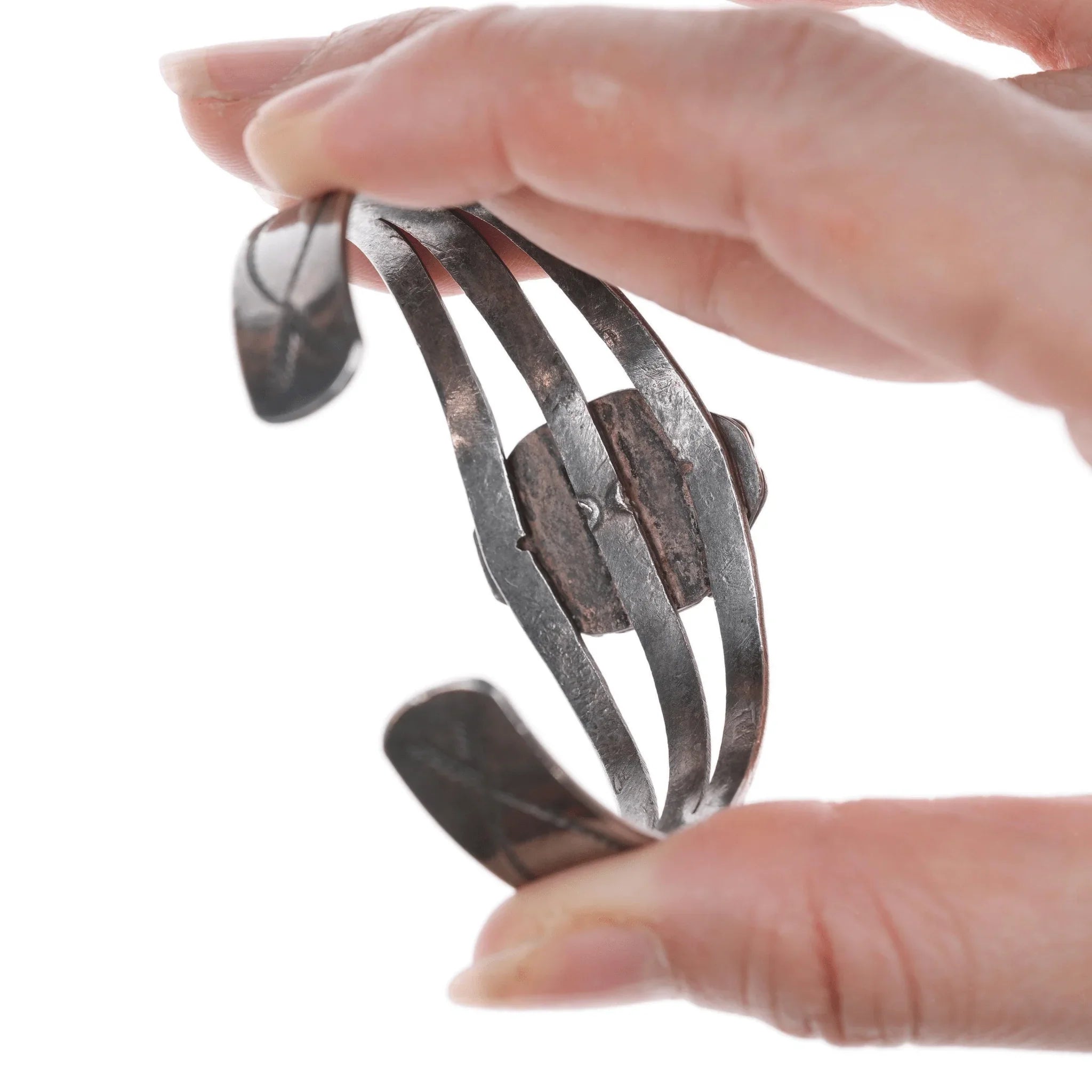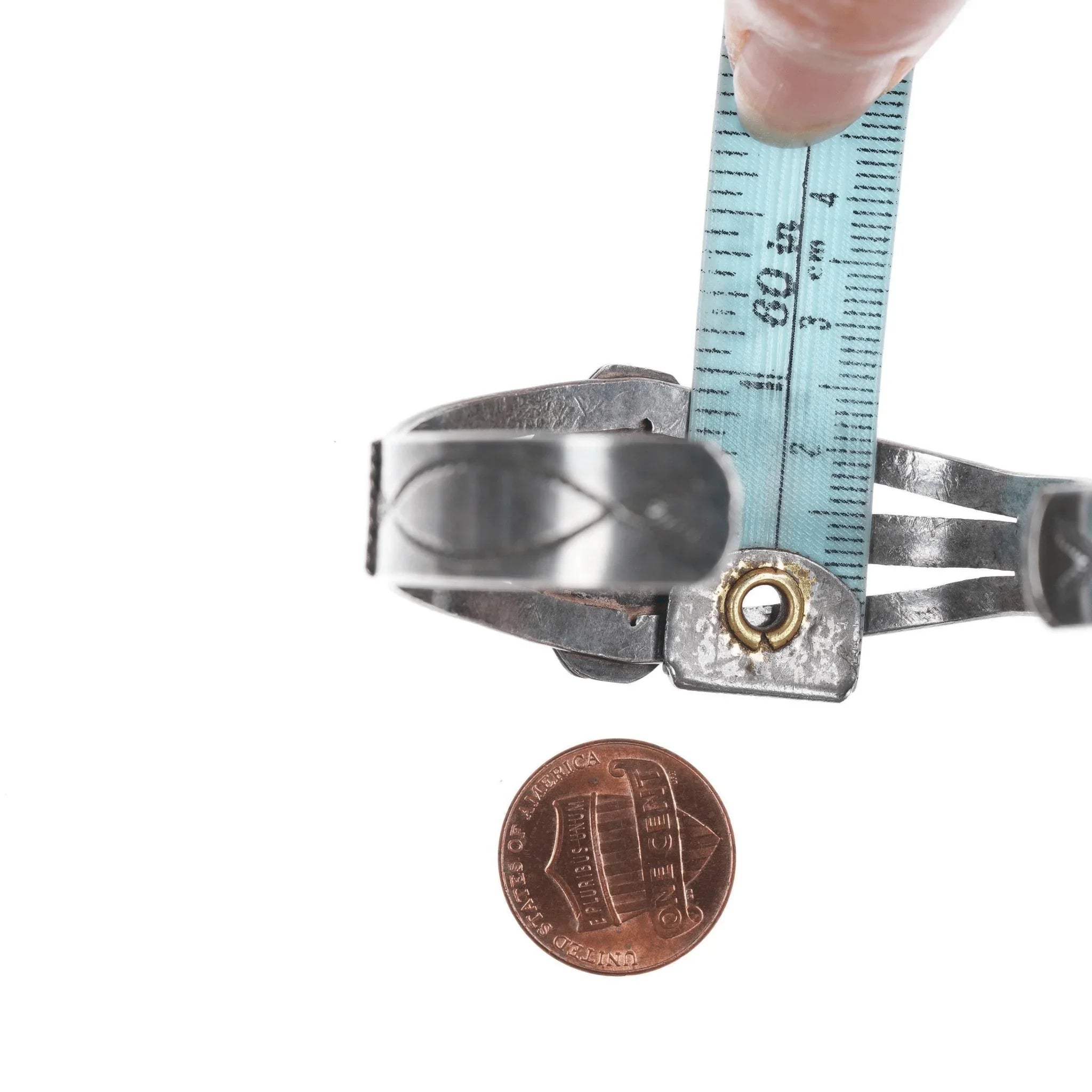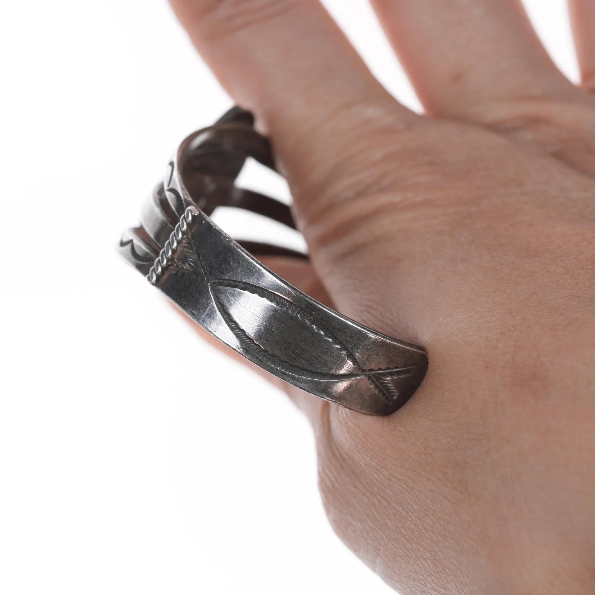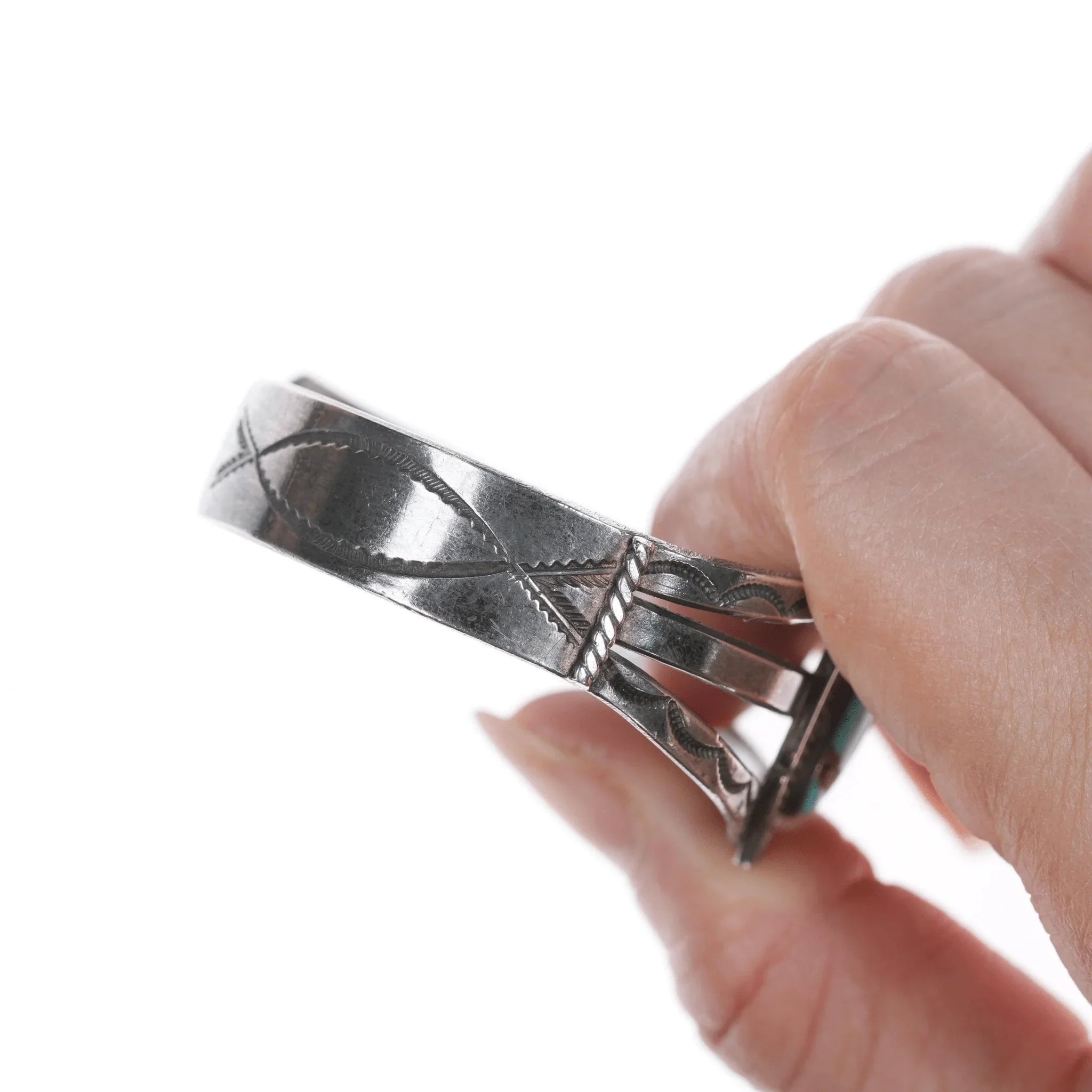 6" 30's-40's Navajo Hand stamped silver cuff bracelet with turquoise<br><br>Marked or unmarked as shown in pics, weight and other measurements in pics. Sorry but my jewelry is stored in a secure location and cannot be accessed for more pictures,<br>videos, or measurements until sold. If you look at pictures/description your<br>question should be answered. Thank you so much for your time and consideration!<br><br>All precious metals are tested and guaranteed. A Native American jewelry piece referred to as "silver" or "ingot" is guaranteed to be at least 90% silver. Bracelets are photographed on a 6" women's wrist.