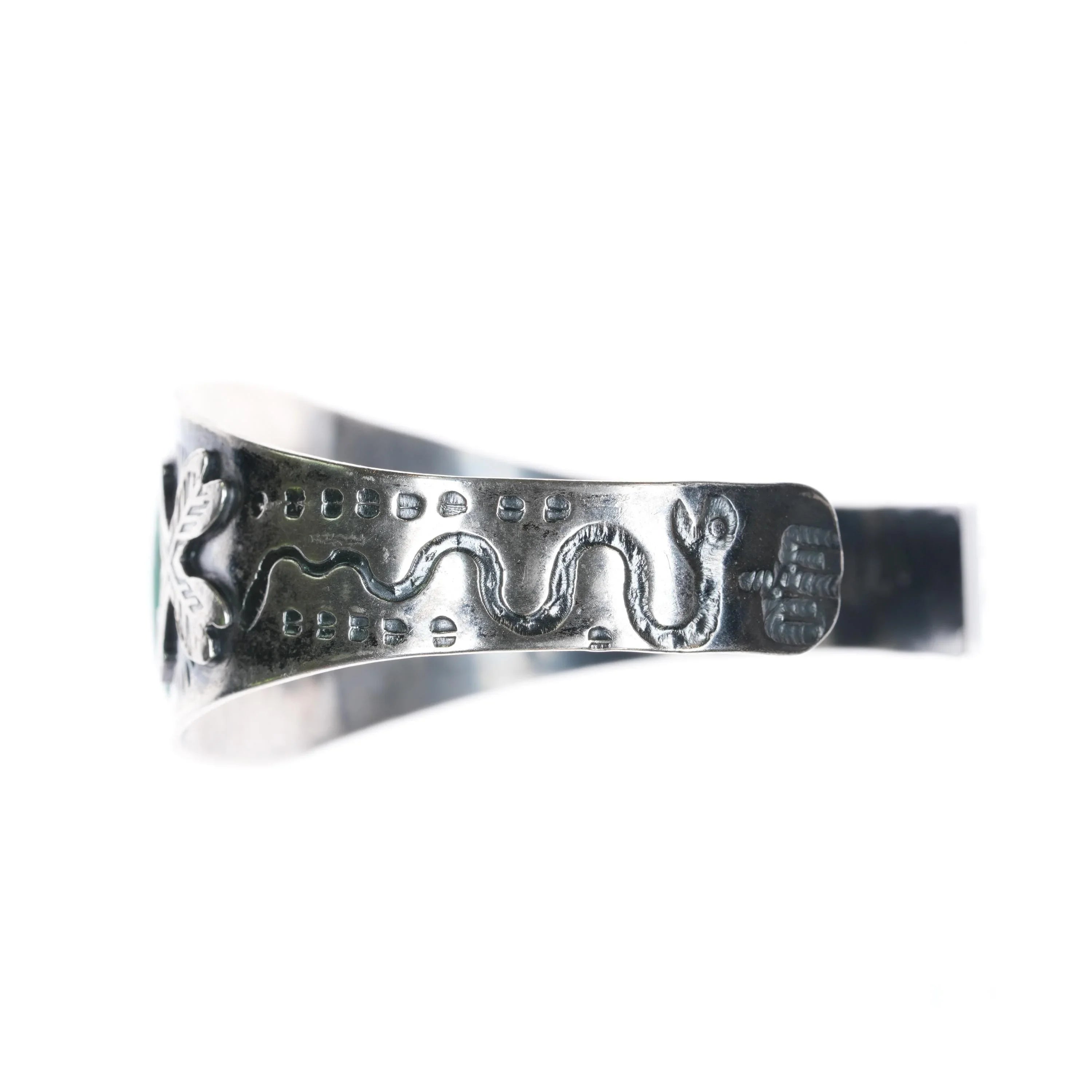 6.375" c1940‘s Fred Harvey Snakes and arrows sterling cuff bracelet w/turquoise Weight and measurements in pictures, solid sterling silver with no issues. Minimal wear.