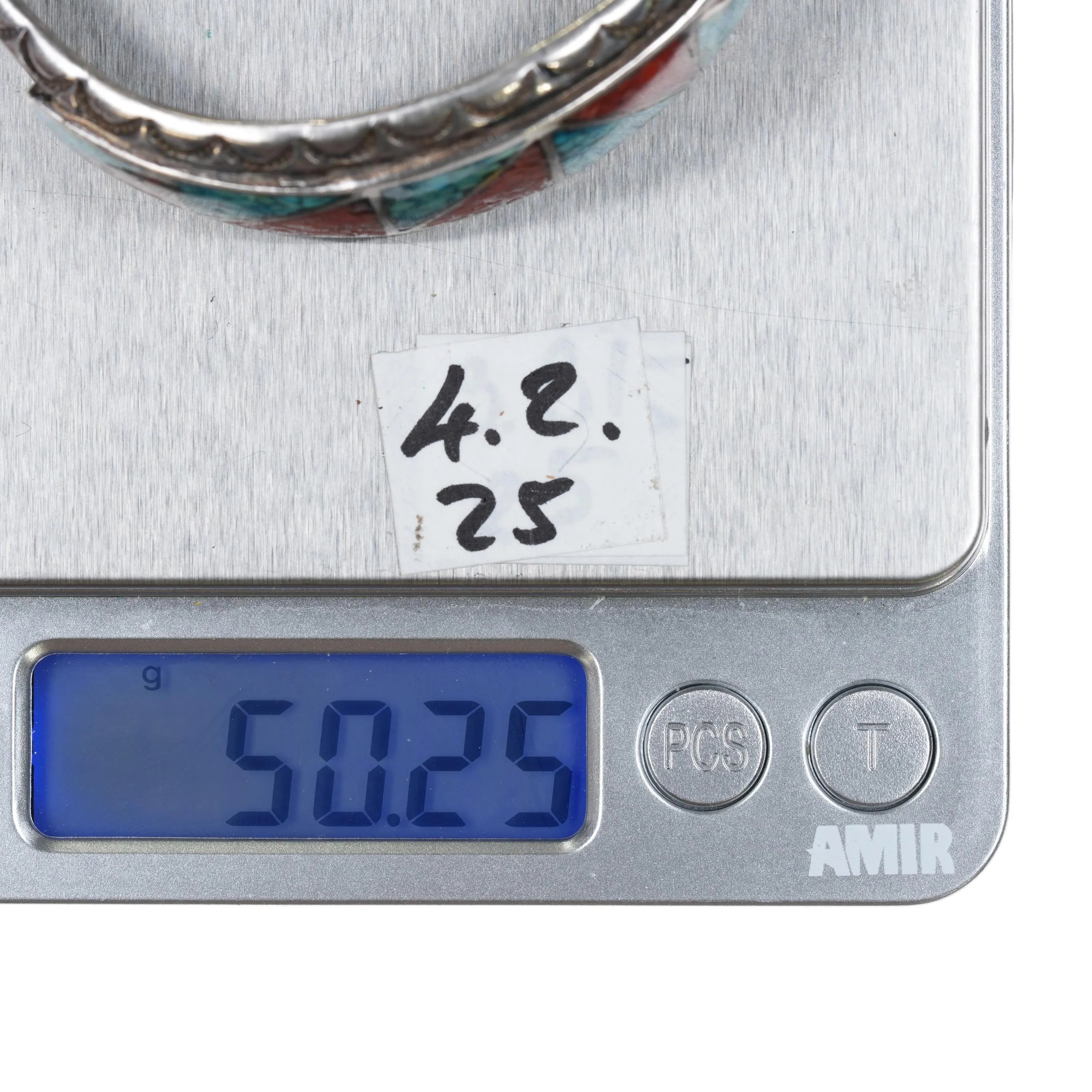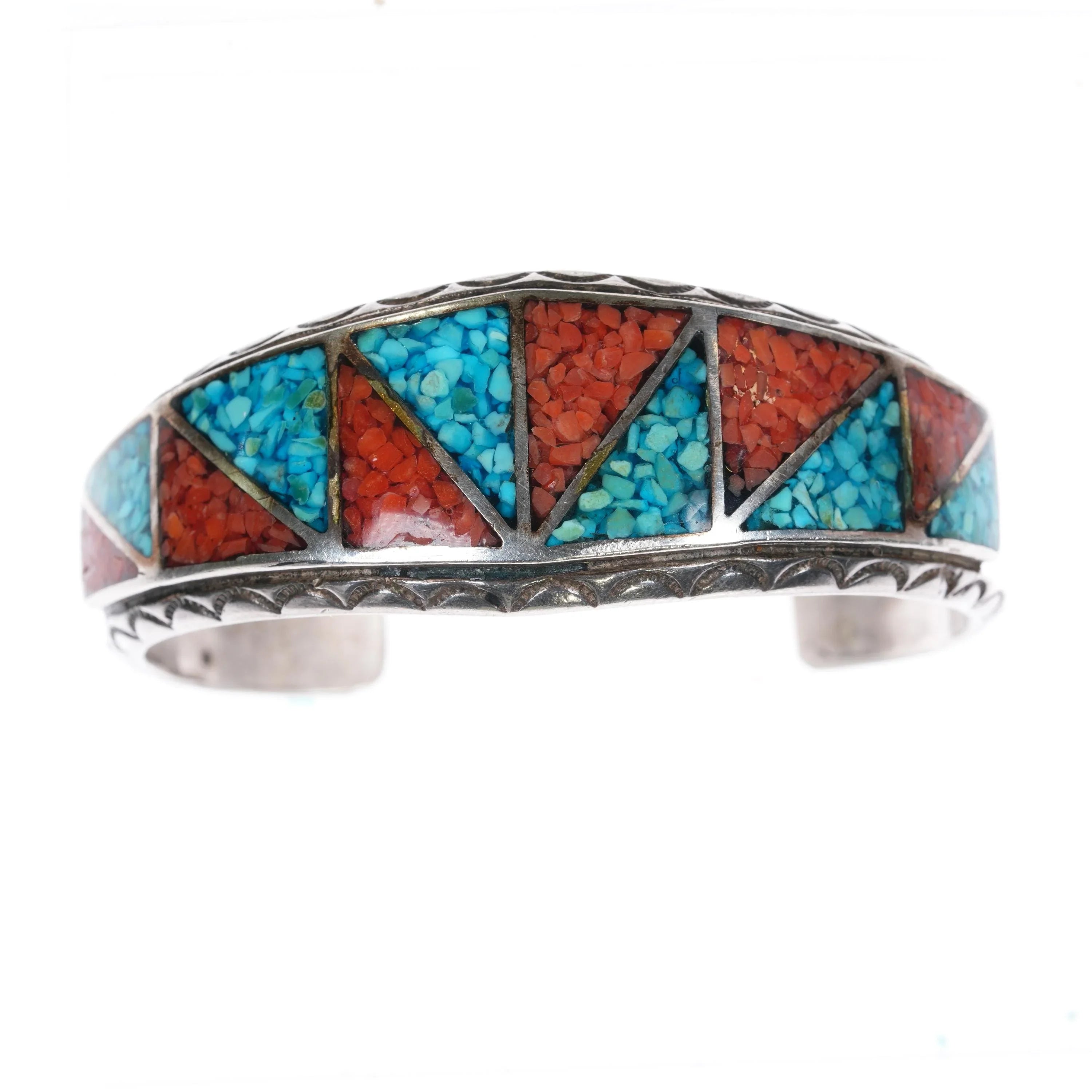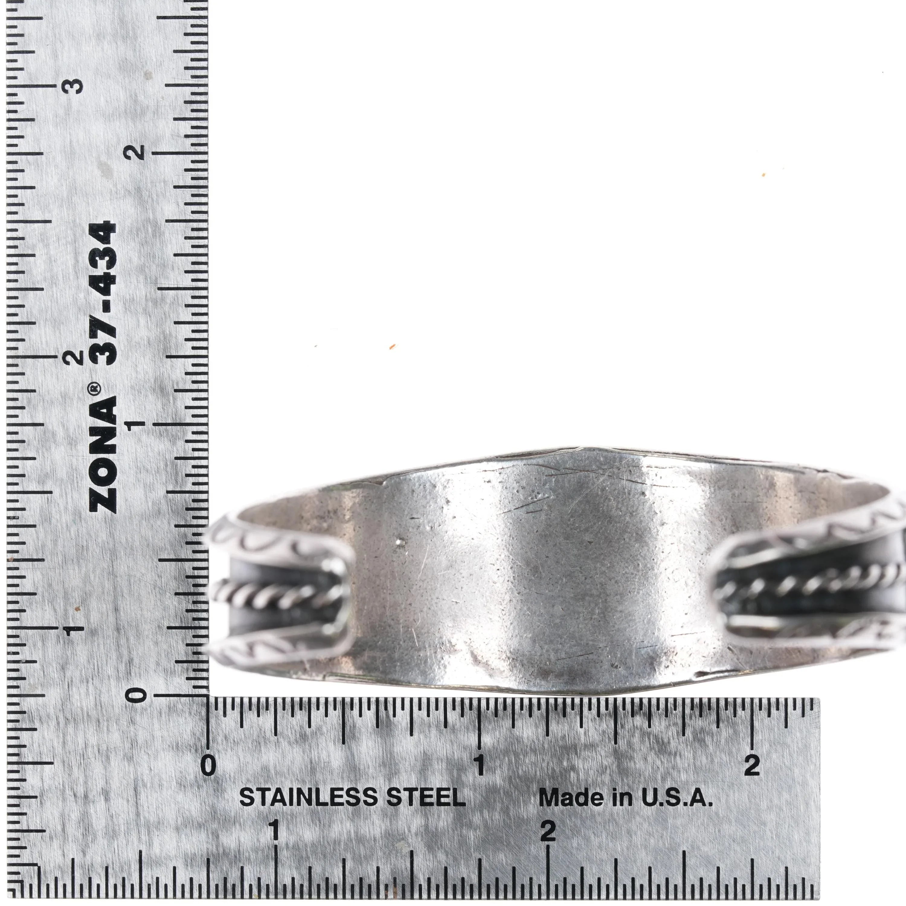 6.4" Vintage Navajo silver chip inlay geometric cuff bracelet nice stamped sides. Weight and measurements in pictures, solid sterling silver with no markings which is typical of Native American jewelry of this era c1960‘s-70‘s.