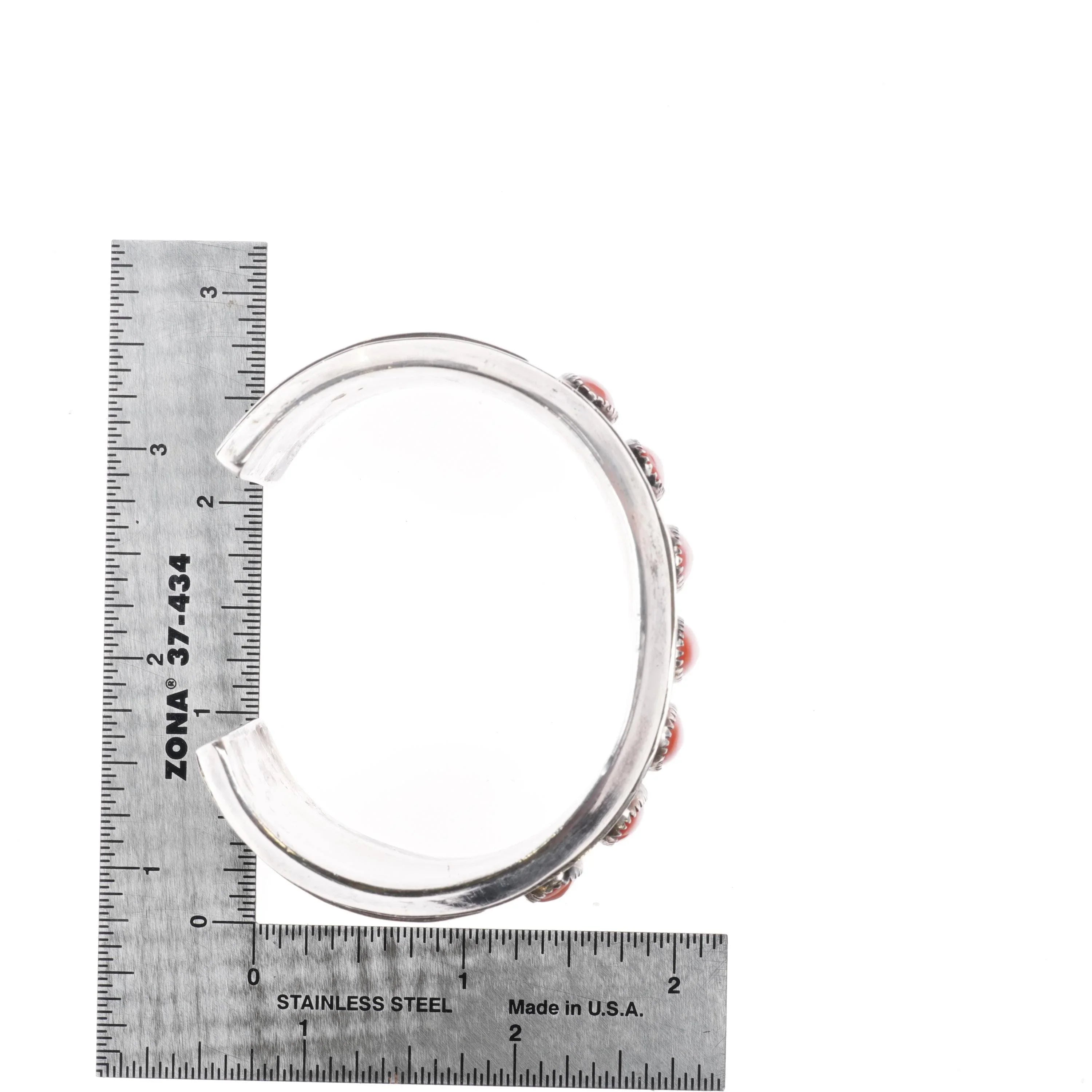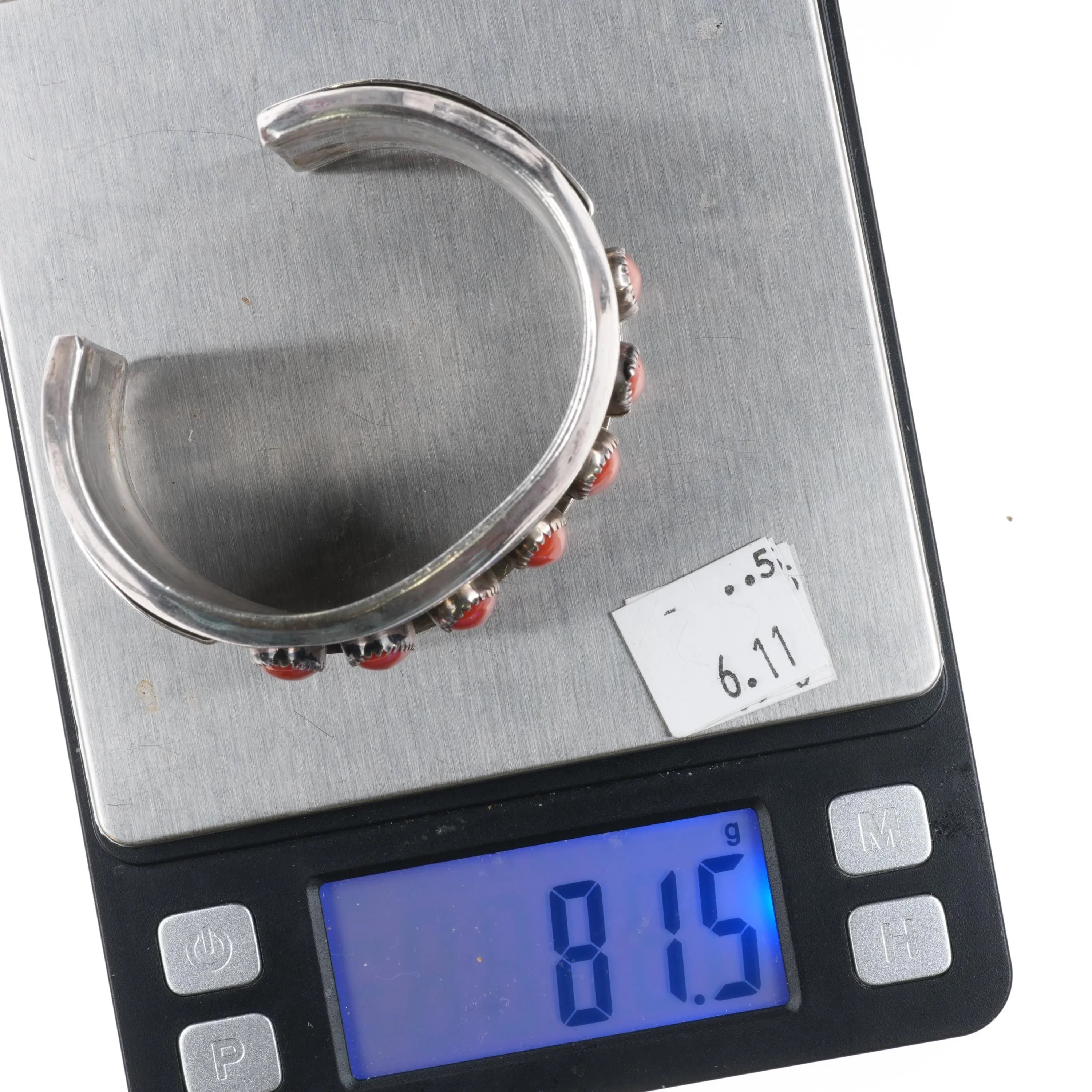6.5" Navajo Sterling silver Mediterranean coral row cuff bracelet. Tested and guaranteed solid sterling silver with no artists or purity markings. Weight and measurements in pictures. Some expected wear, no cracks or breaks. Circa third quarter of the 20th century.