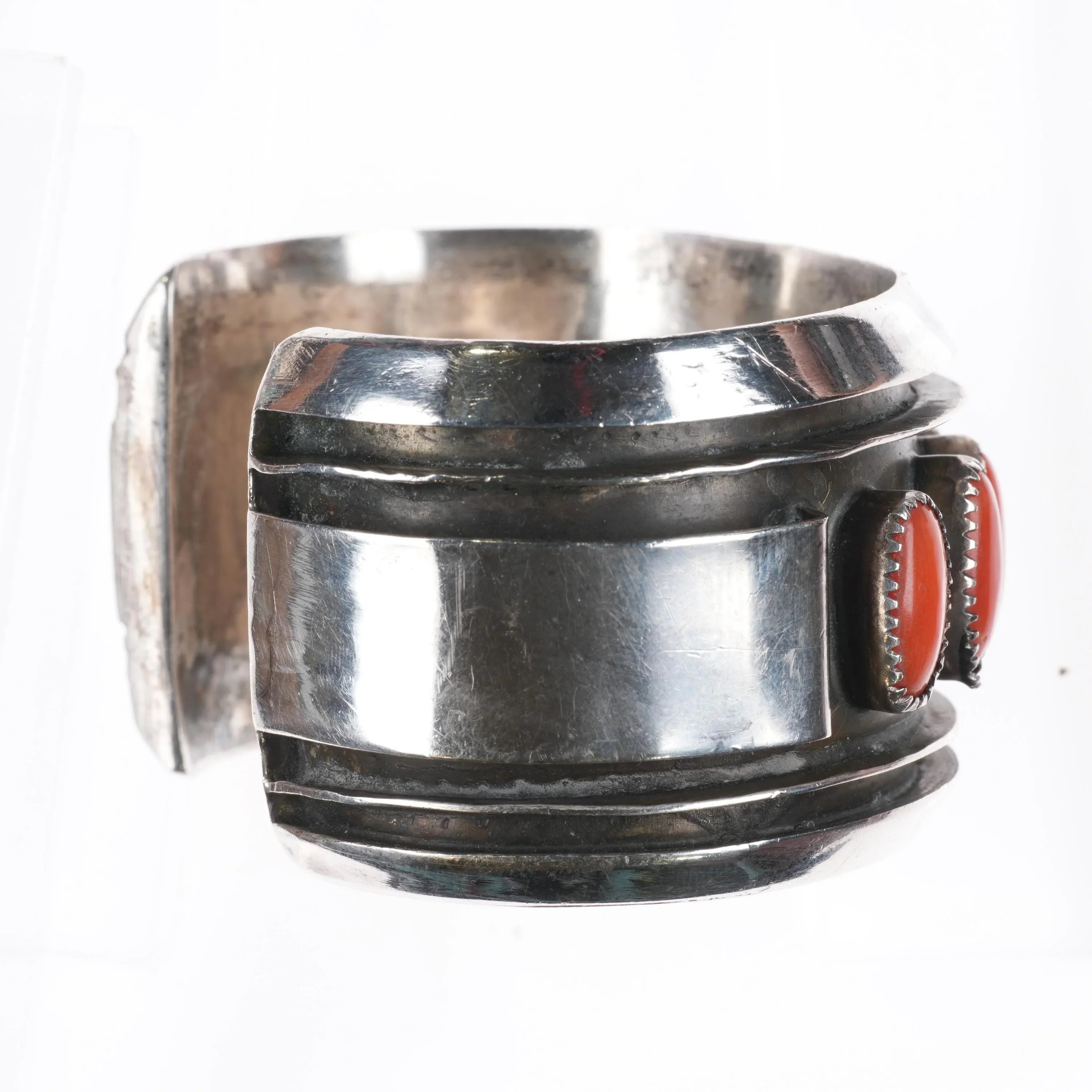6.5" 60's-70's Navajo Sterling silver Mediterranean coral row cuff bracelet