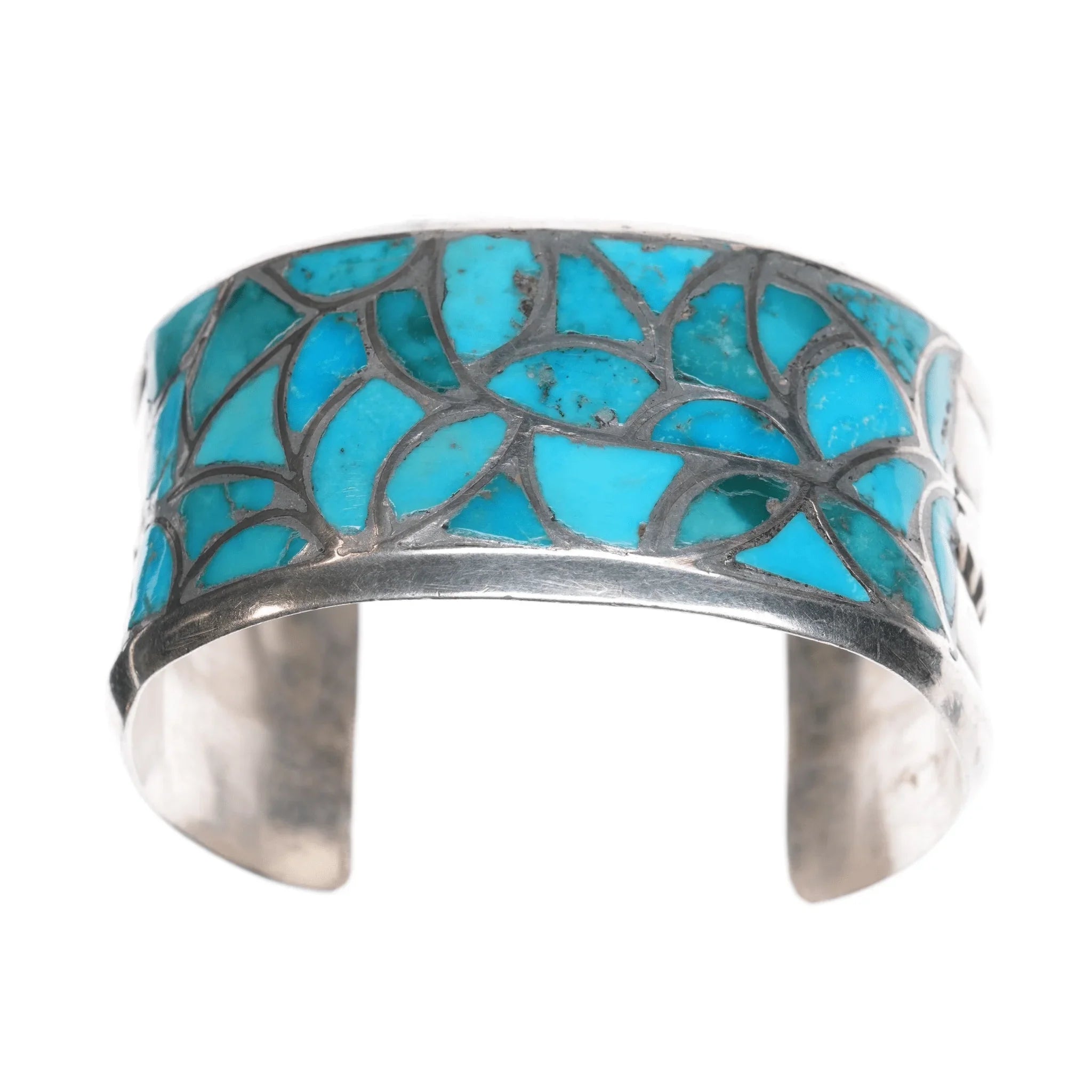 Zuni artist Alice Leekya Homer, active mid to late 20th century. The stones are slightly raised channel inlay, with what is called a fish scale design. Alice and family were well-known for this style of inlay. Alice was the daughter of Leekya Deyuse. The workmanship is perfect on this piece and the wonderful color changes of the turquoise from age in is beautiful!