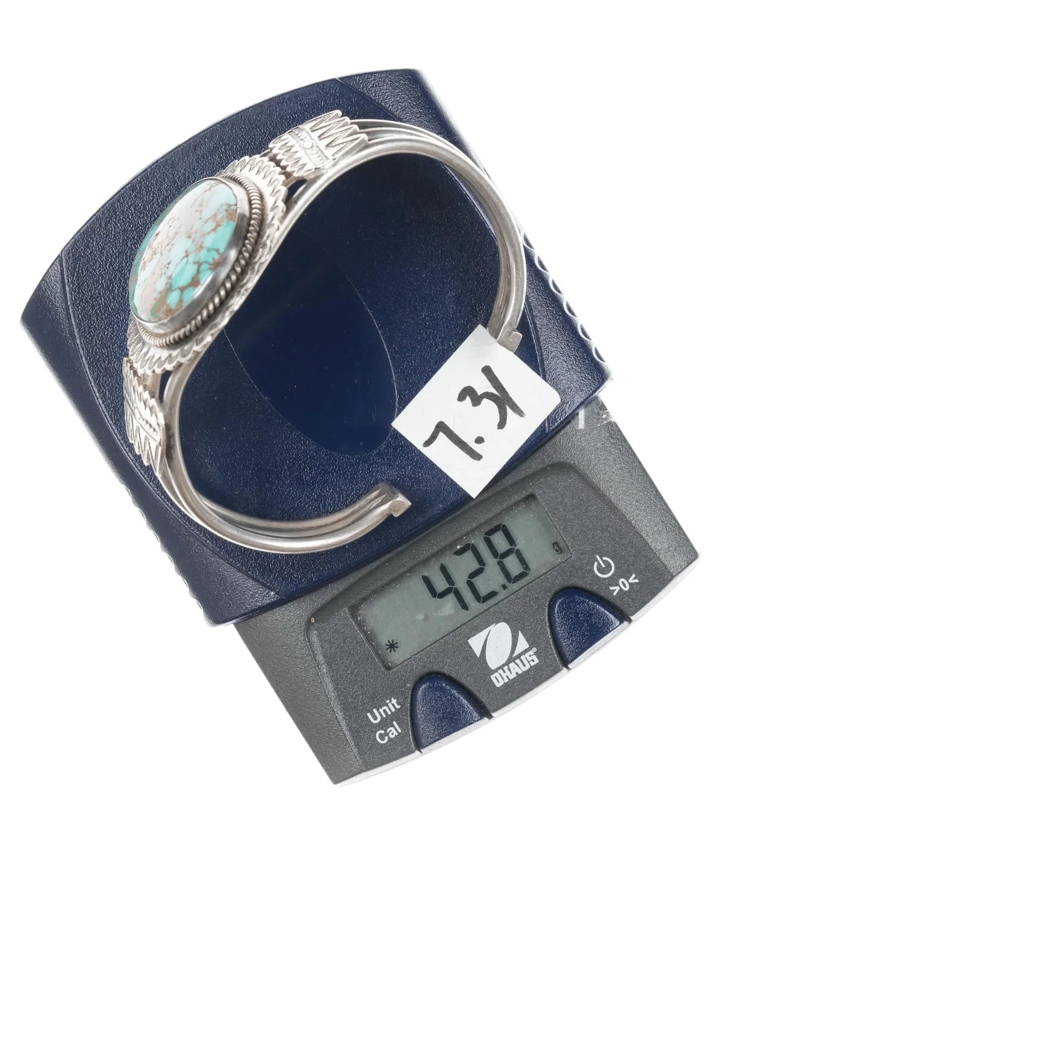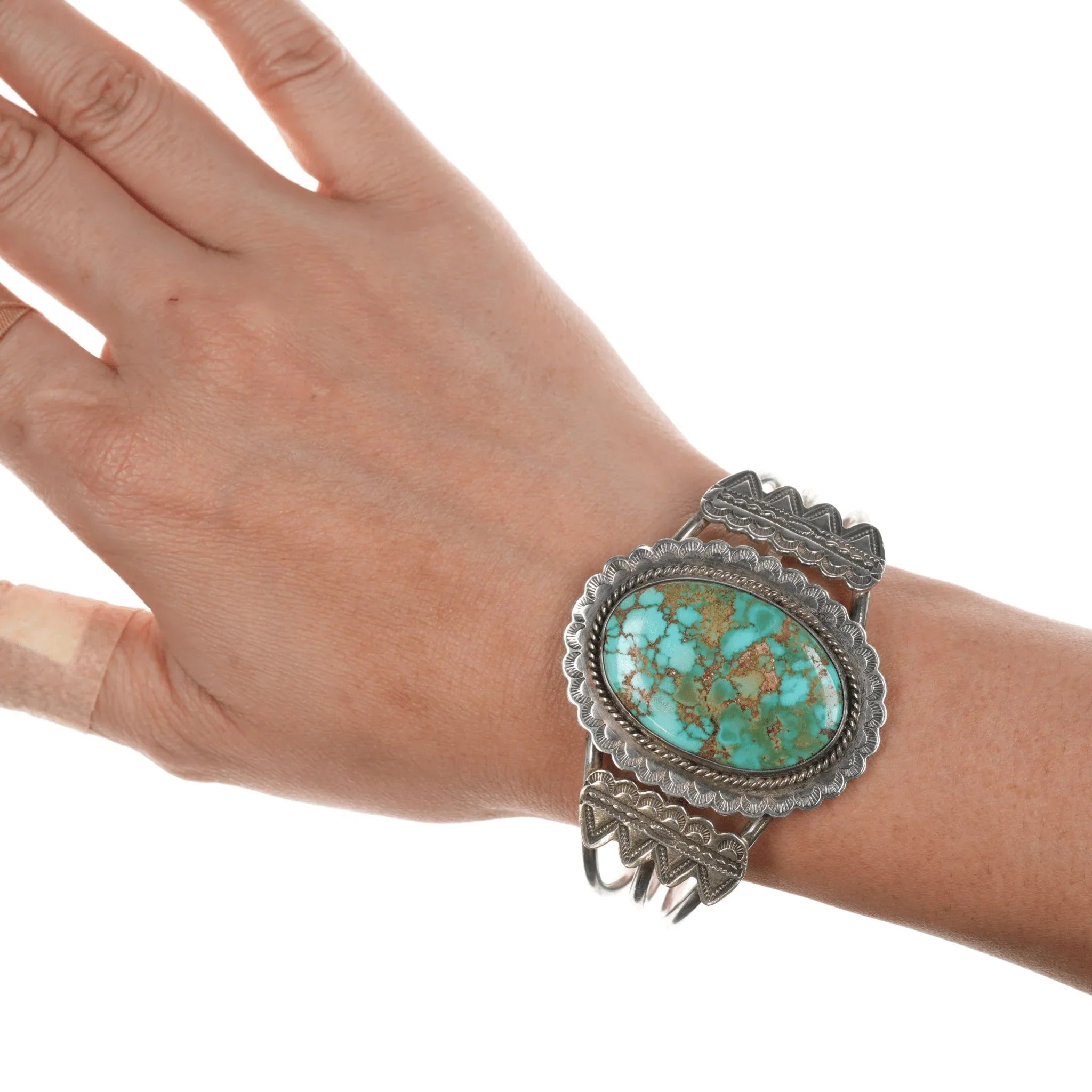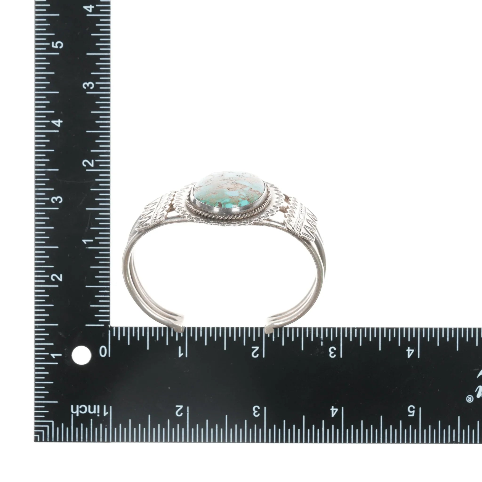 6.5" c 1930's Ingot silver high grade turquoise cuff bracelet 5.5" inside circumference plus 1" gap.