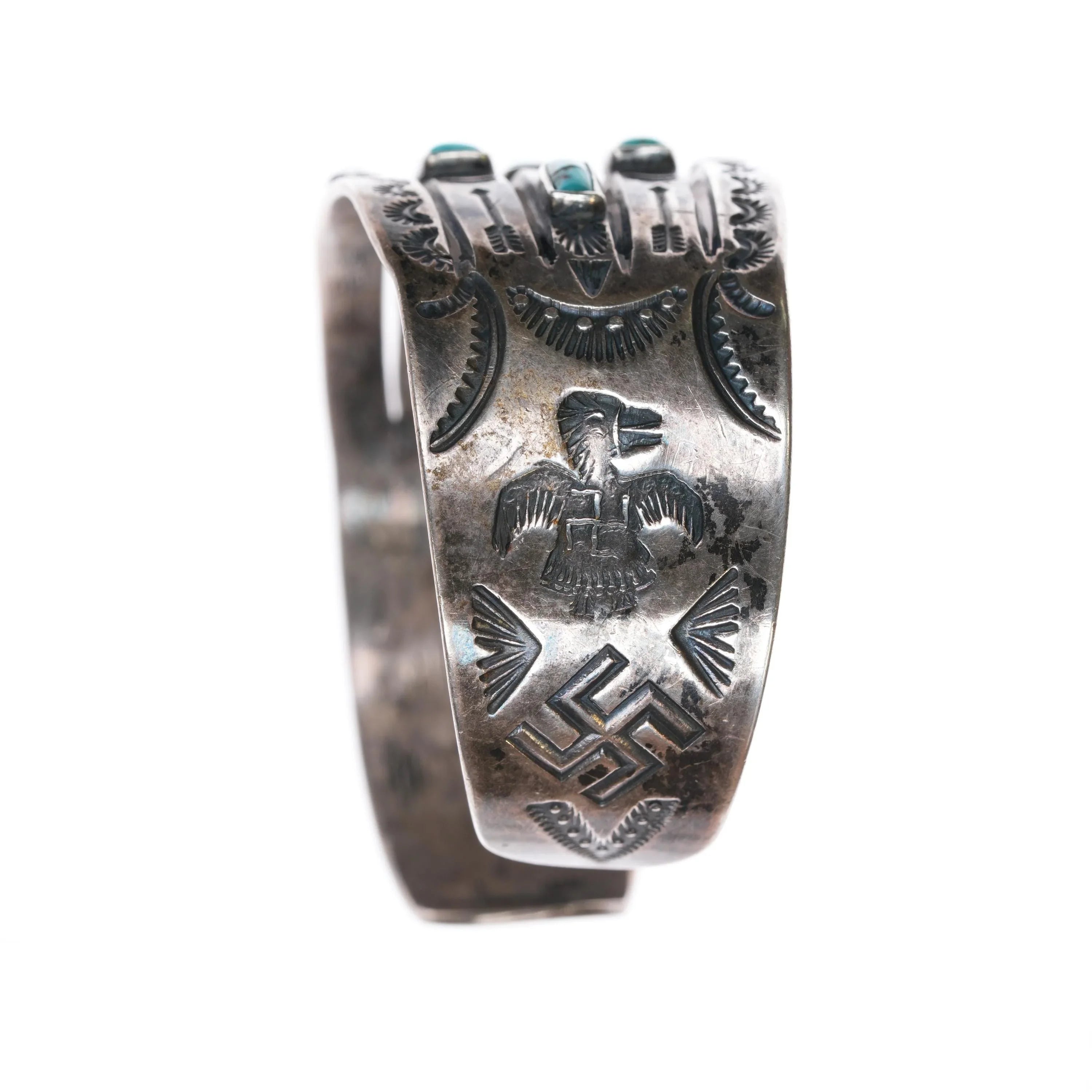 6.5" c1930 Navajo Fred Harvey Whirling Logs thungerbird turquoise cuff bracelet