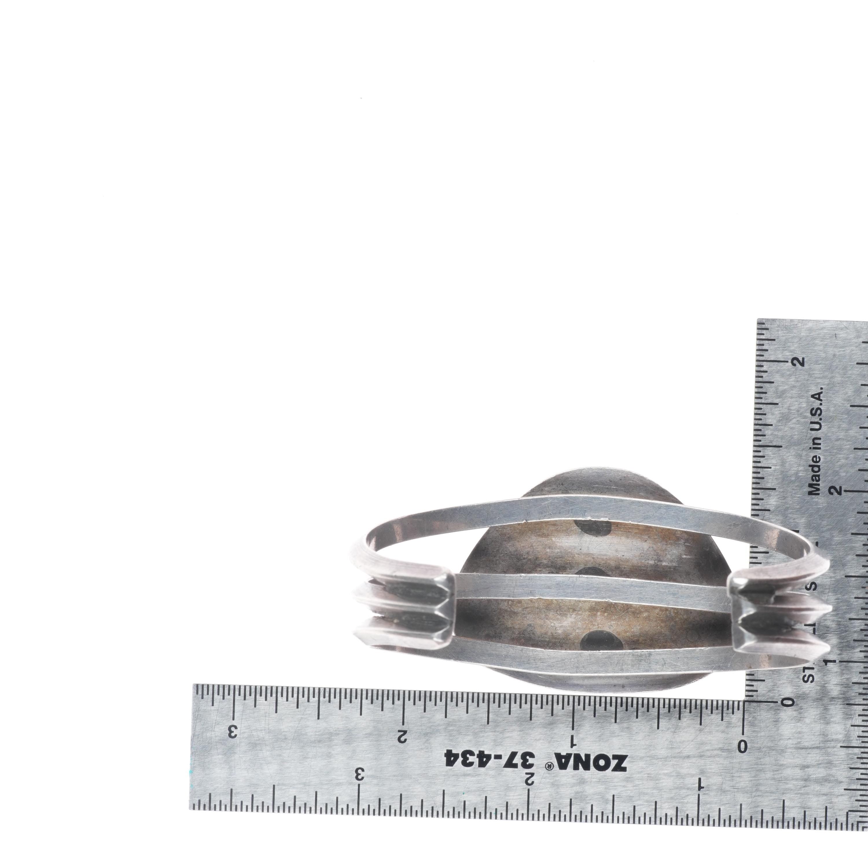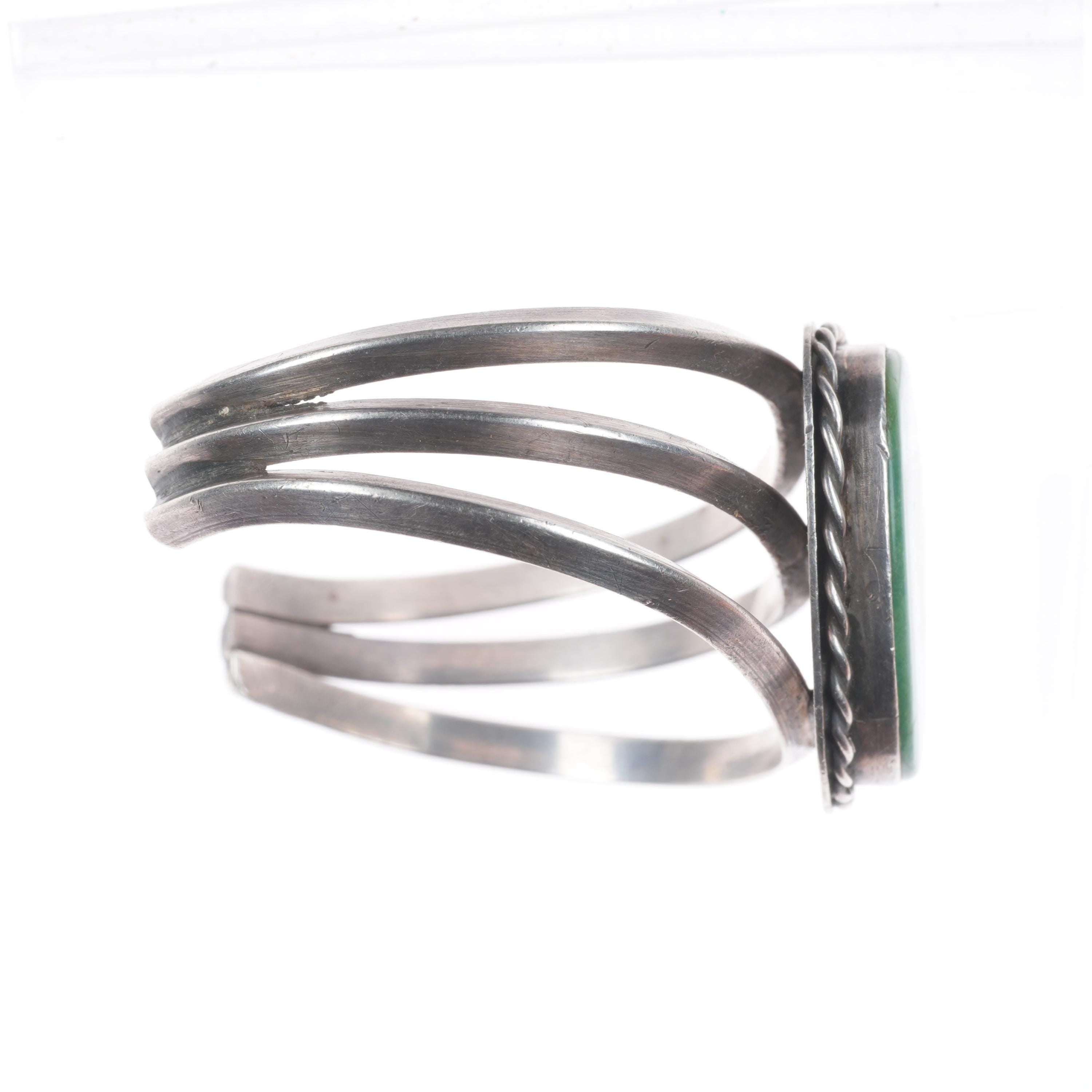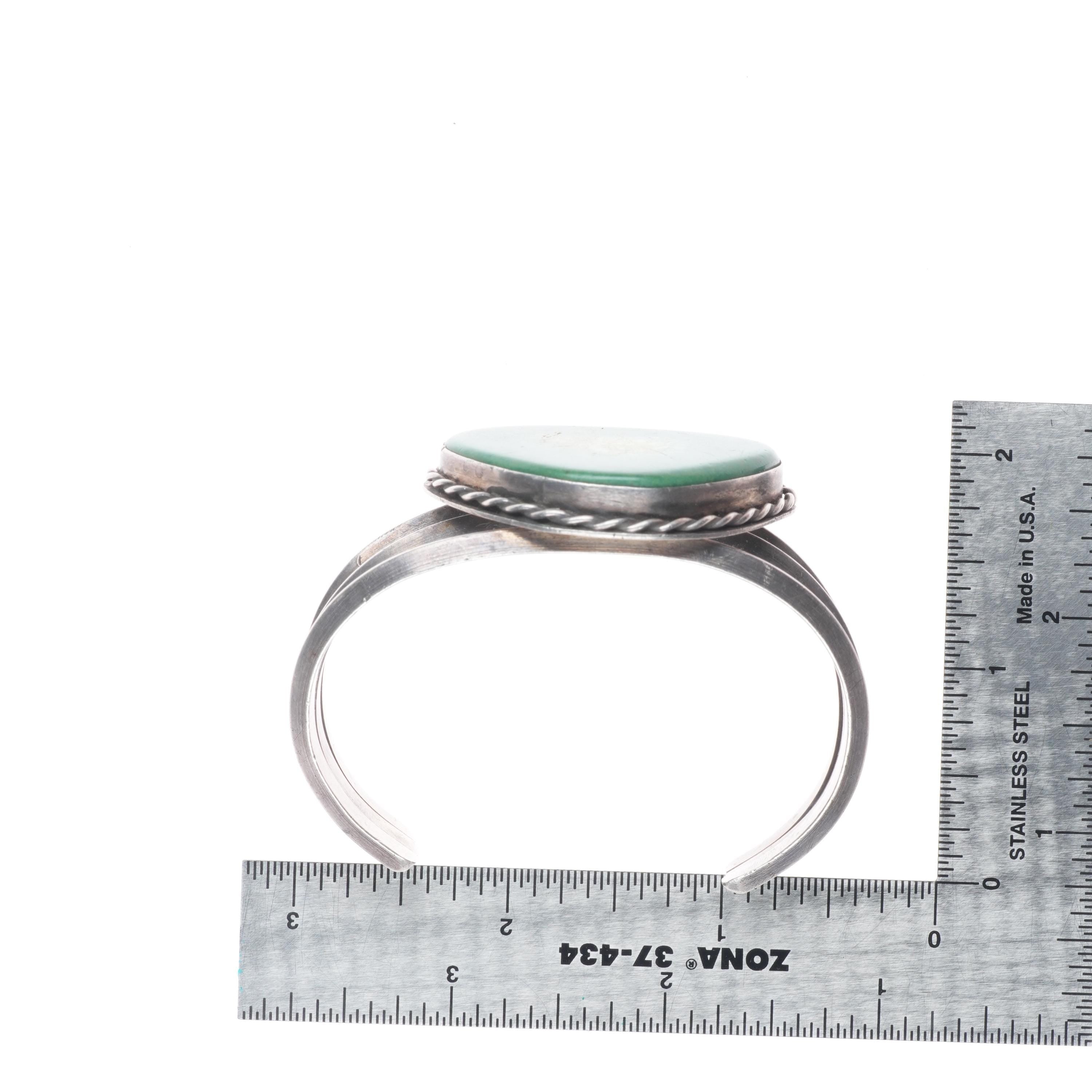 6.5" c1950‘s Navajo sterling silver green turquoise sturdy cuff bracelet. Tested and guaranteed solid sterling silver with weight and measurements in pictures. Circa mid 20th century with age appropriate wear..