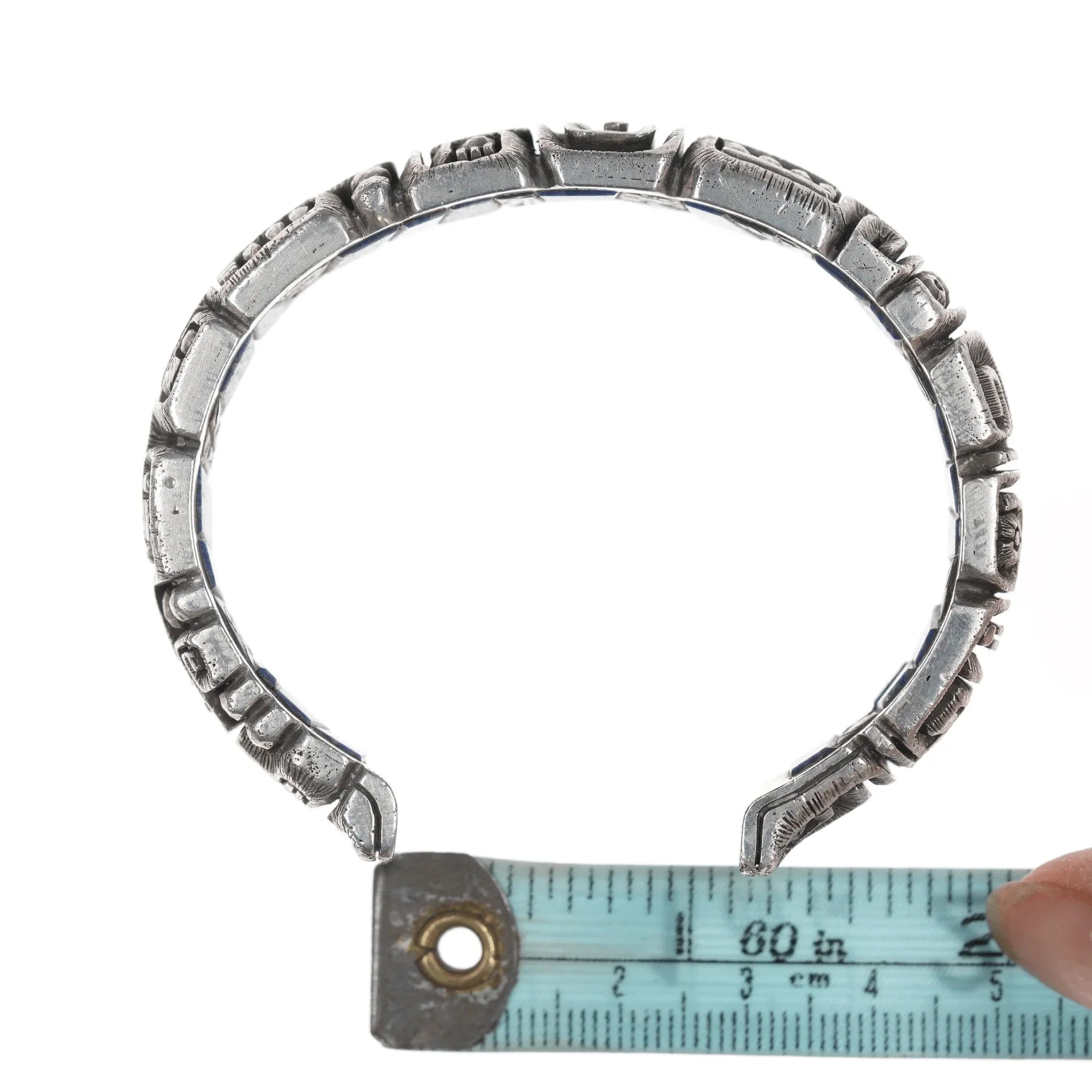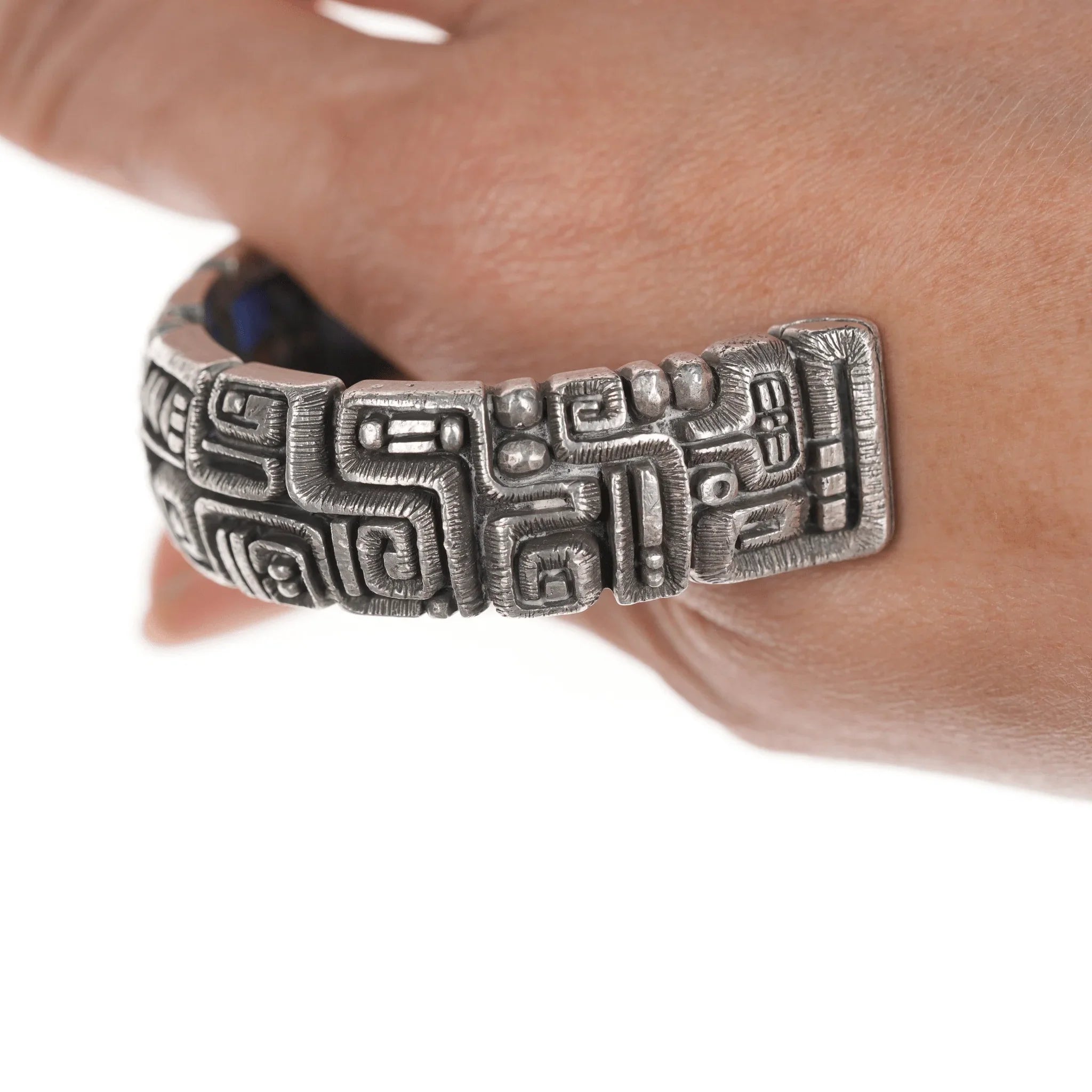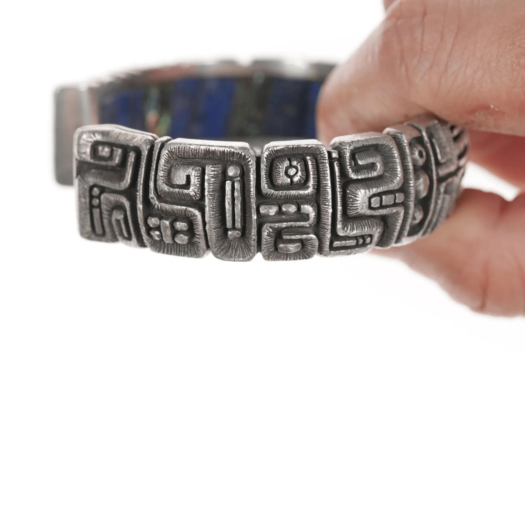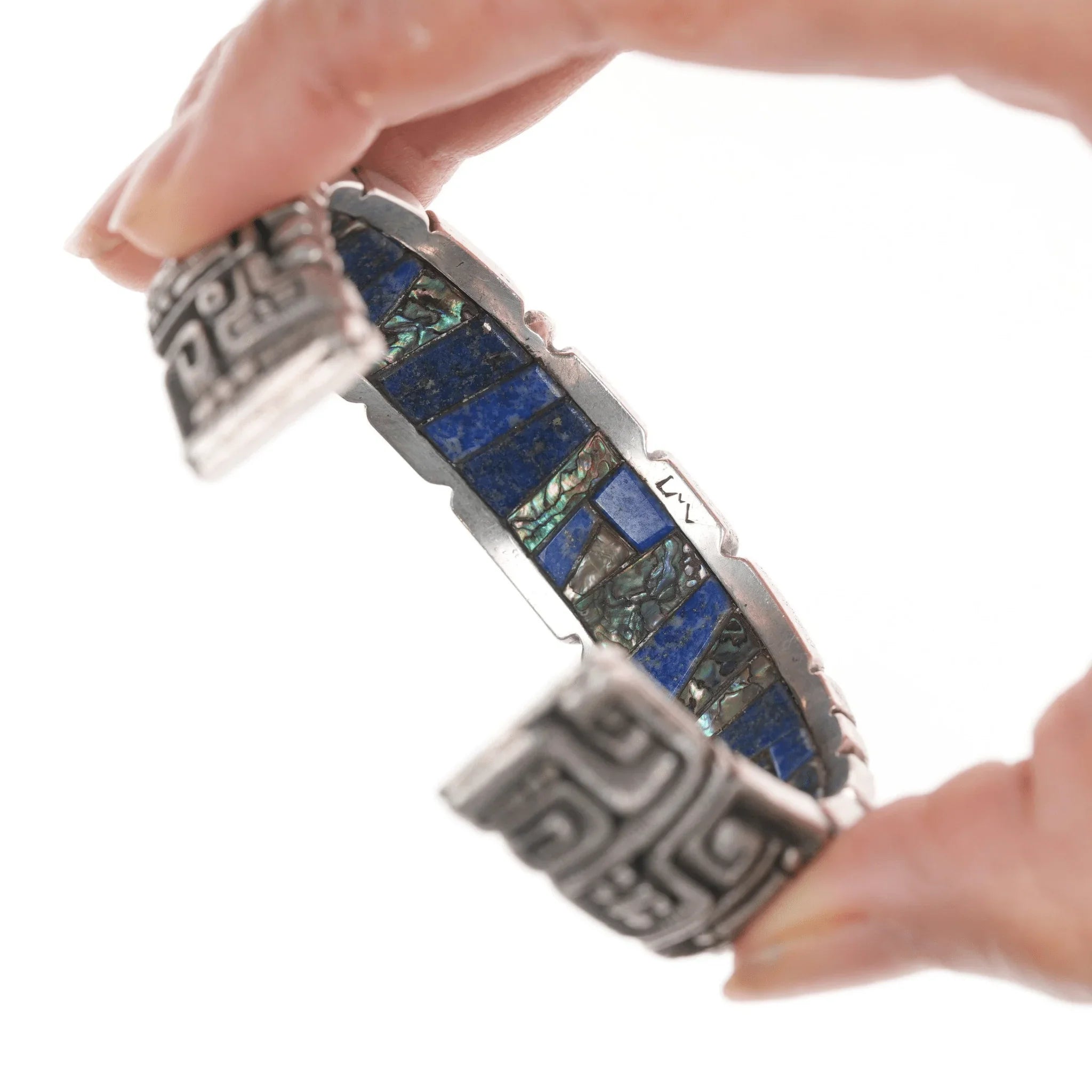 6.5" c1974 Luis Mojica Tufa Cast silver Lapis, Sodalite, and shell inlaid cuff bracelet, total masterpiece with no issues. Acquired with a ring dated 1974 by the same artist, selling the bracelet shown. Below is the information I recieved with it from it's original owner.