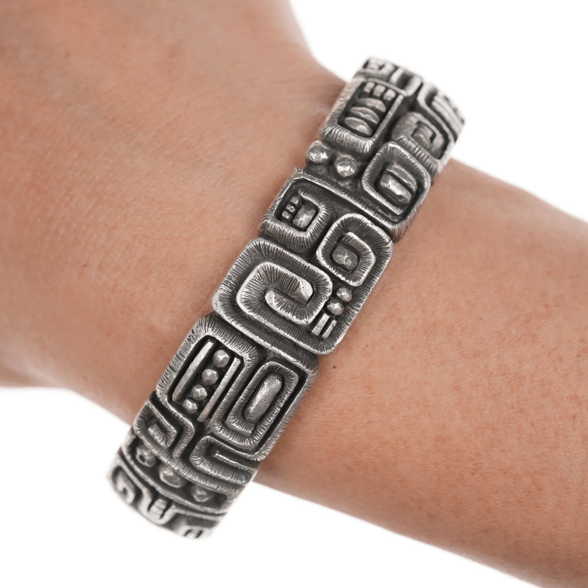 All precious metals are tested and guaranteed. A Native American jewelry piece referred to as "silver" or "ingot" is guaranteed to be at least 90% silver. I rarely use the word "sterling" when referring to older Native American silver or really any older silver jewelry as silver contents vary and "sterling" is 92.5% silver. No older jewelry is going to be exactly 92.5% silver, some a little over, some a little under. It wasn't an exact thing with handmade jewelry. I've seen thousands of pieces xrf'd to prove this. Bracelets are photographed on a 6" women's wrist.