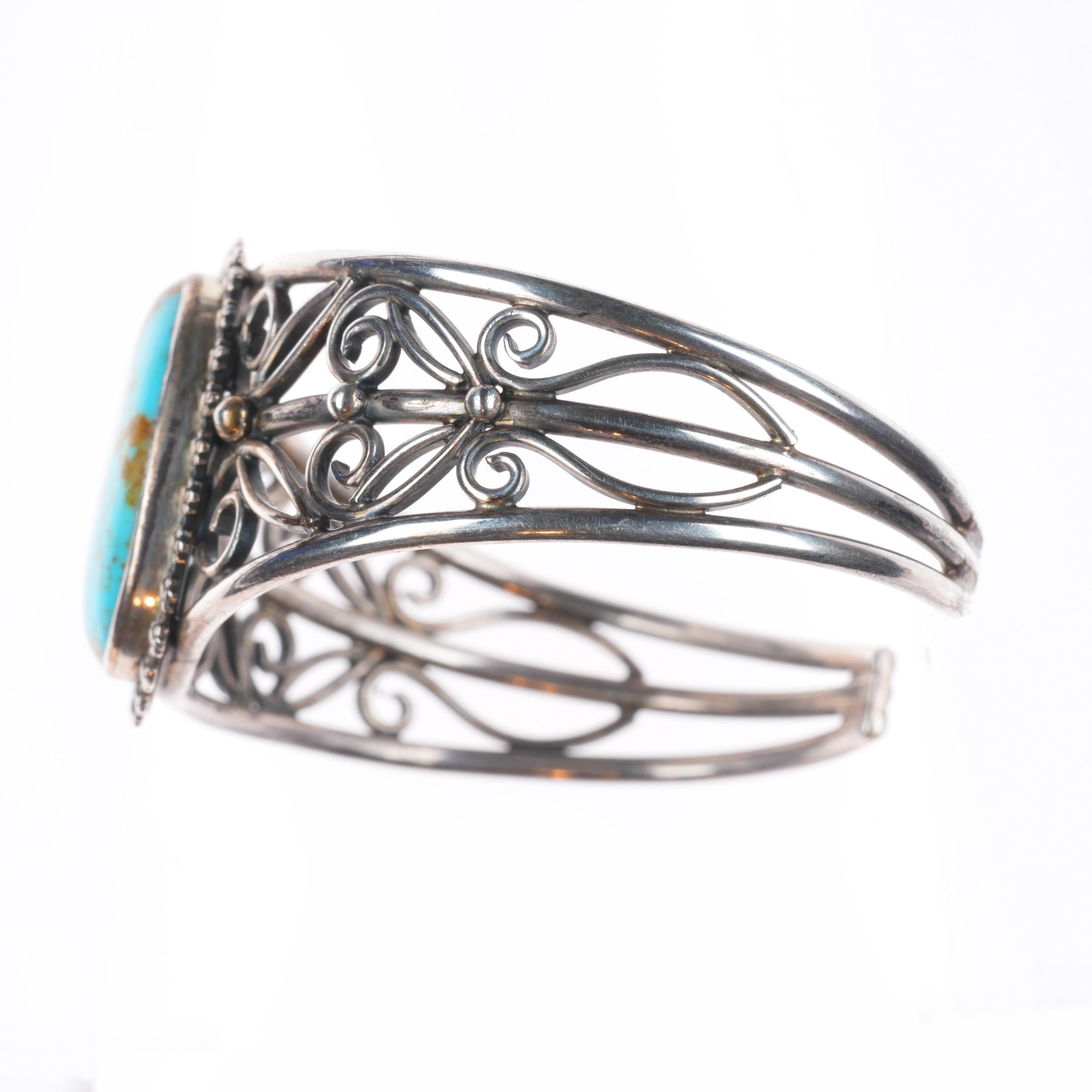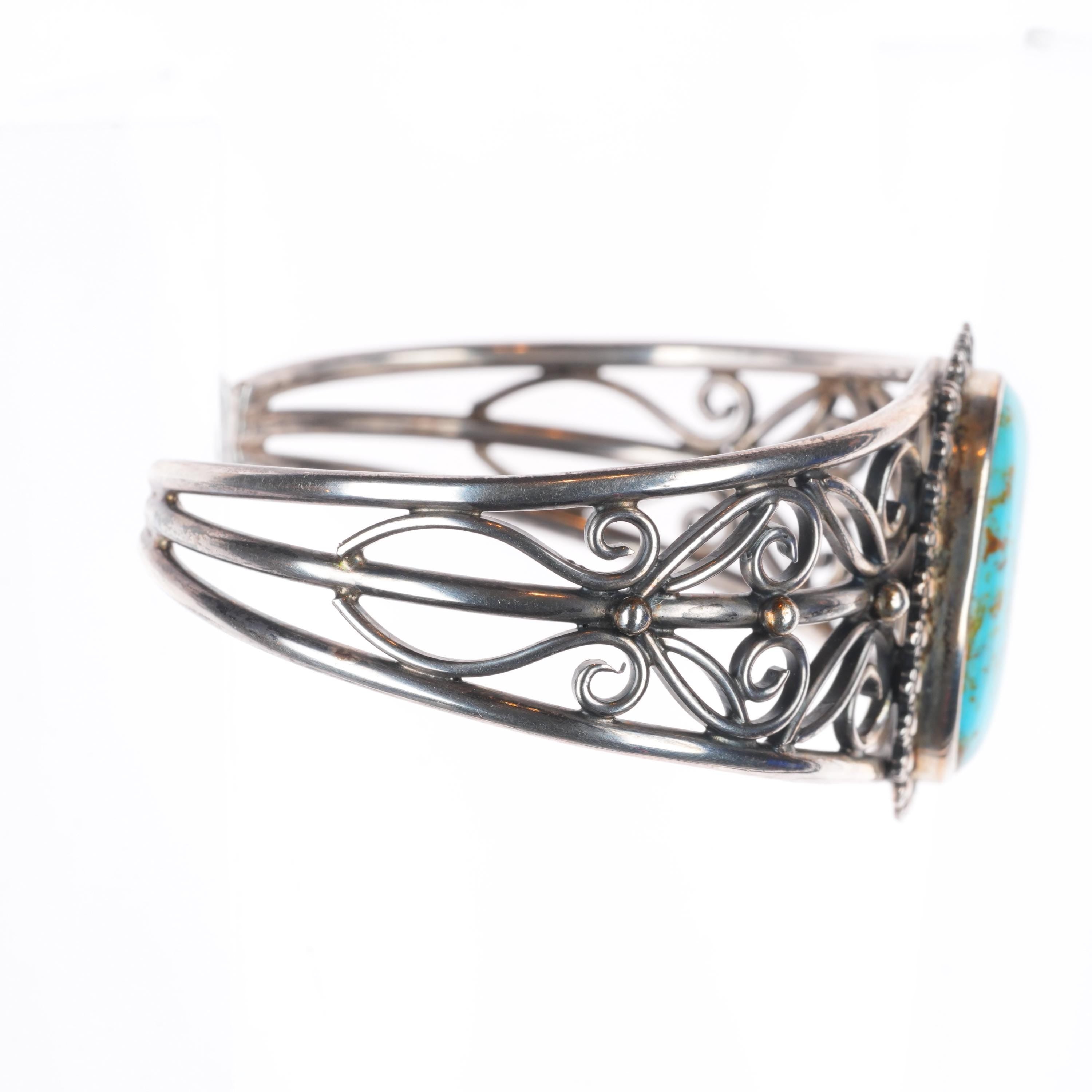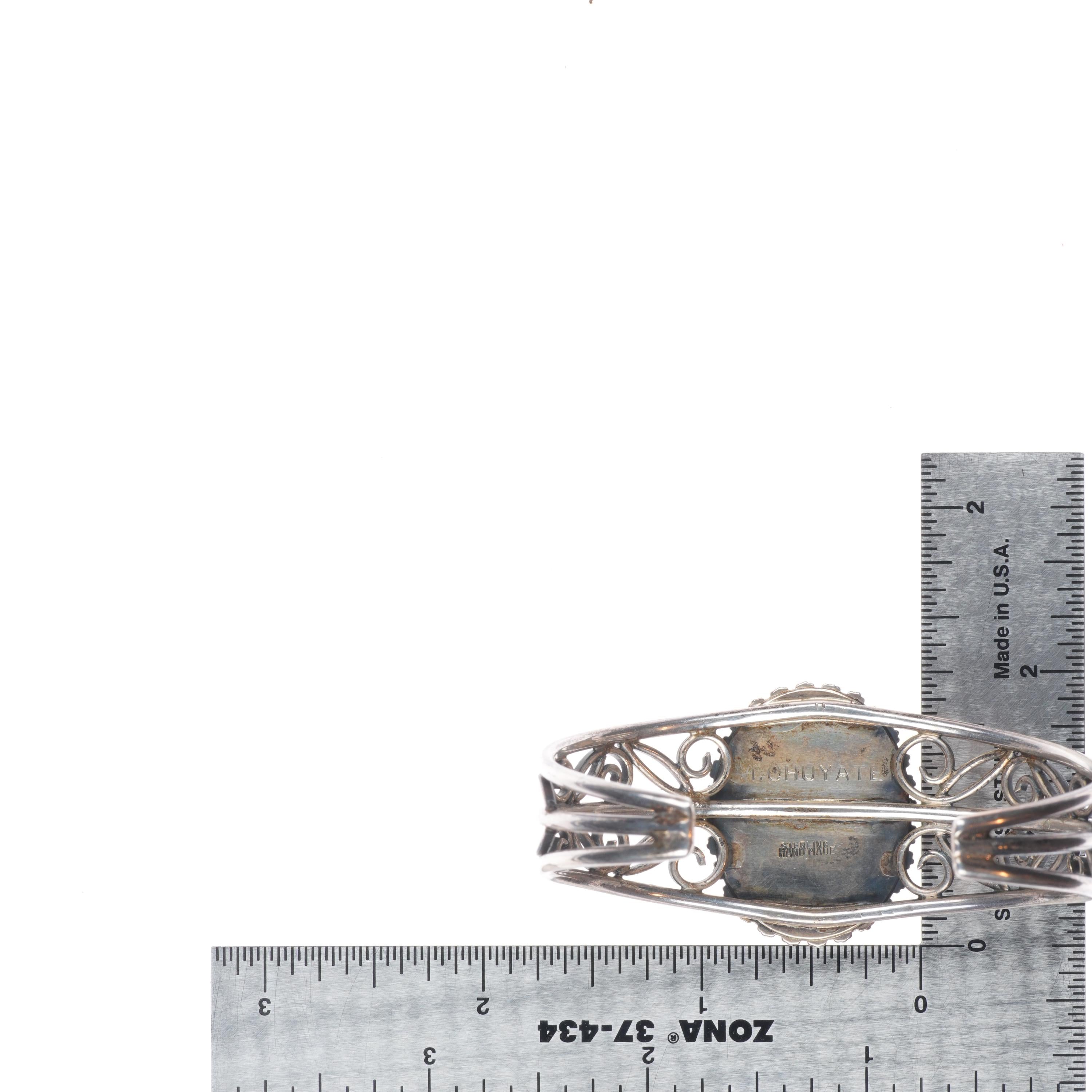 6.5" Miriam Chuyate - Hopi-Tewa twisted sterling silver turquoise cuff bracelet. Tested and guaranteed solid sterling silver with weight and measurements in pictures. Circa third quarter of the 20th century. Fits up to a 6.5" wrist.