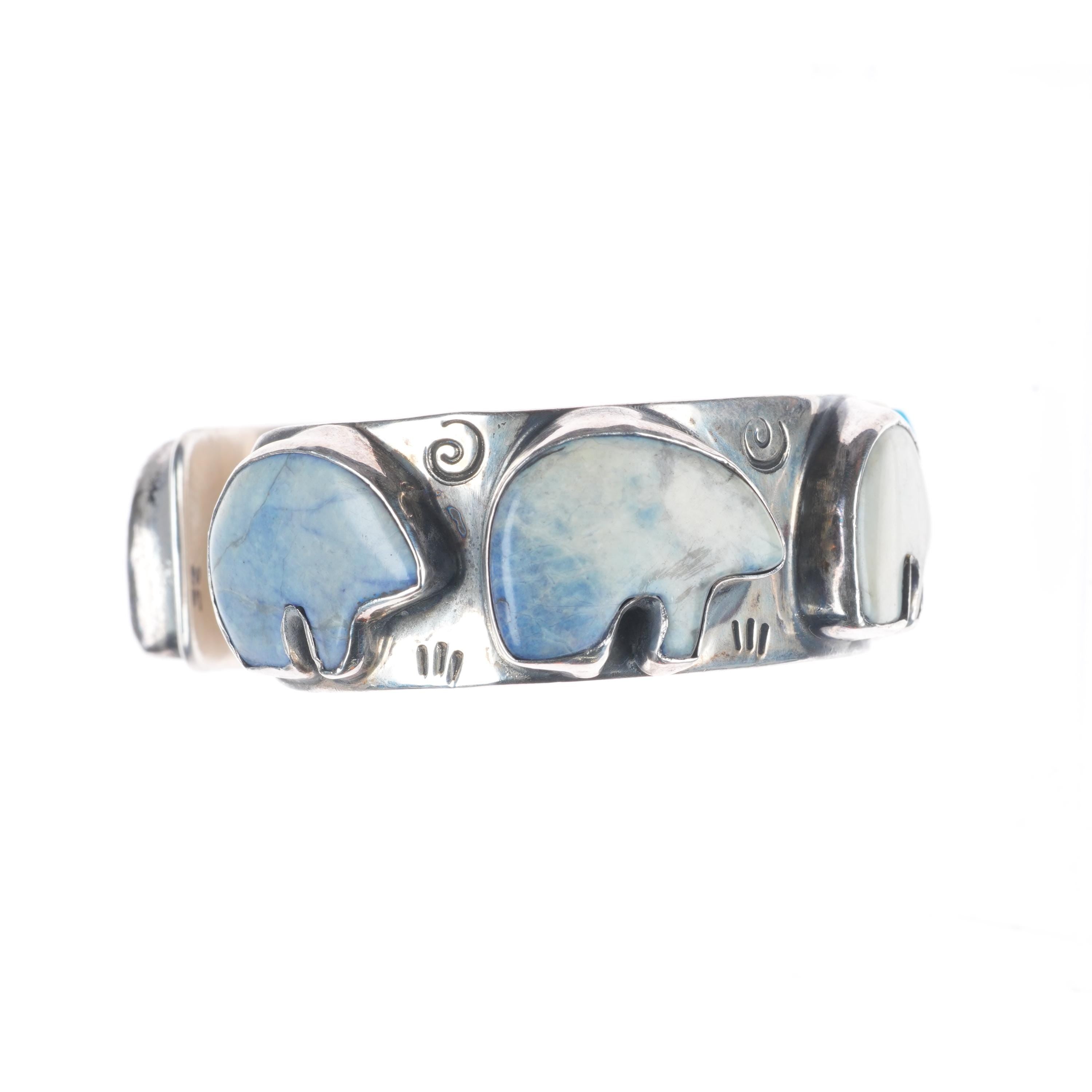 6.6" Victoria Masse Stoll sterling silver turquoise/jasper bears cuff bracelet. Tested and guaranteed solid sterling silver with weight and measurements in pictures. Great condition with age appropriate wear, circa last quarter of the 20th century. I did not identify the stones the bears are carved from, off white with a blueish tint/matrix. The scale pic is off, it's more like 65-70 grams.