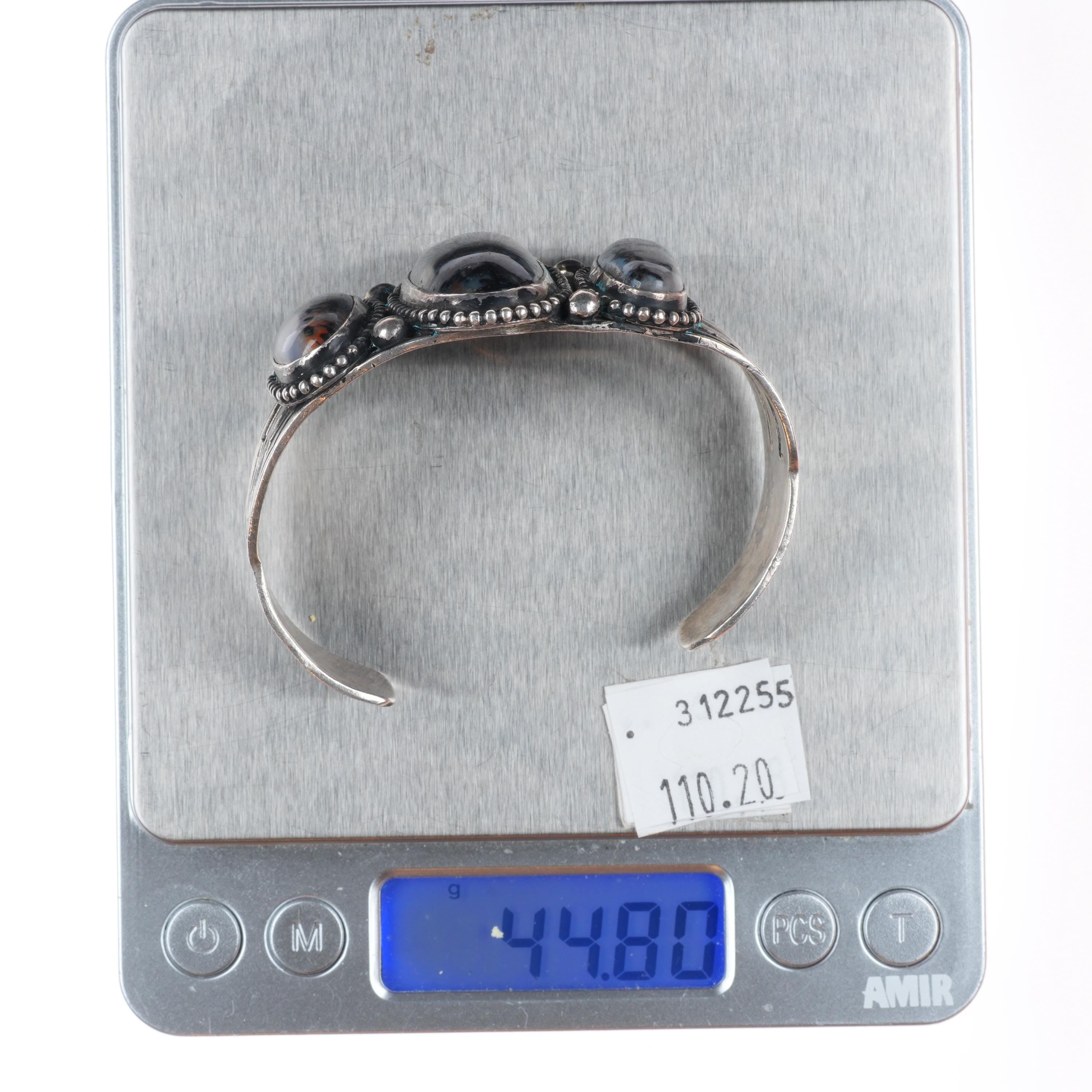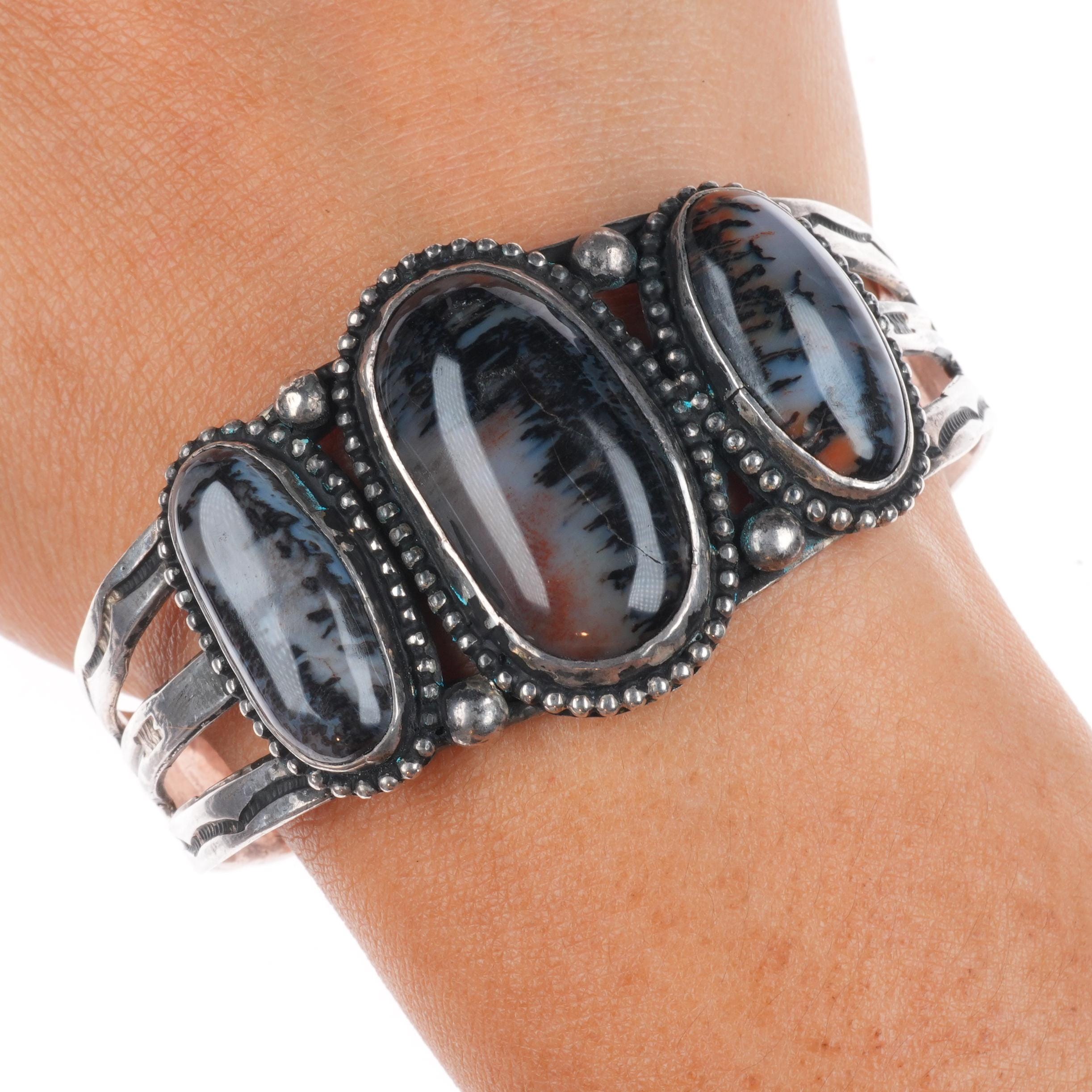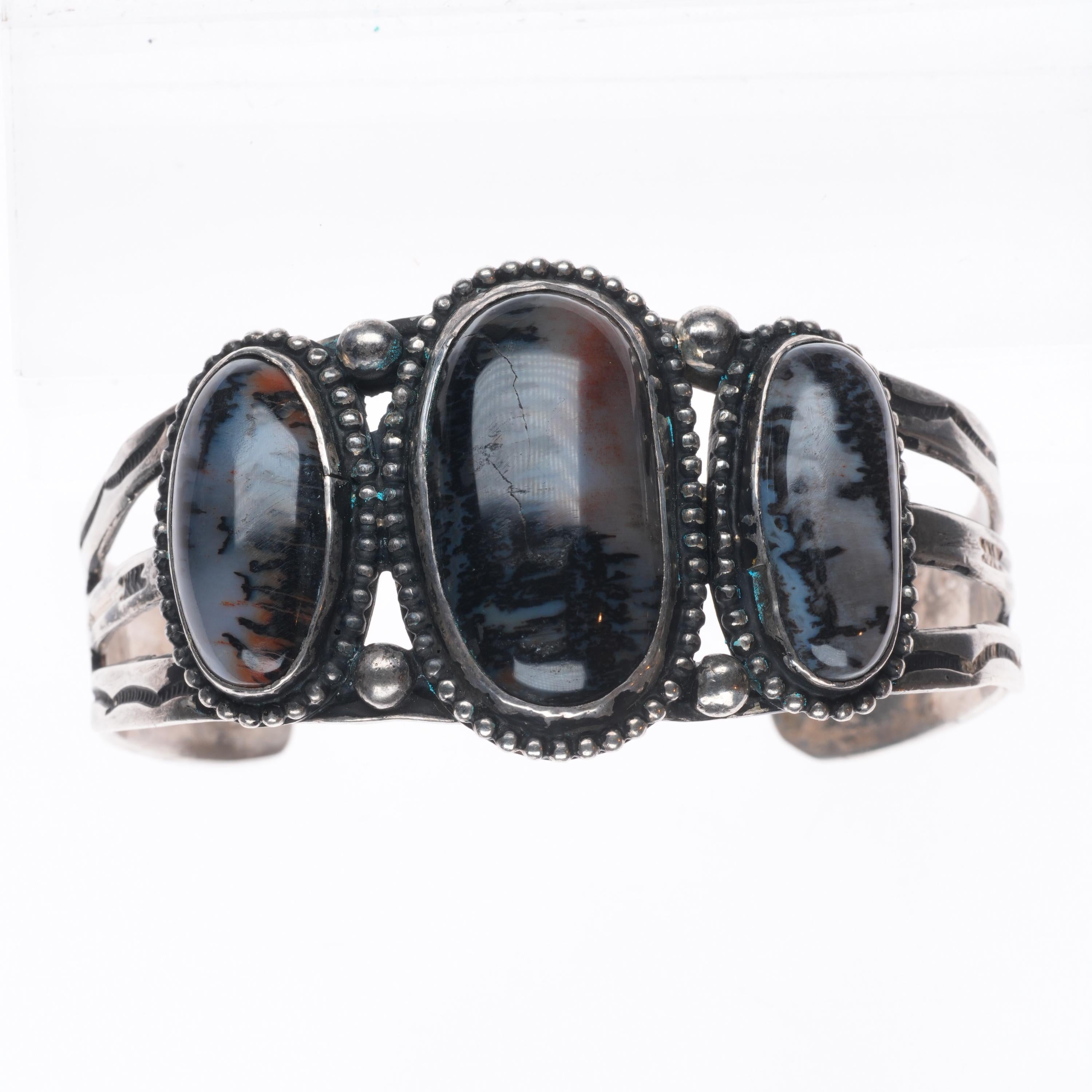 6.6" Vintage Navajo sterling silver Petrified wood agate 3 stone cuff bracelet. Tested and guaranteed solid sterling silver with weight and measurements in pictures. Circa second quarter of the 20th century to mid 20th century with age appropriate wear..