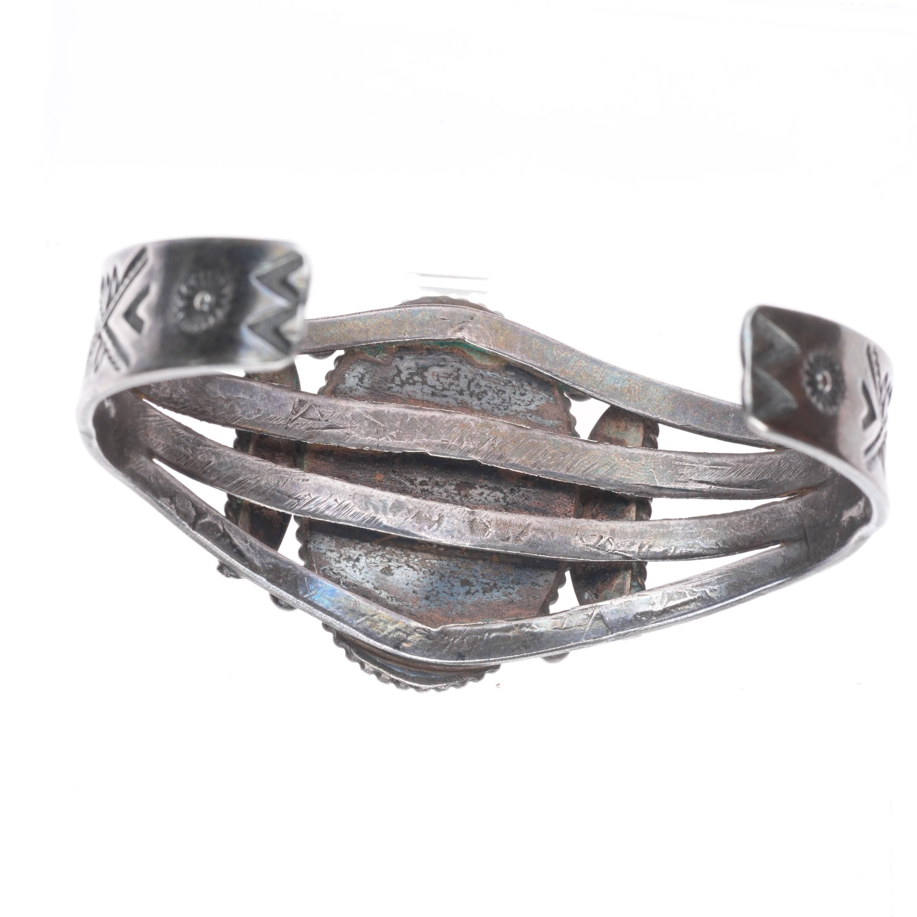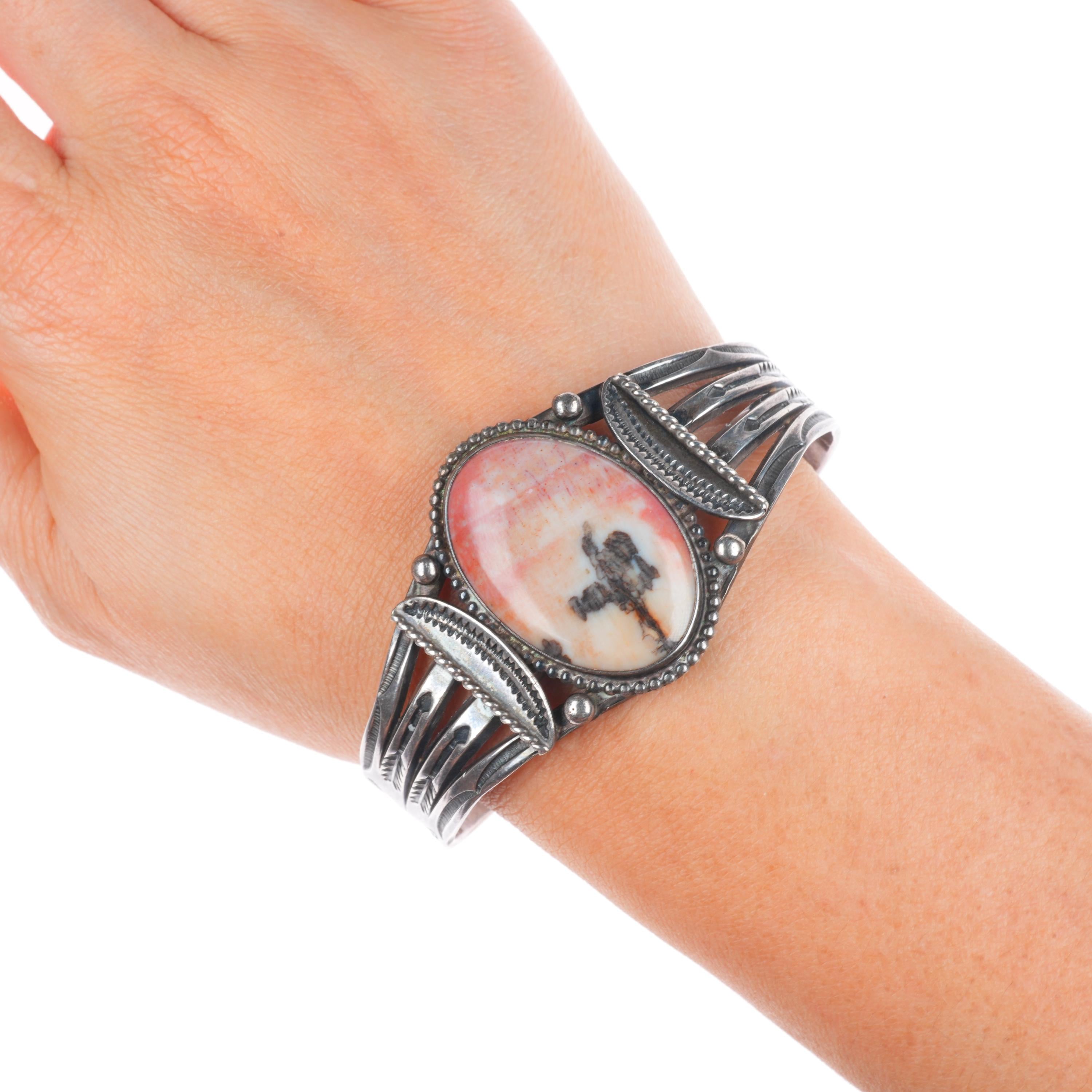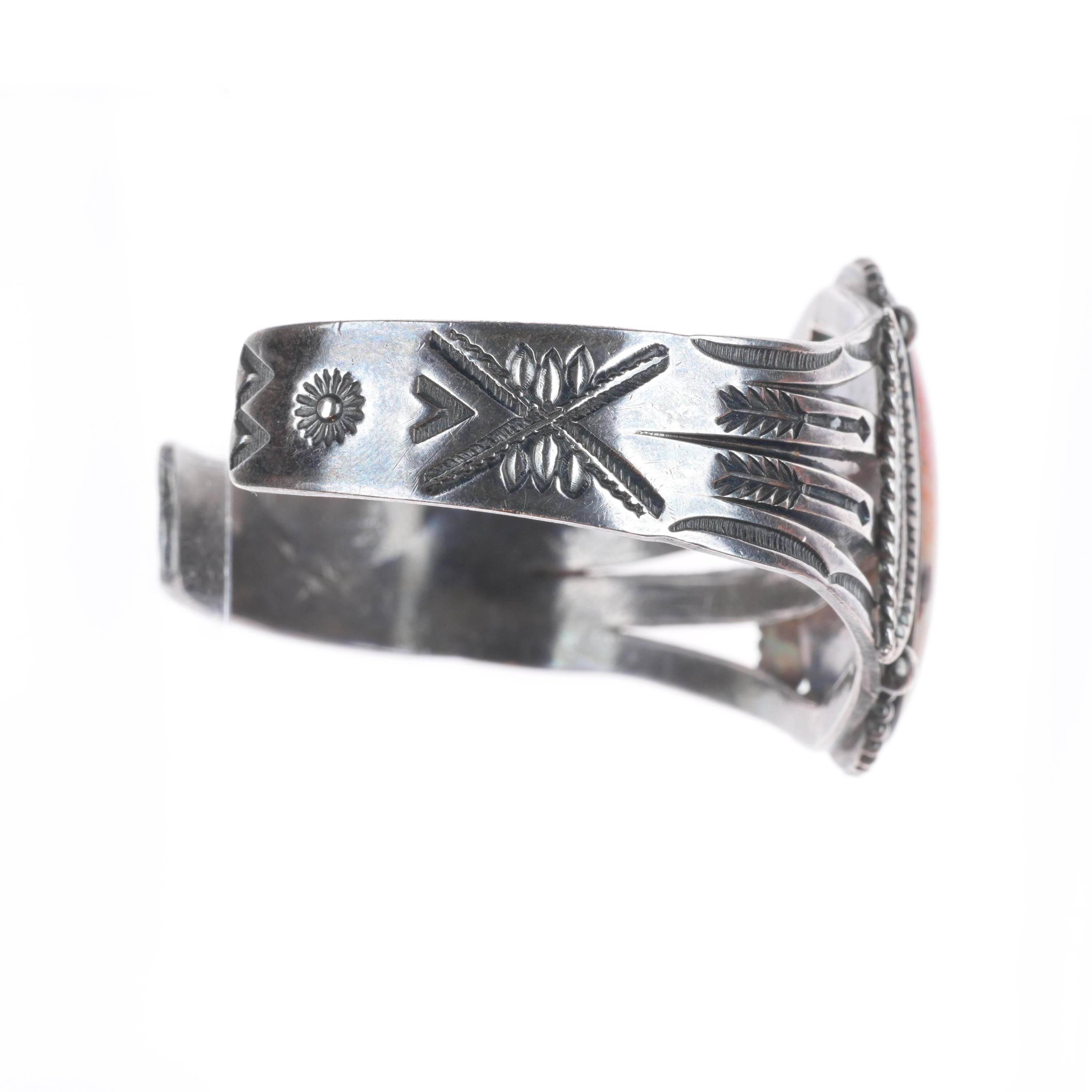 6.8" 30's-40's Vintage Navajo sterling silver petrified wood cuff bracelet. Tested and guaranteed solid sterling silver with weight and measurements in pictures. Overall expected wear circa second quarter of the 20th century.