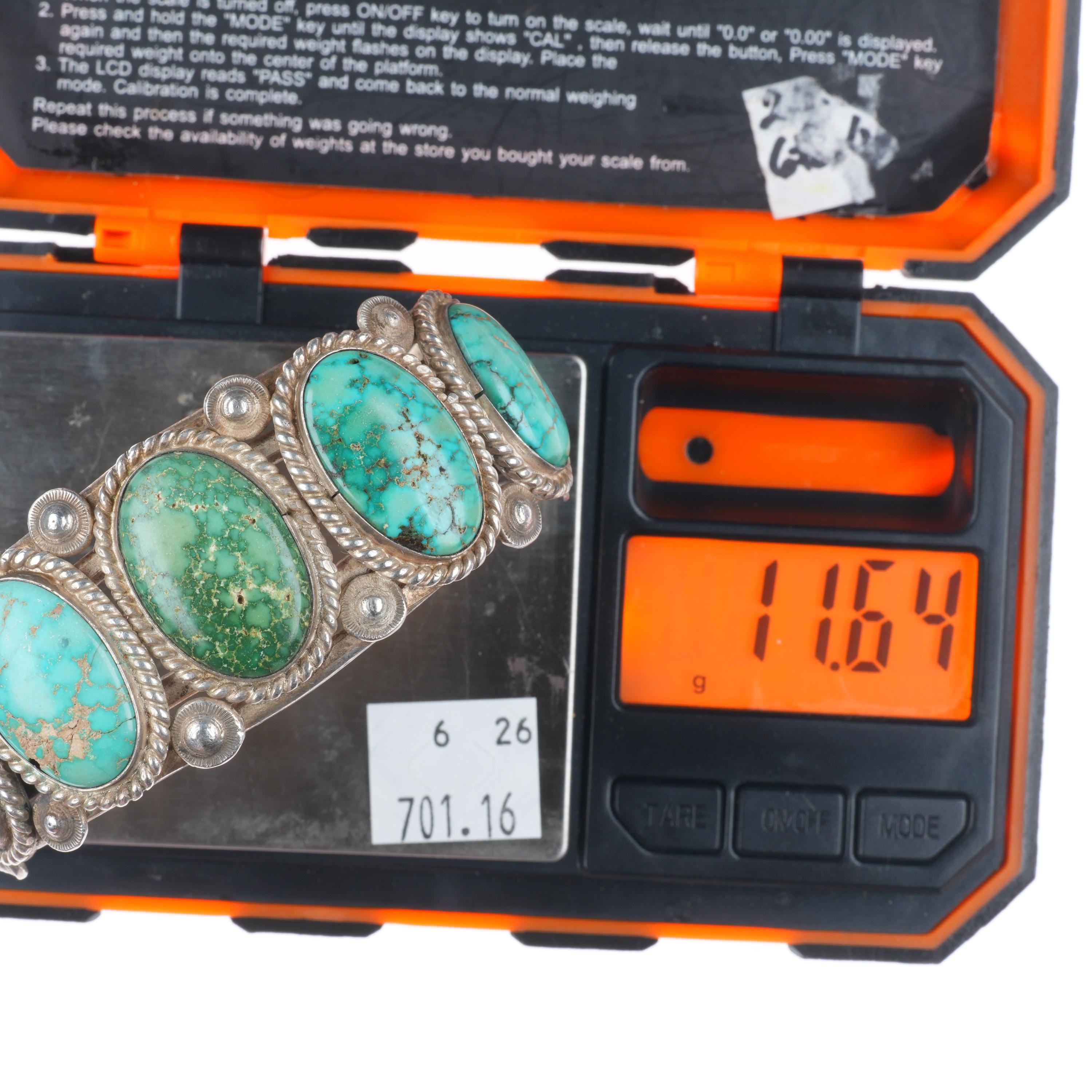 6.9" 30's-40's Vintage Navajo sterling silver large turquoise row cuff bracelet . Beautiful natural turquoise with nice matrix. Tested and guaranteed solid sterling silver with weight and measurements in pictures. Overall expected wear with apparent circa second quarter of the 20th century with some fractures in stones. All stones secure. Weight is 126 grams.