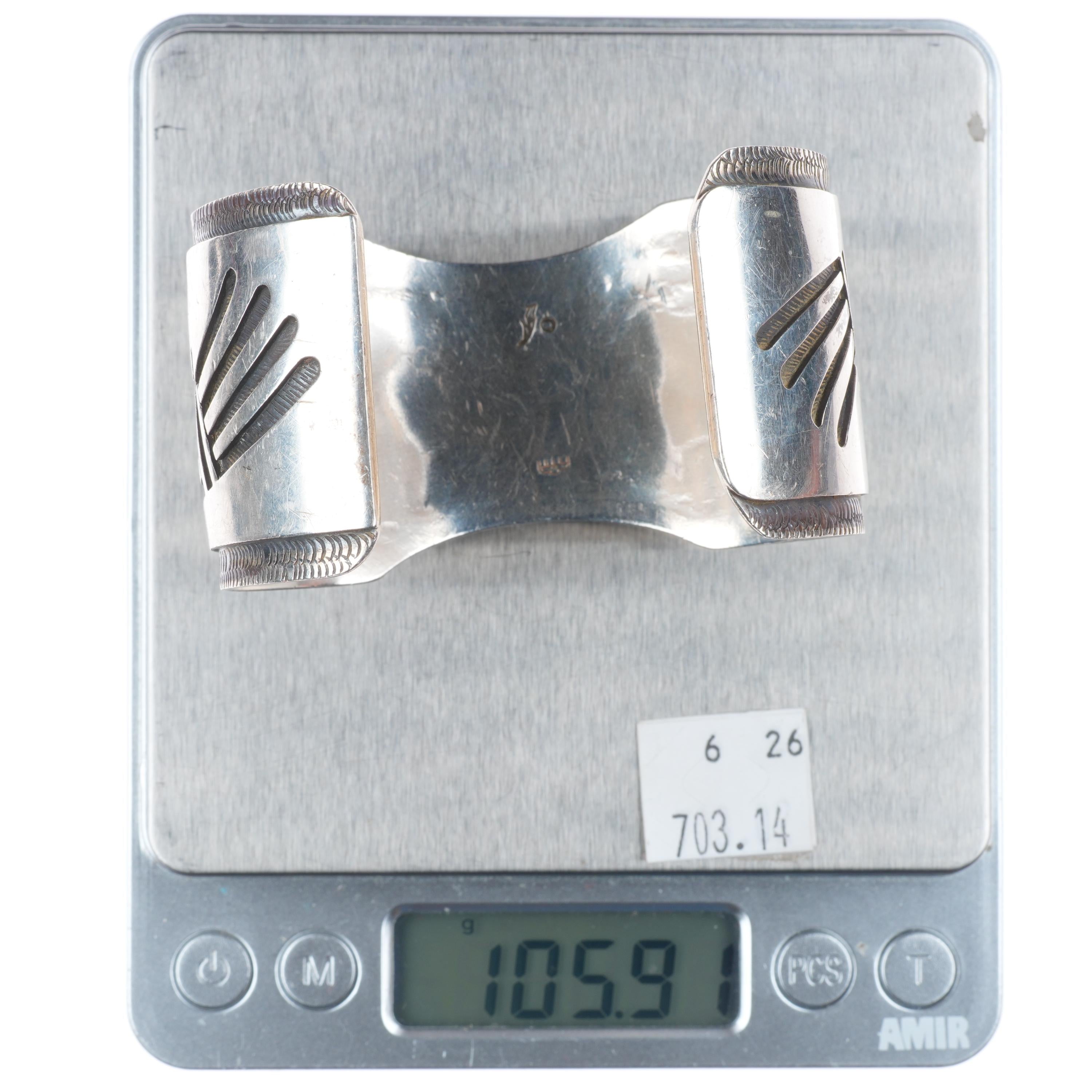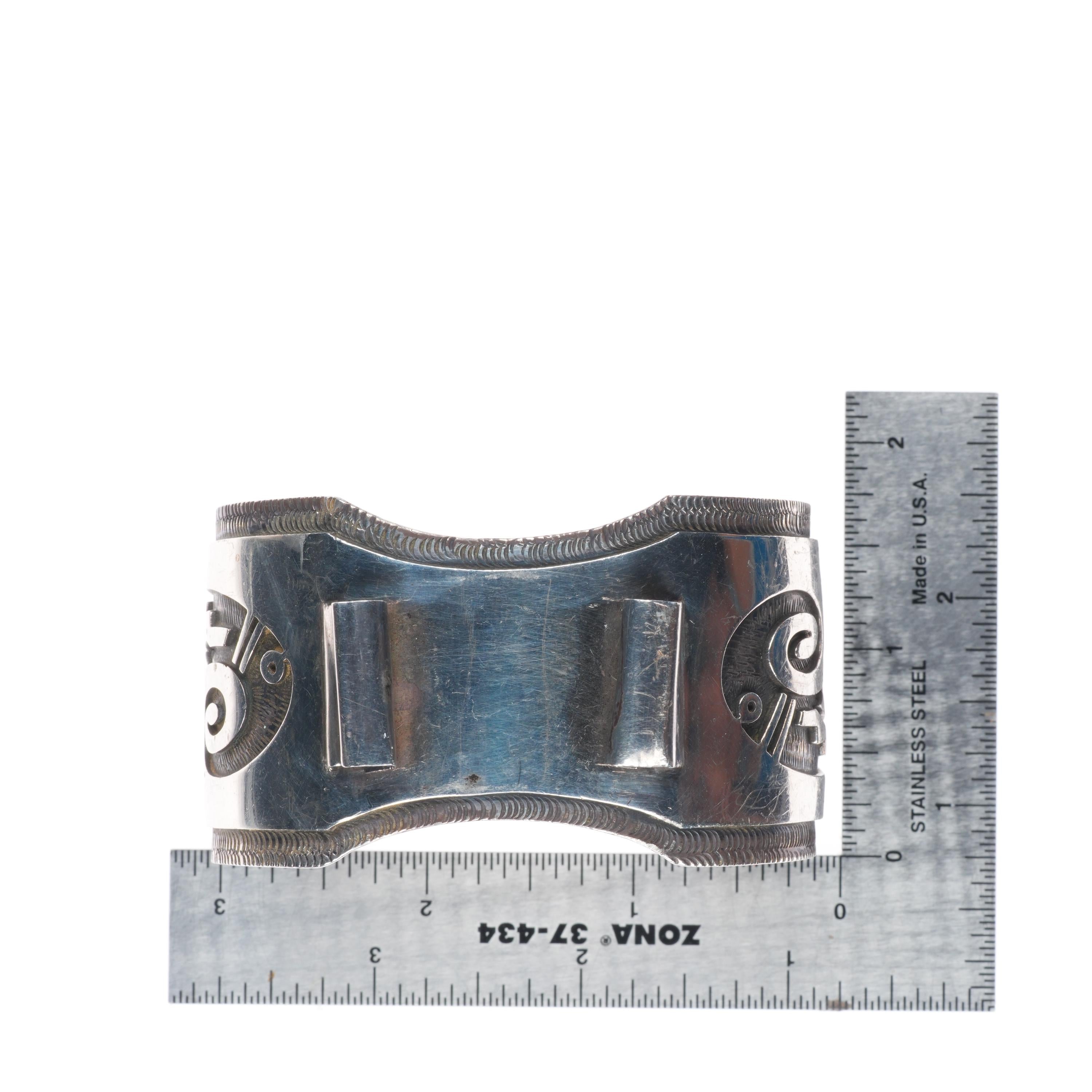 7.4" Victor Coochwytewa Hopi overlay large watch cuff bracelet sterling silver.4. Selling the watch cuff shown with weight and measurement in pictures. Fits a 7.4" wrist, circa fourth quarter of the 20th century with Kopavi shop (established 1976) hallmark.