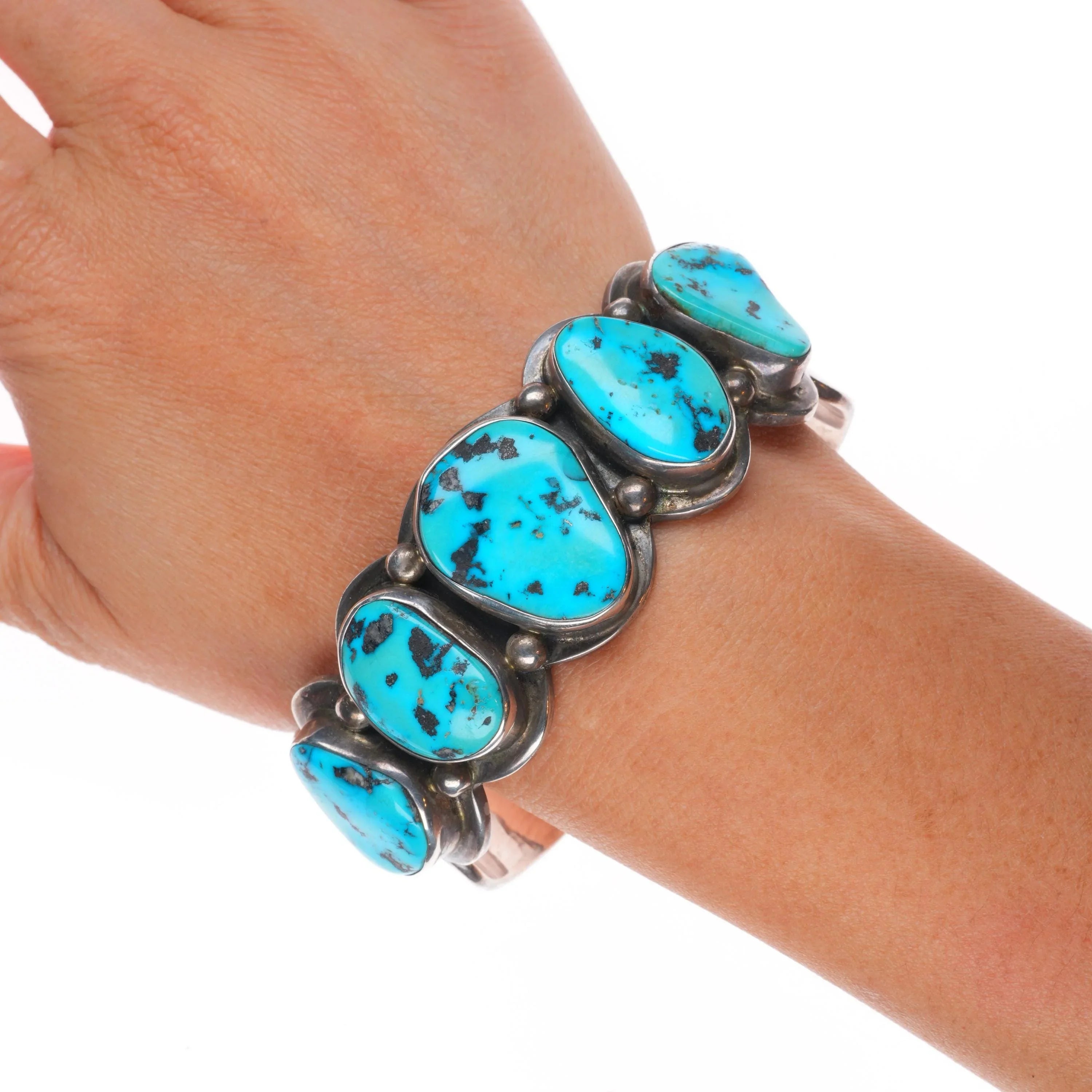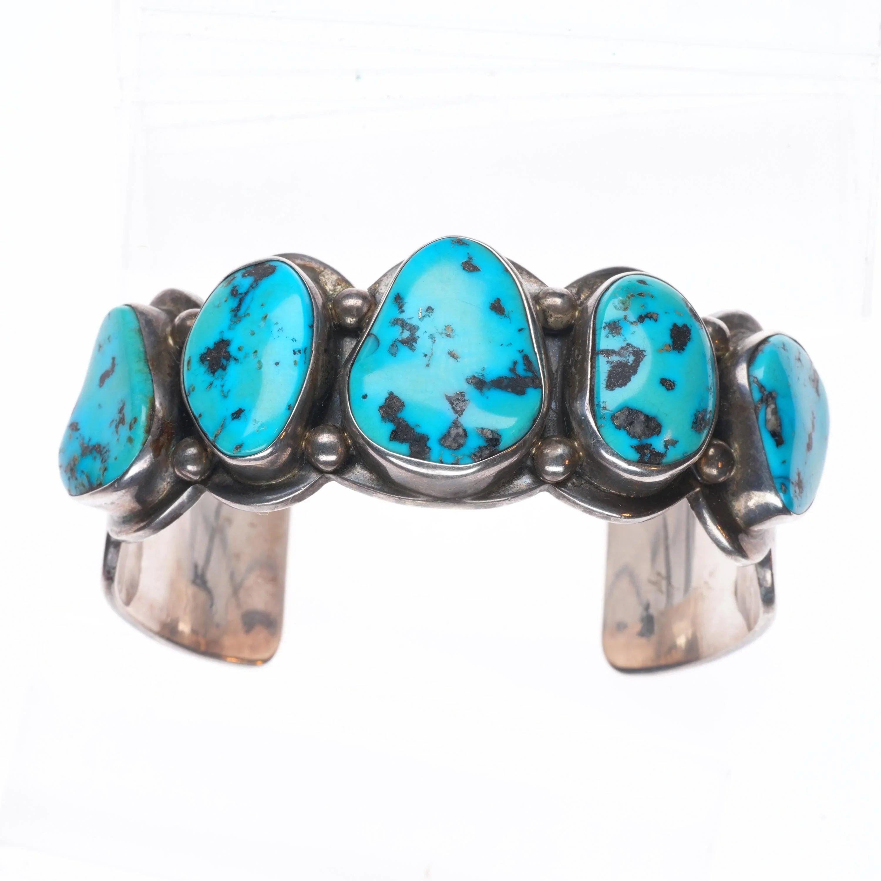 7" Peter Johnson Navajo sterling silver large turquoise row cuff bracelet. Tested and guaranteed solid sterling silver with weight and measurements in pictures. No damage or significant wear, circa third quarter of the 20th century.