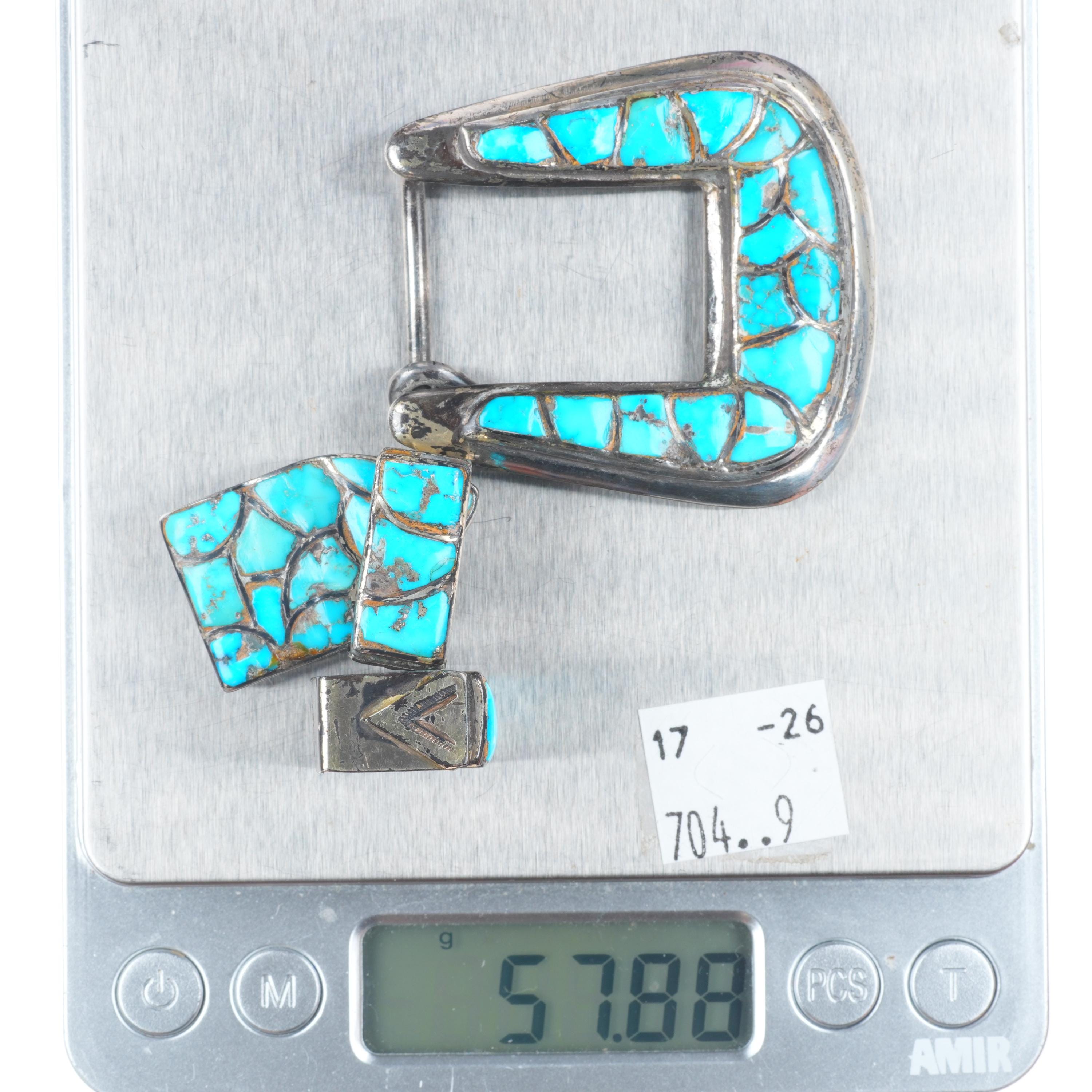 c1950 Vintage Navajo sterling silver inlaid turquoise ranger belt buckle set. Tested and guaranteed solid sterling silver, weight and measurements in pictures. Fully functional. All items will likely have some age appropriate/expected wear, the older they are the more wear they should have. Circa mid 20th century.. Fits up to a .75" belt.