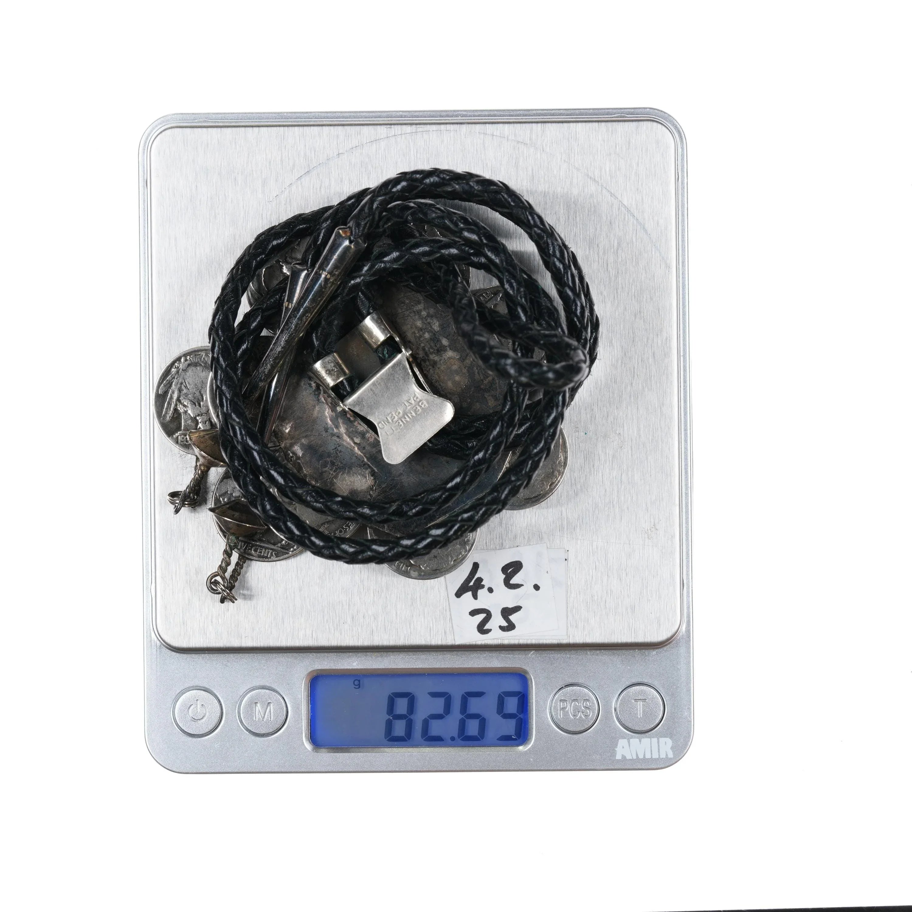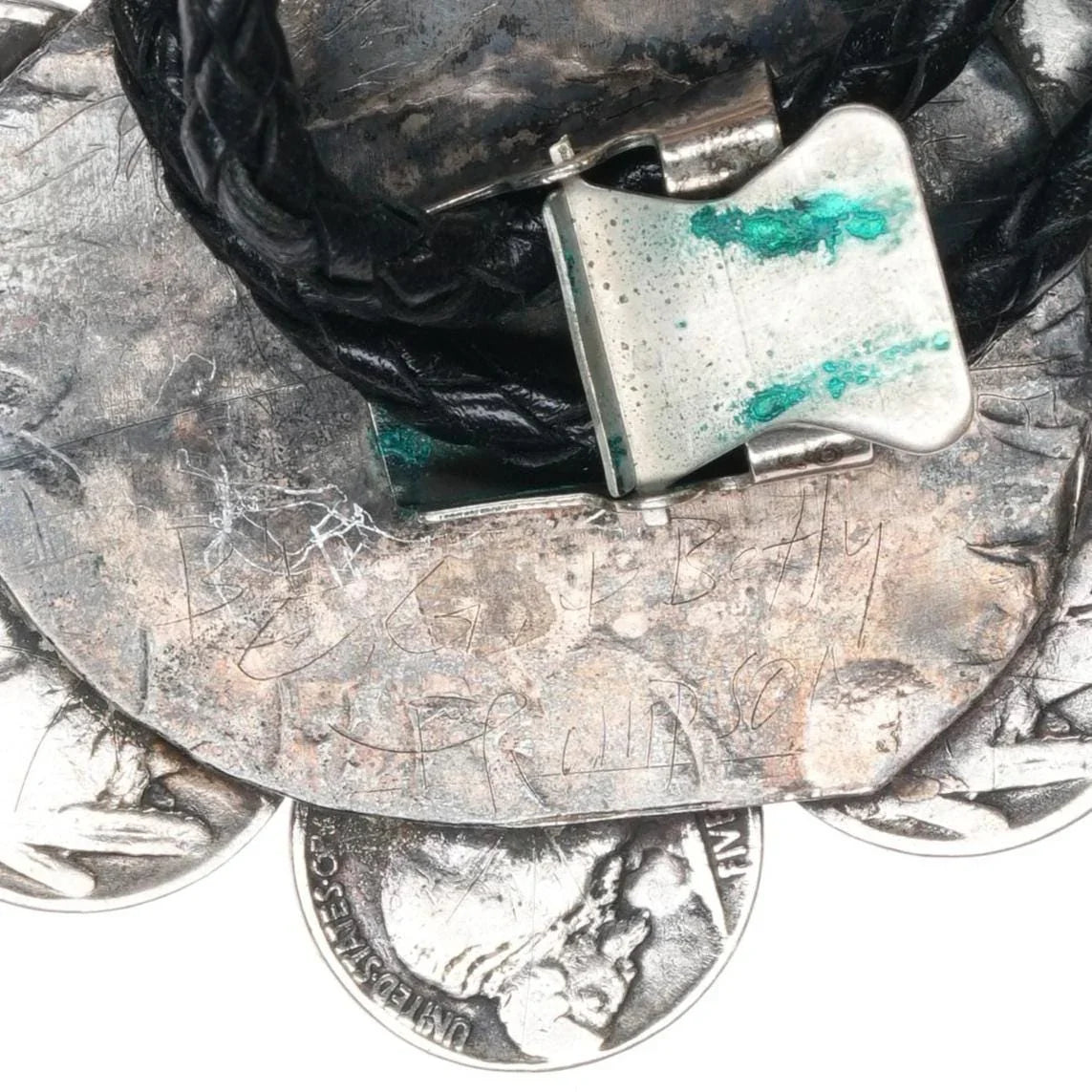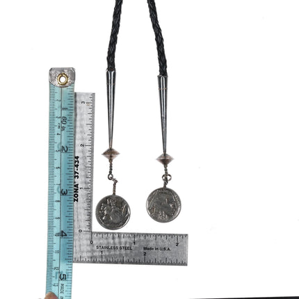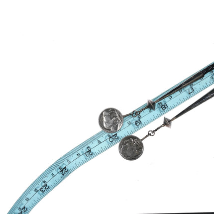c1970 Sterling buffalo nickle Native American turquoise bolo tie. Solid sterling silver slide and tips, the nickels are not sterling but the rest is. Weight and measurements in pics. 40" long. Illegible writing on back.